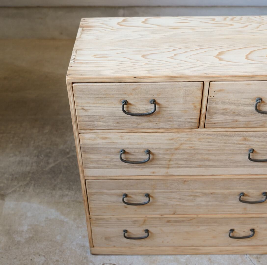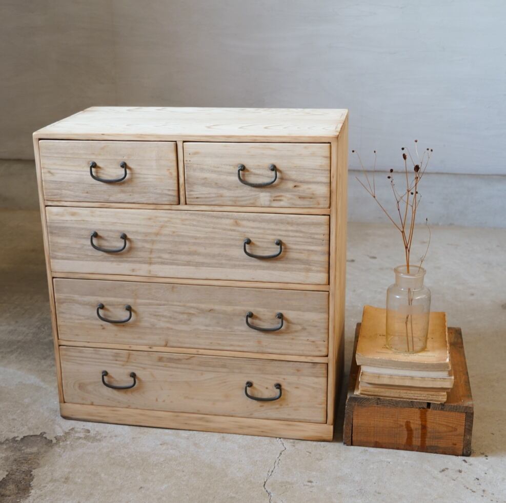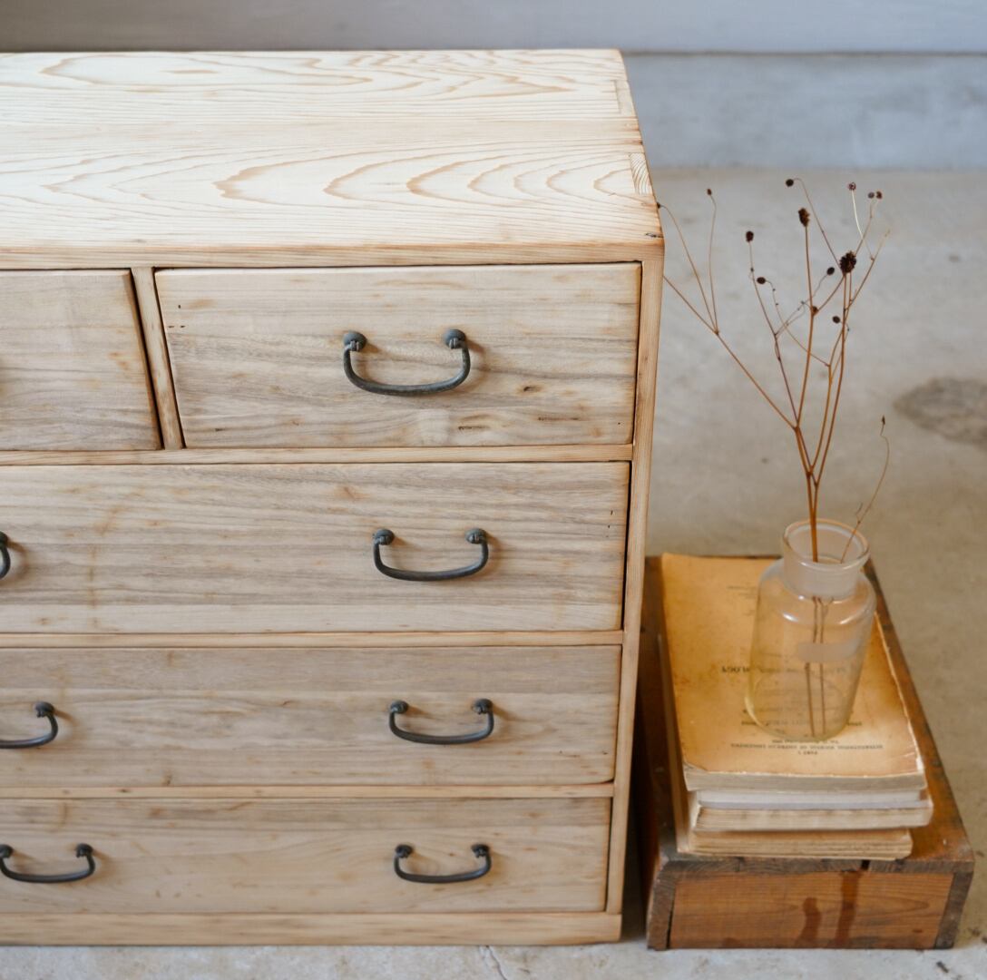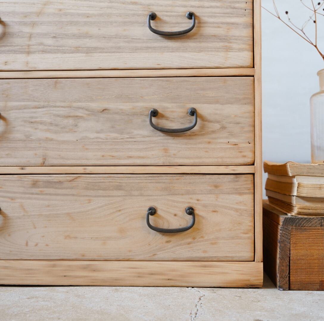 無垢材のナチュラルな木味と並んだ金属取手が美しい5杯の引き出しです。