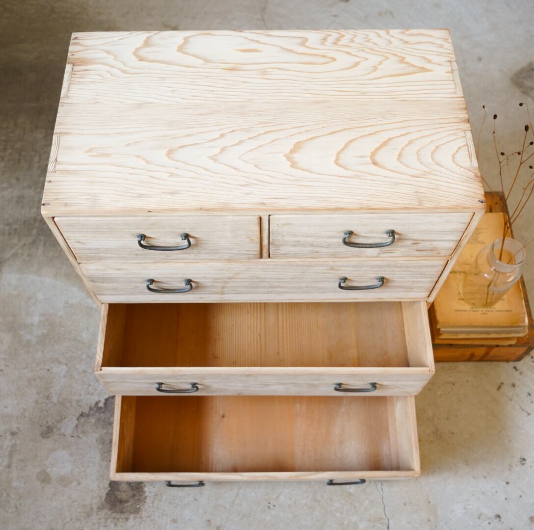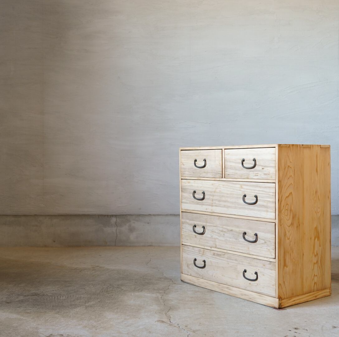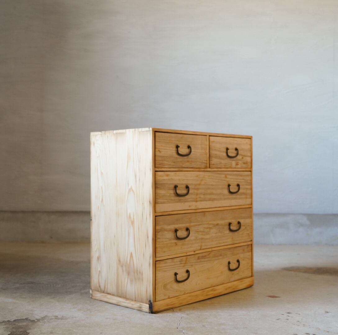 無垢材のナチュラルな木味と並んだ金属取手が美しい5杯の引き出しです。