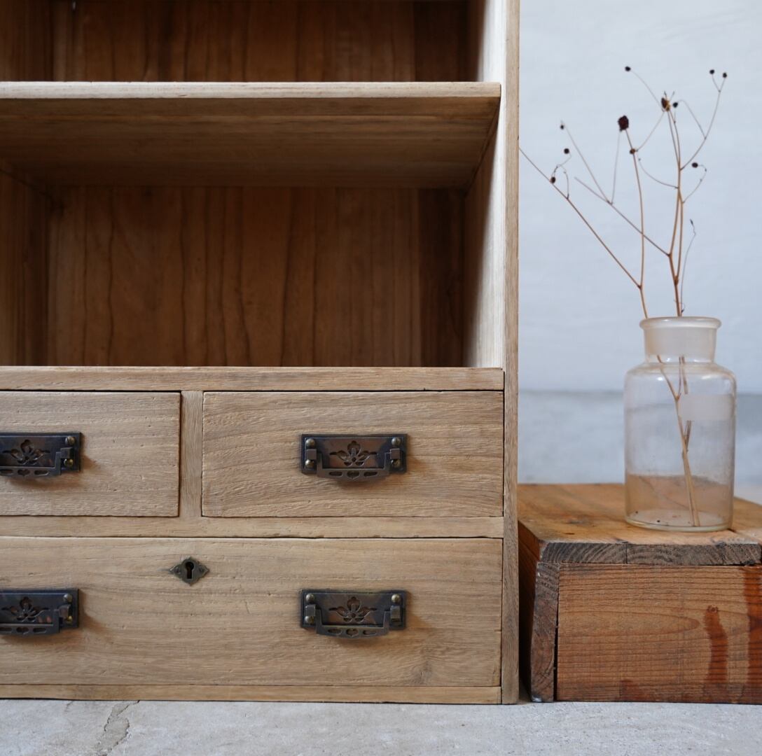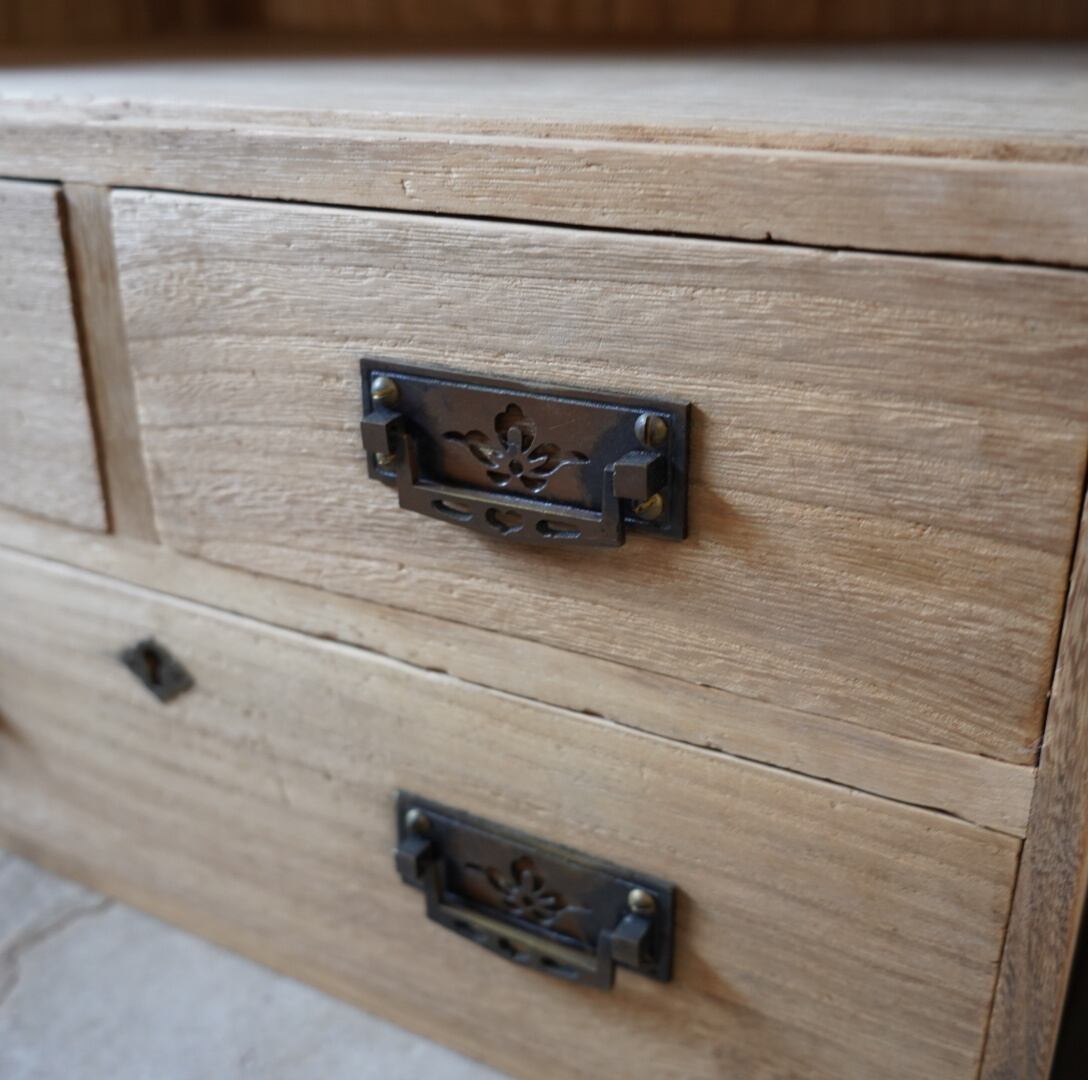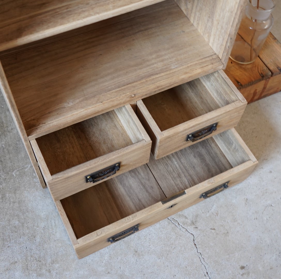 無垢材のナチュラルな木味と真鍮の装飾取手の引き出しが美しい木製棚です。