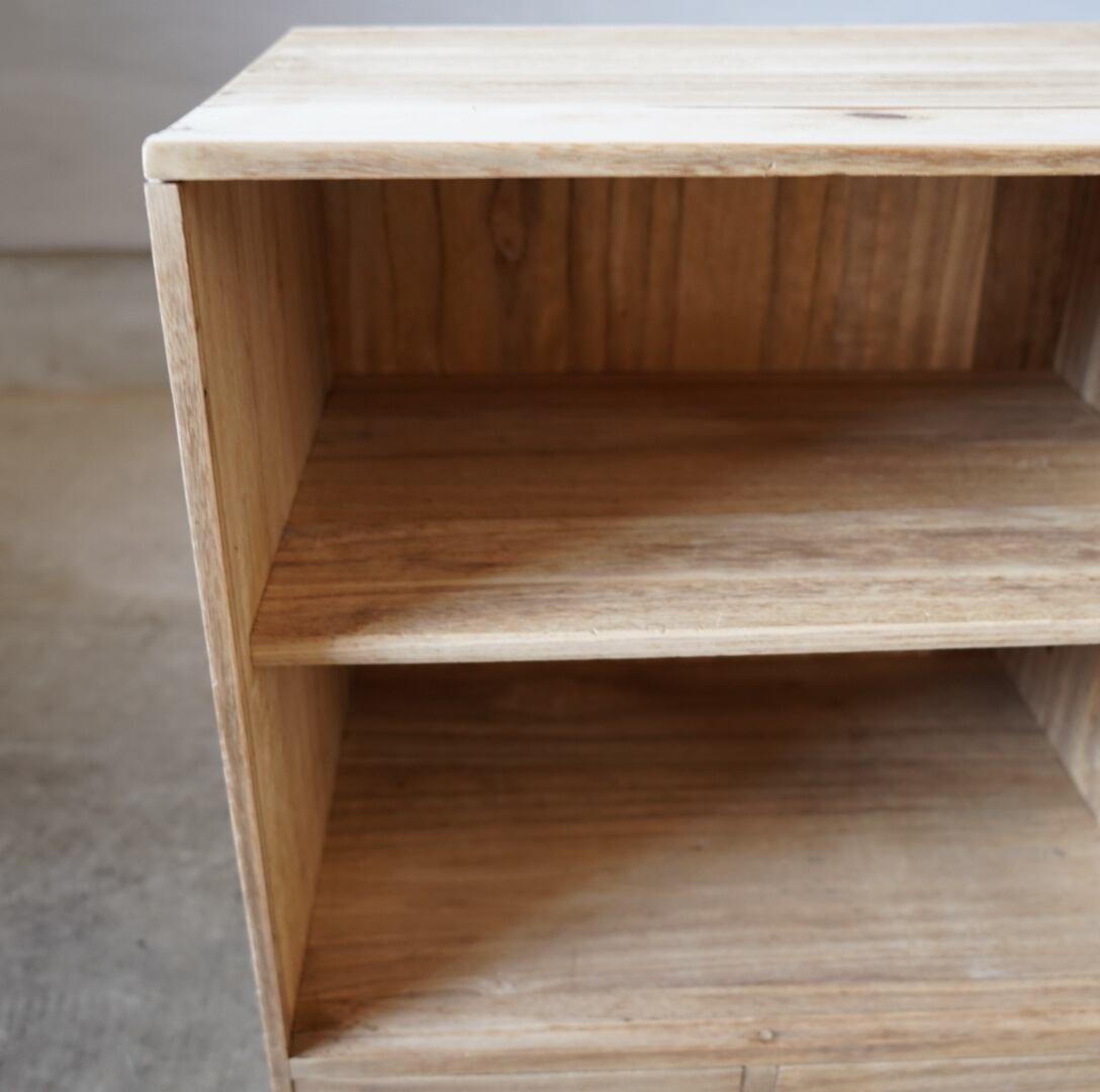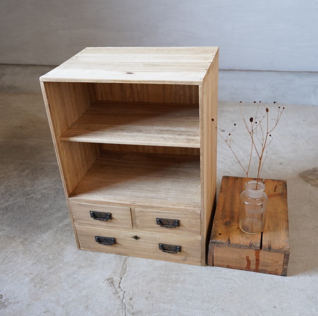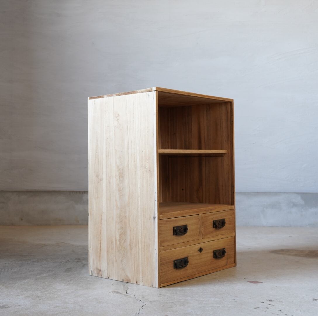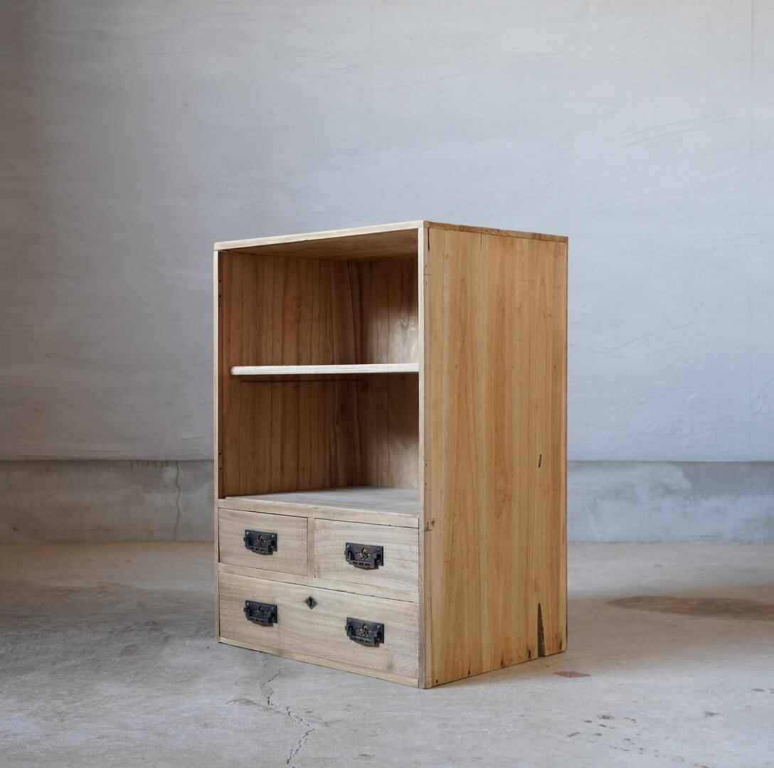 無垢材のナチュラルな木味と真鍮の装飾取手の引き出しが美しい木製棚です。