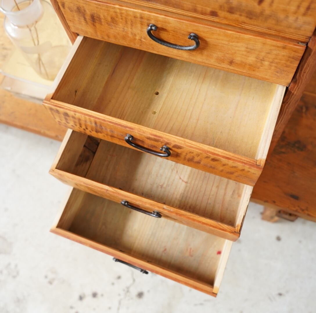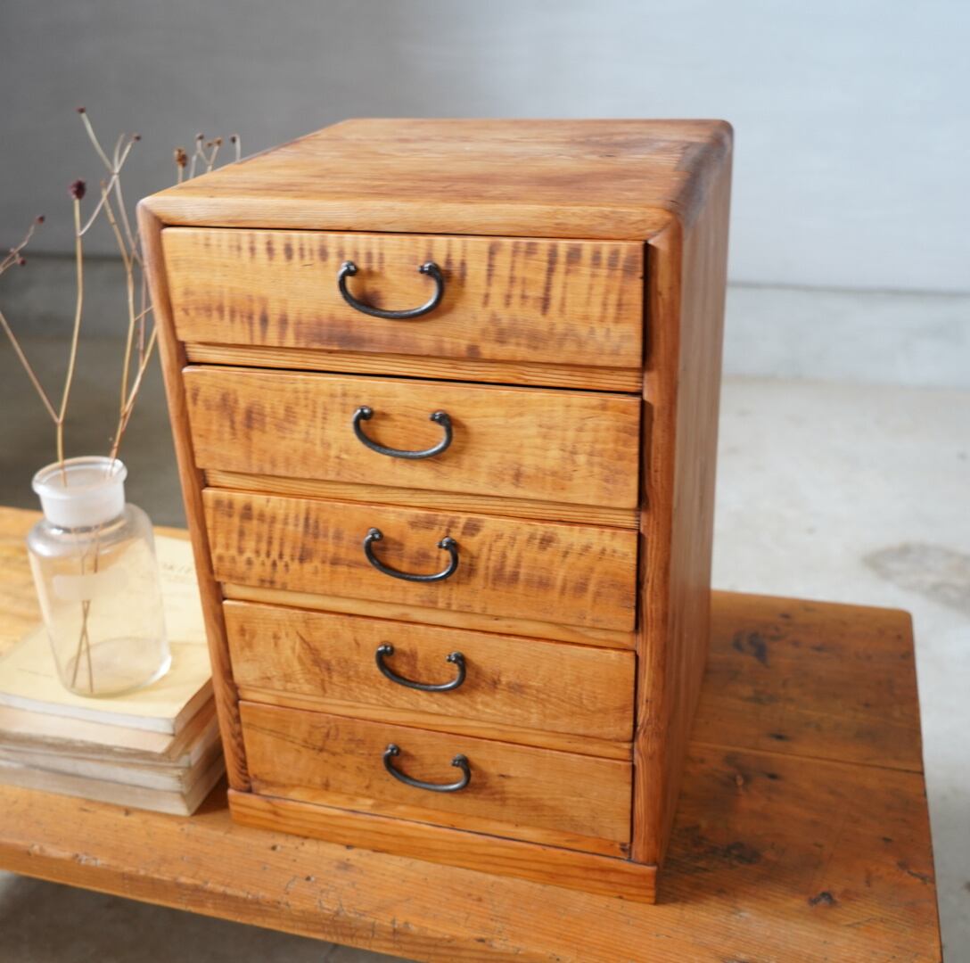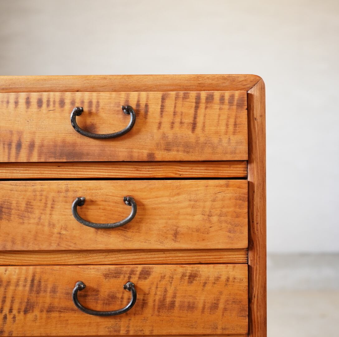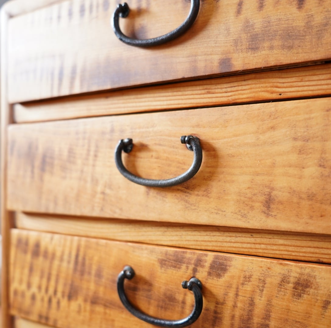 ナチュラルな木味と並んだ黒い金属の取手が可愛らしい5杯の引き出し。