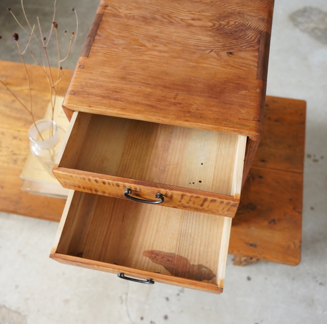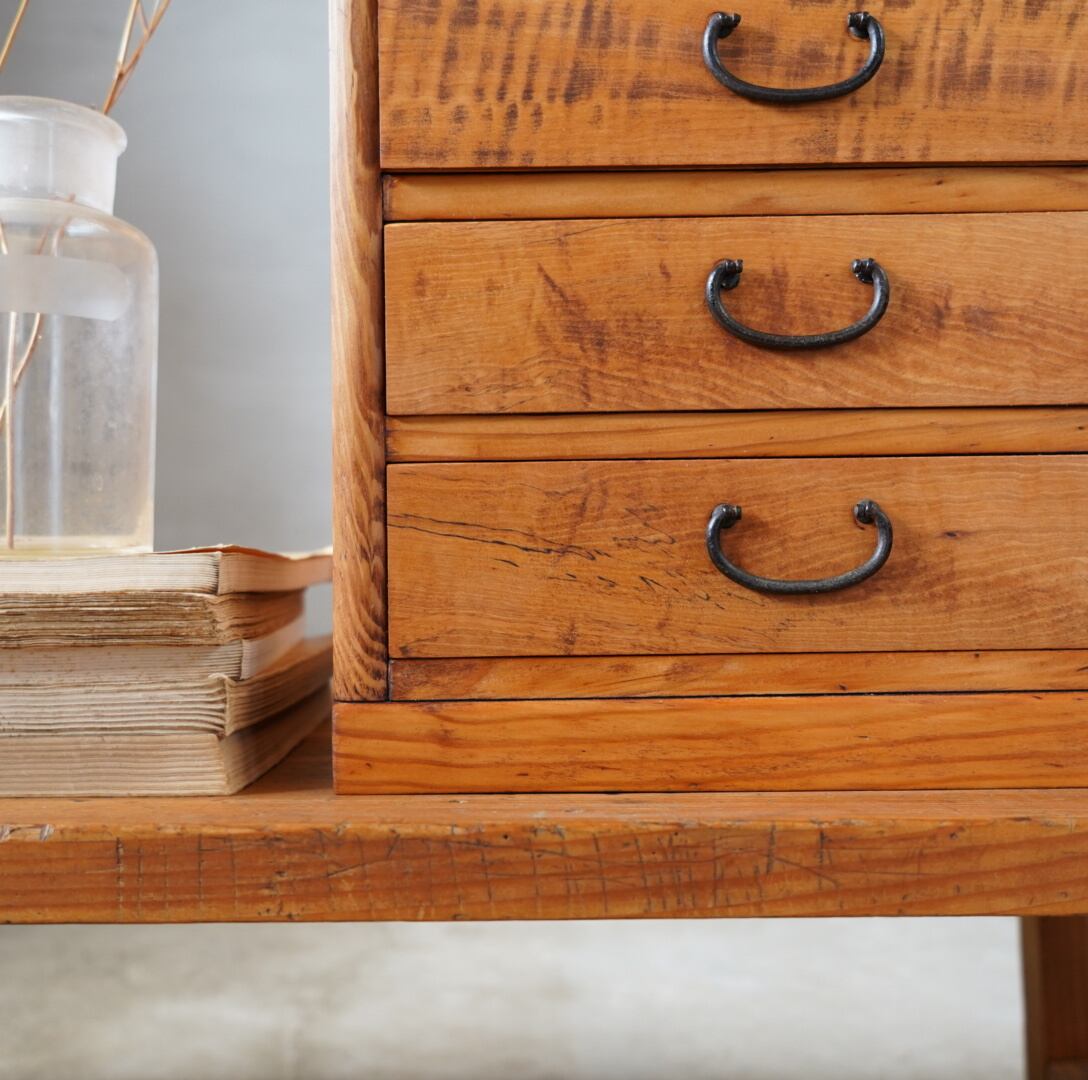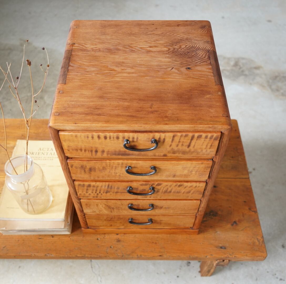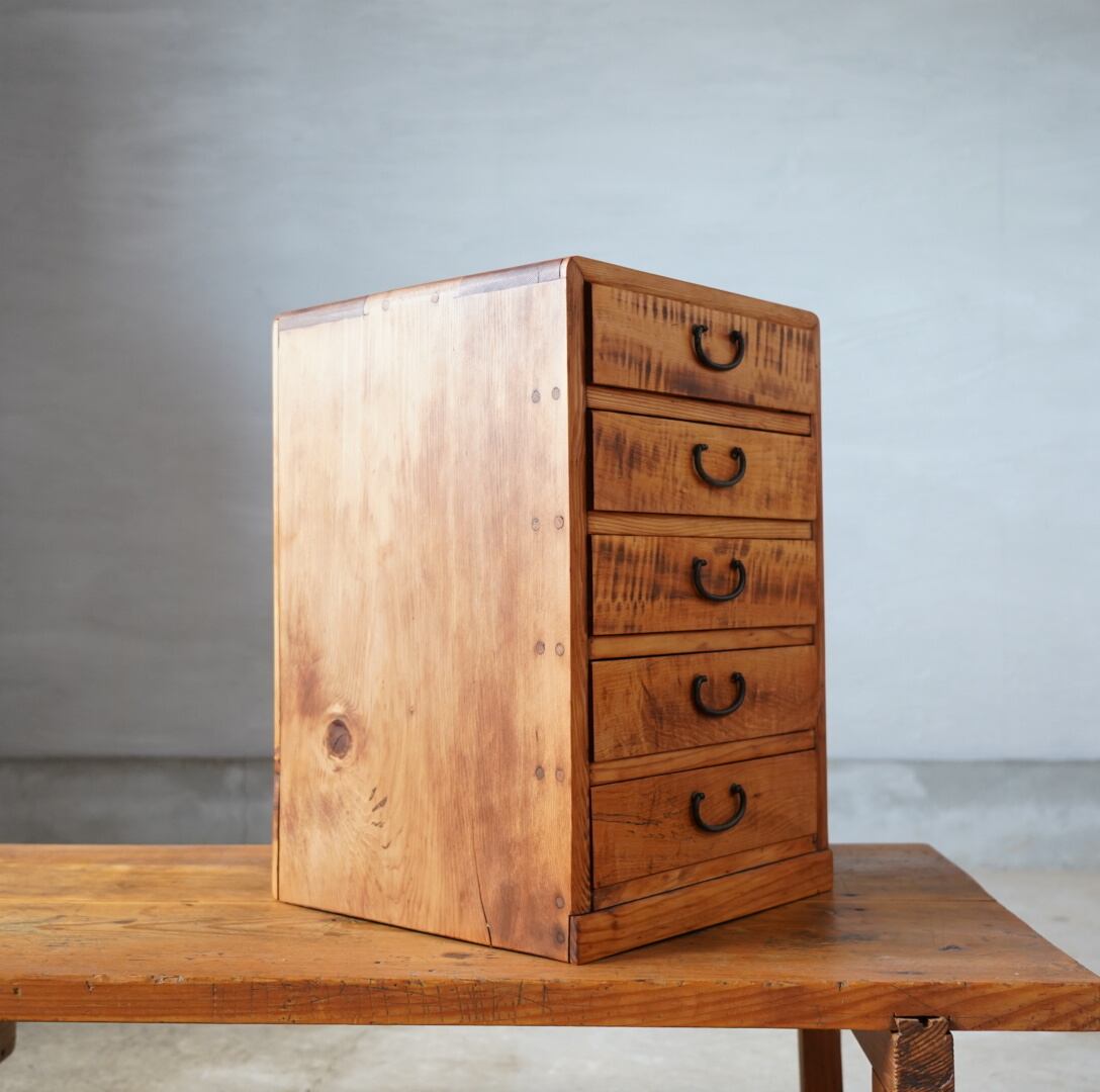 ナチュラルな木味と並んだ黒い金属の取手が可愛らしい5杯の引き出し。