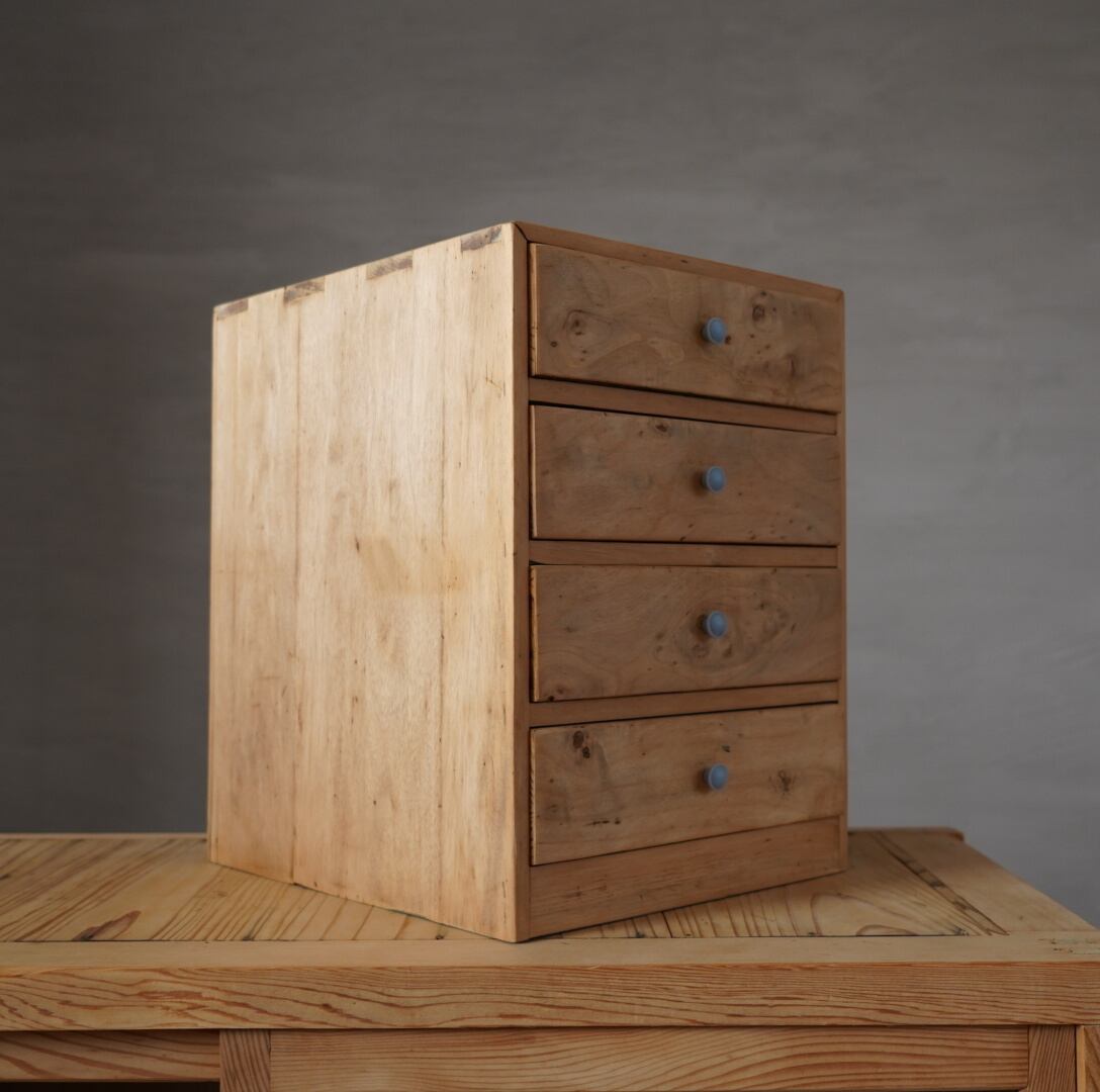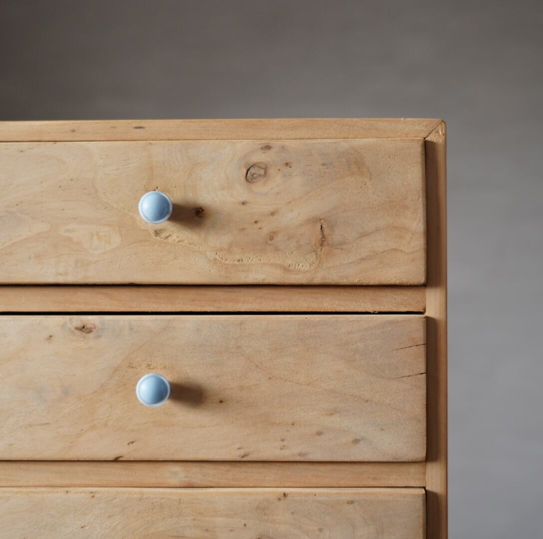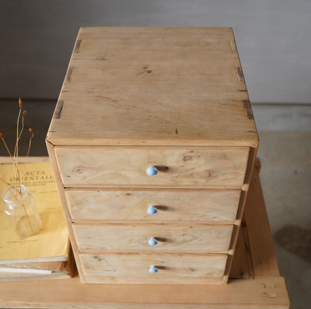 無垢材のナチュラルな木味とちいさな水色のつまみが可愛らしい4杯の引き出しです。