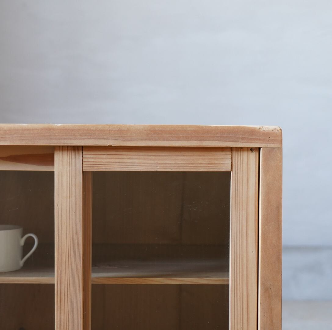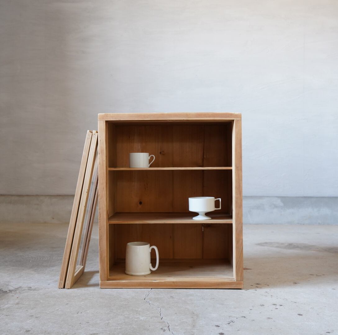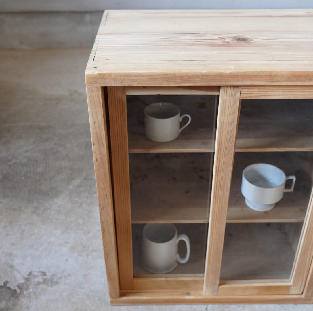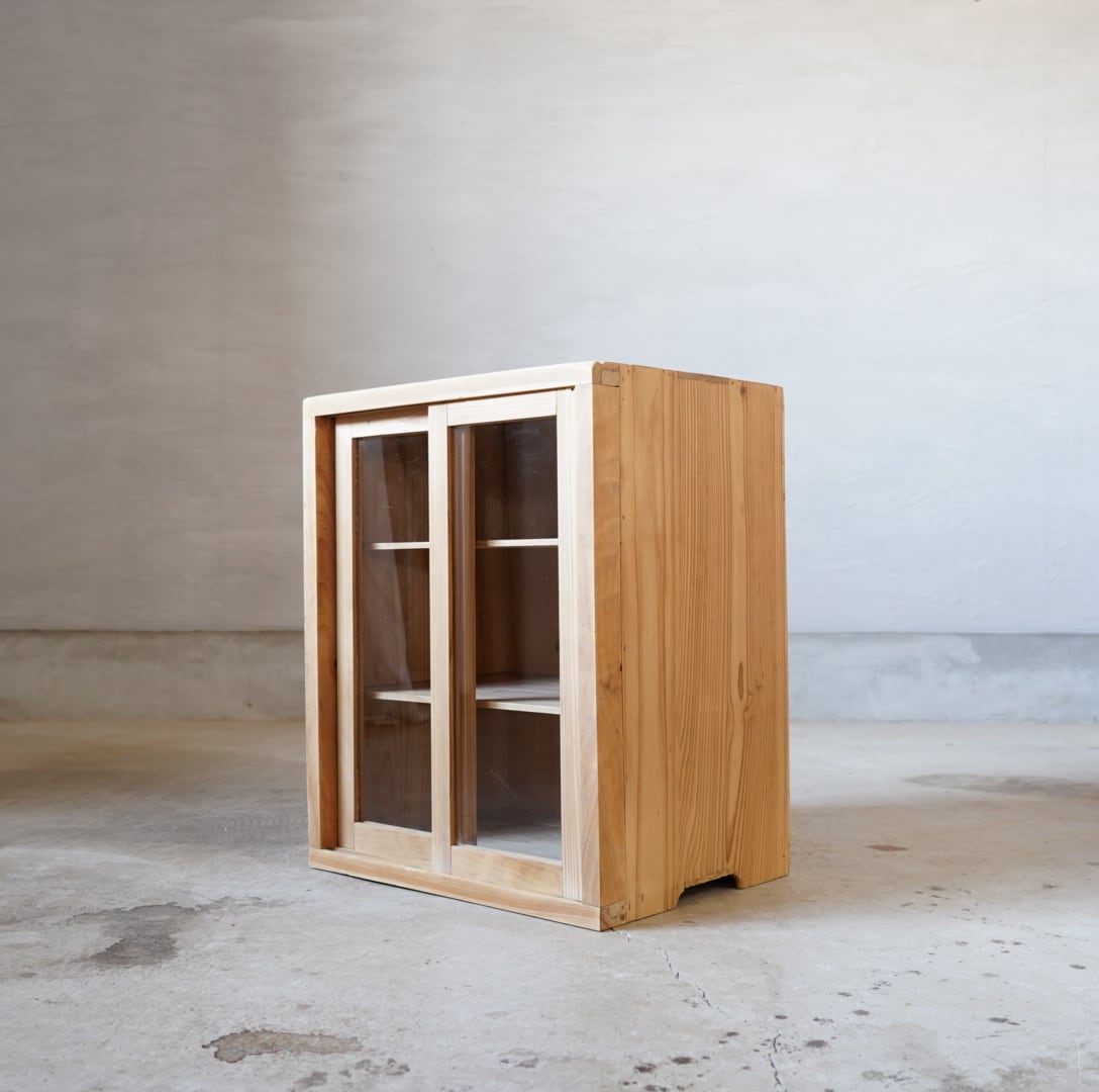 古い木材の素朴な風合いとガラスの引き戸が可愛らしい小ぶりなキャビネットです。