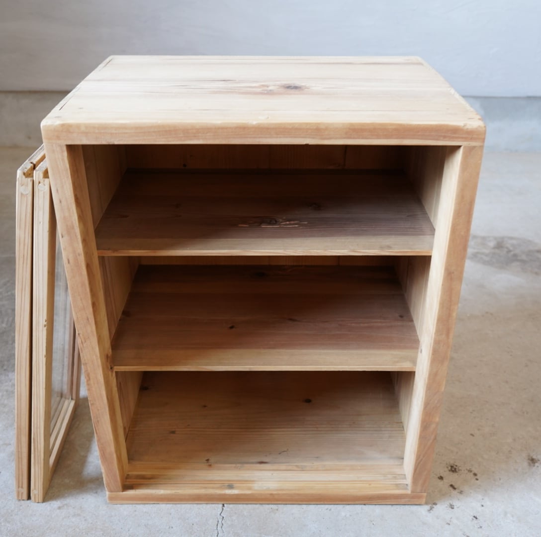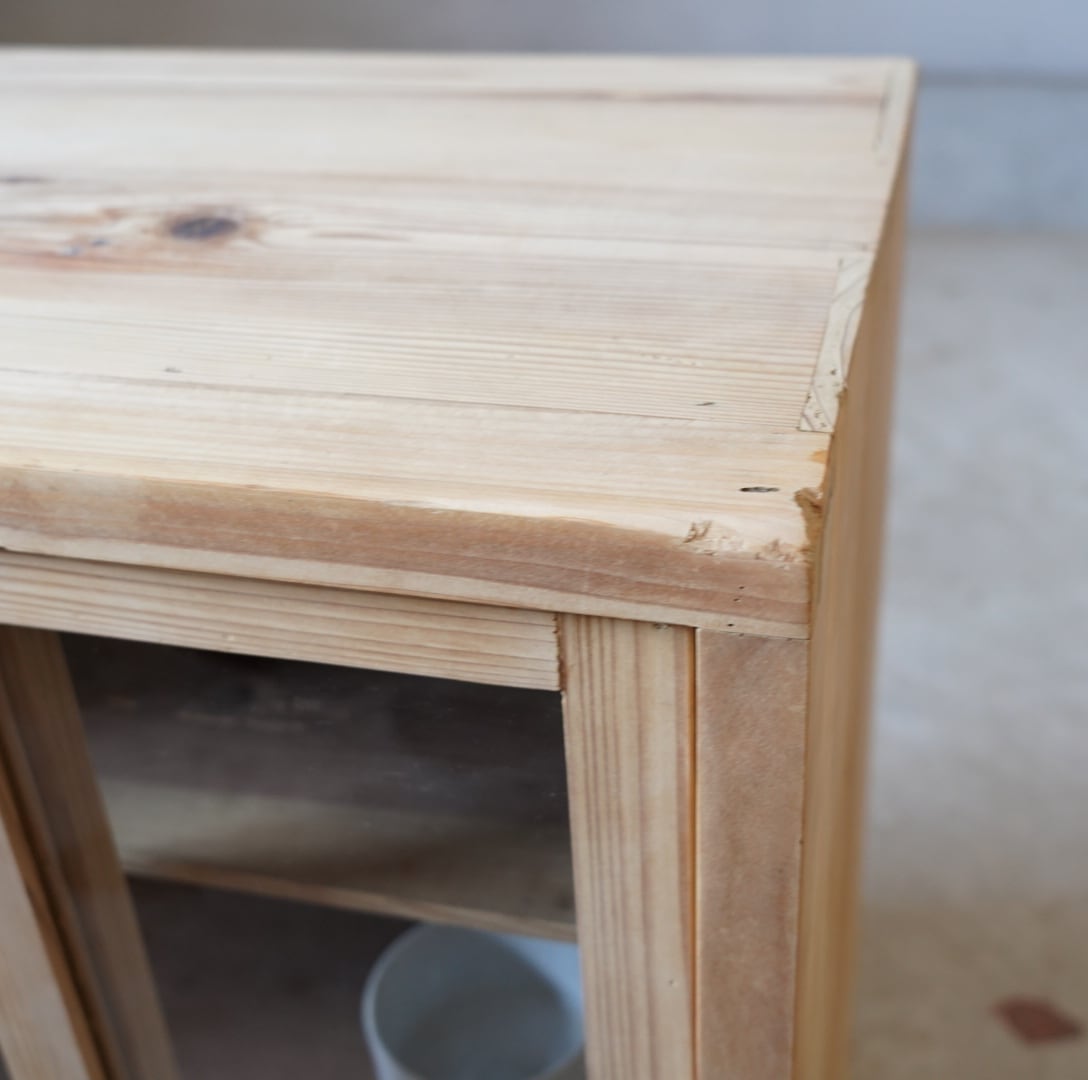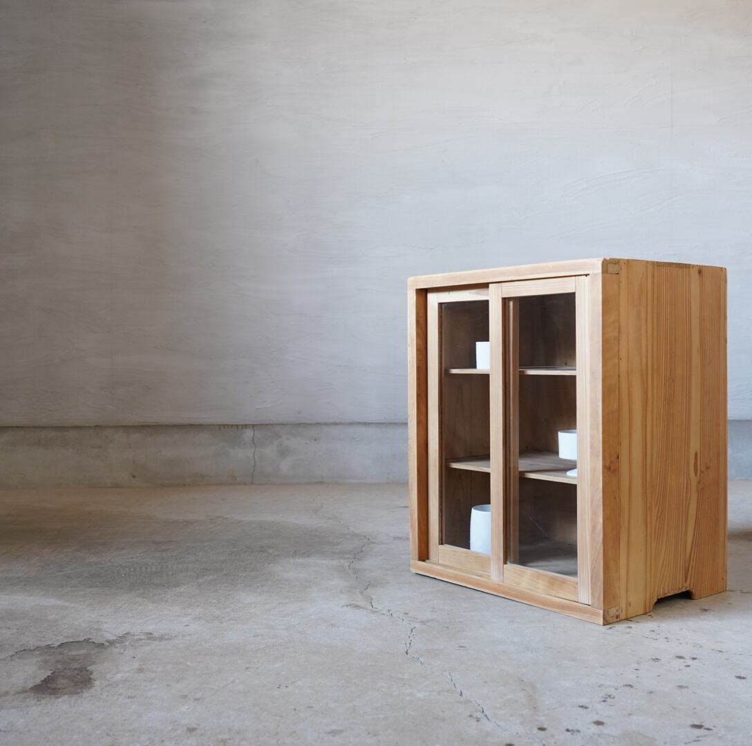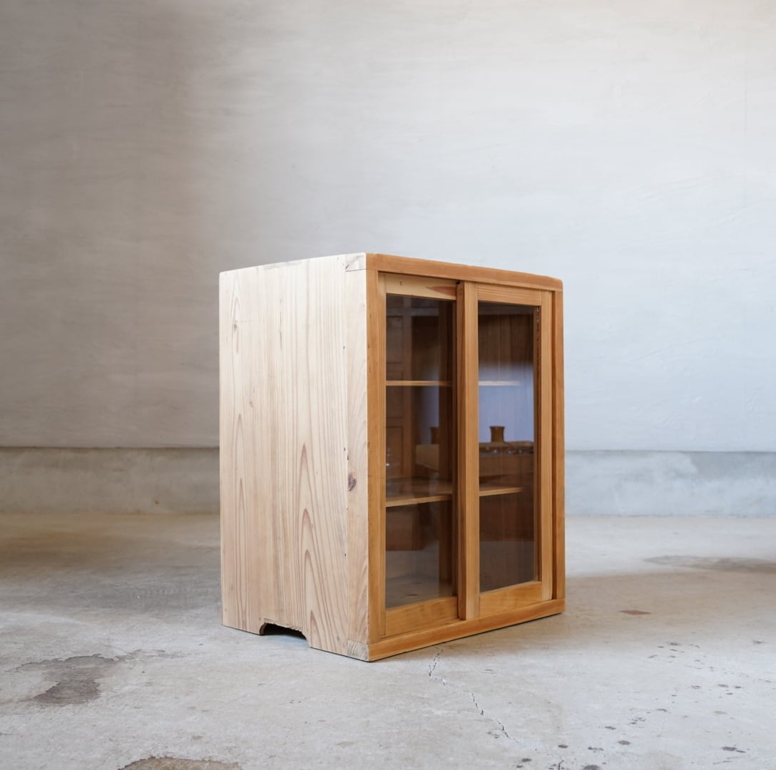 古い木材の素朴な風合いとガラスの引き戸が可愛らしい小ぶりなキャビネットです。