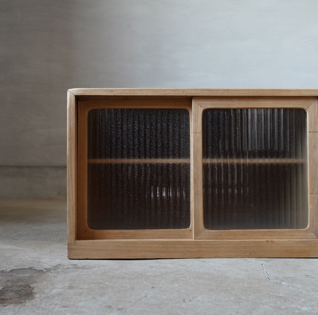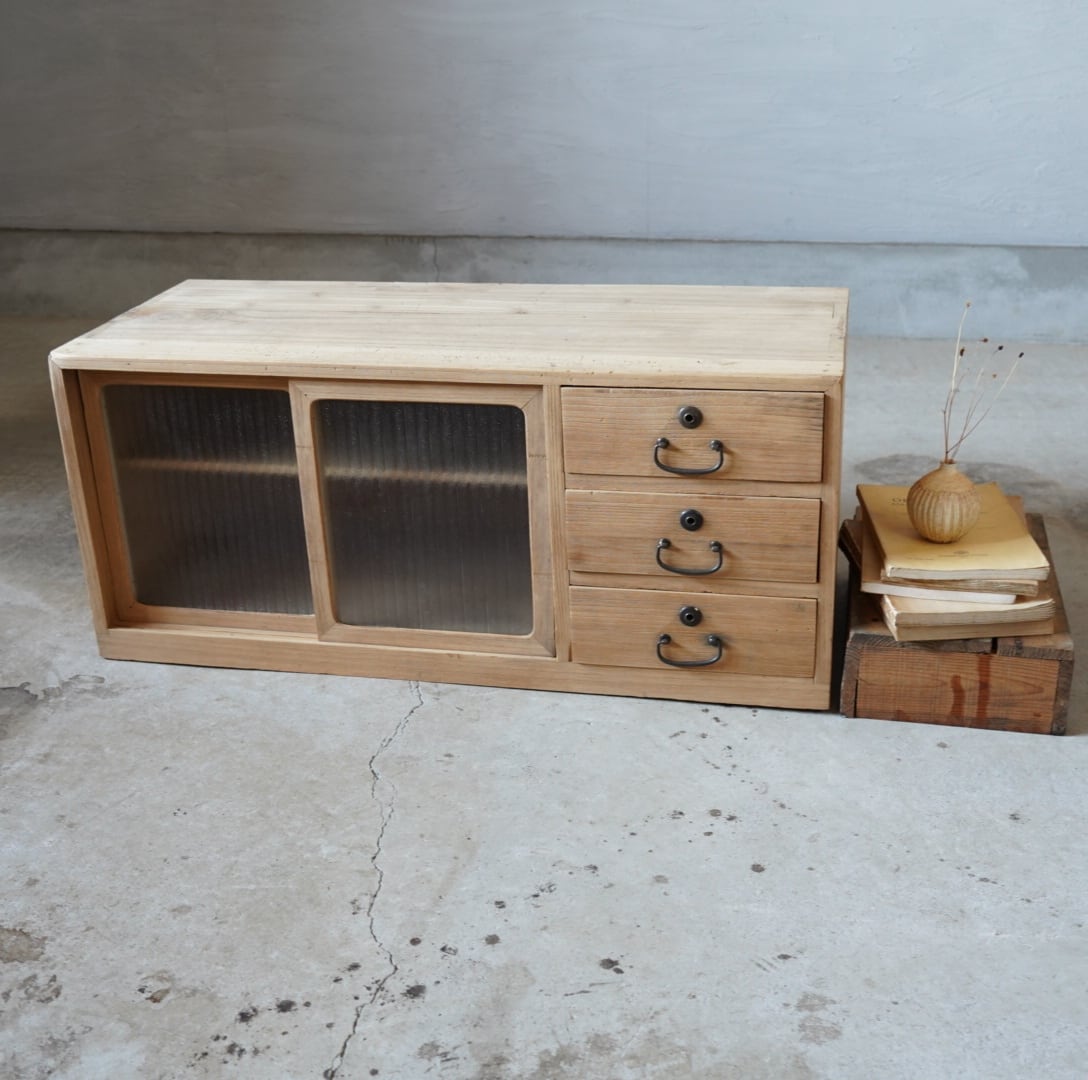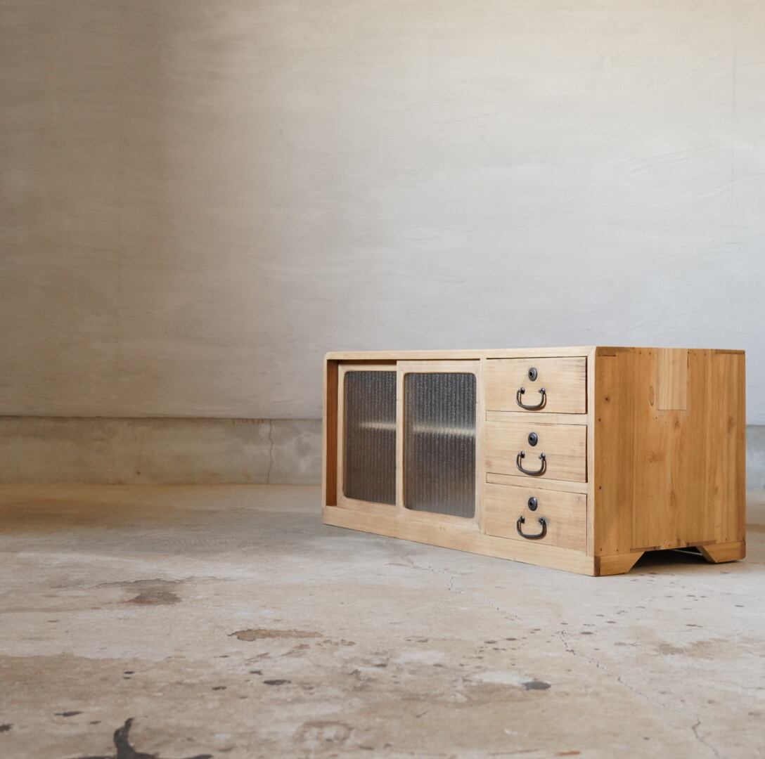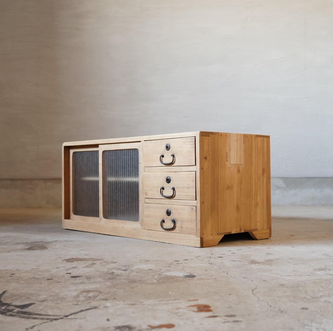 並んだ3杯の引き出しとキラキラと光を反射するモールガラスの引き戸が美しいローボードです。