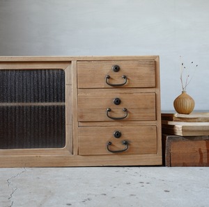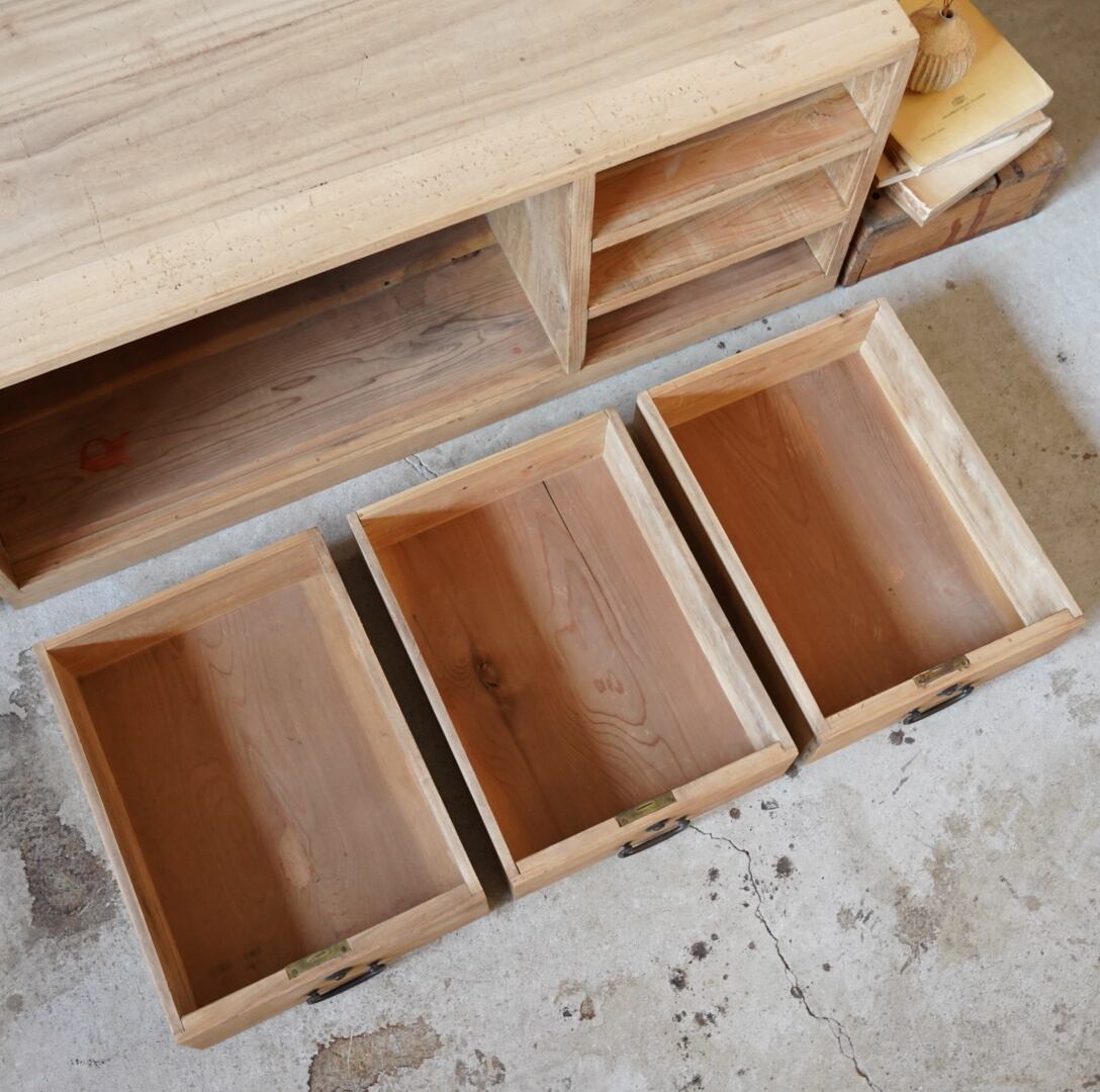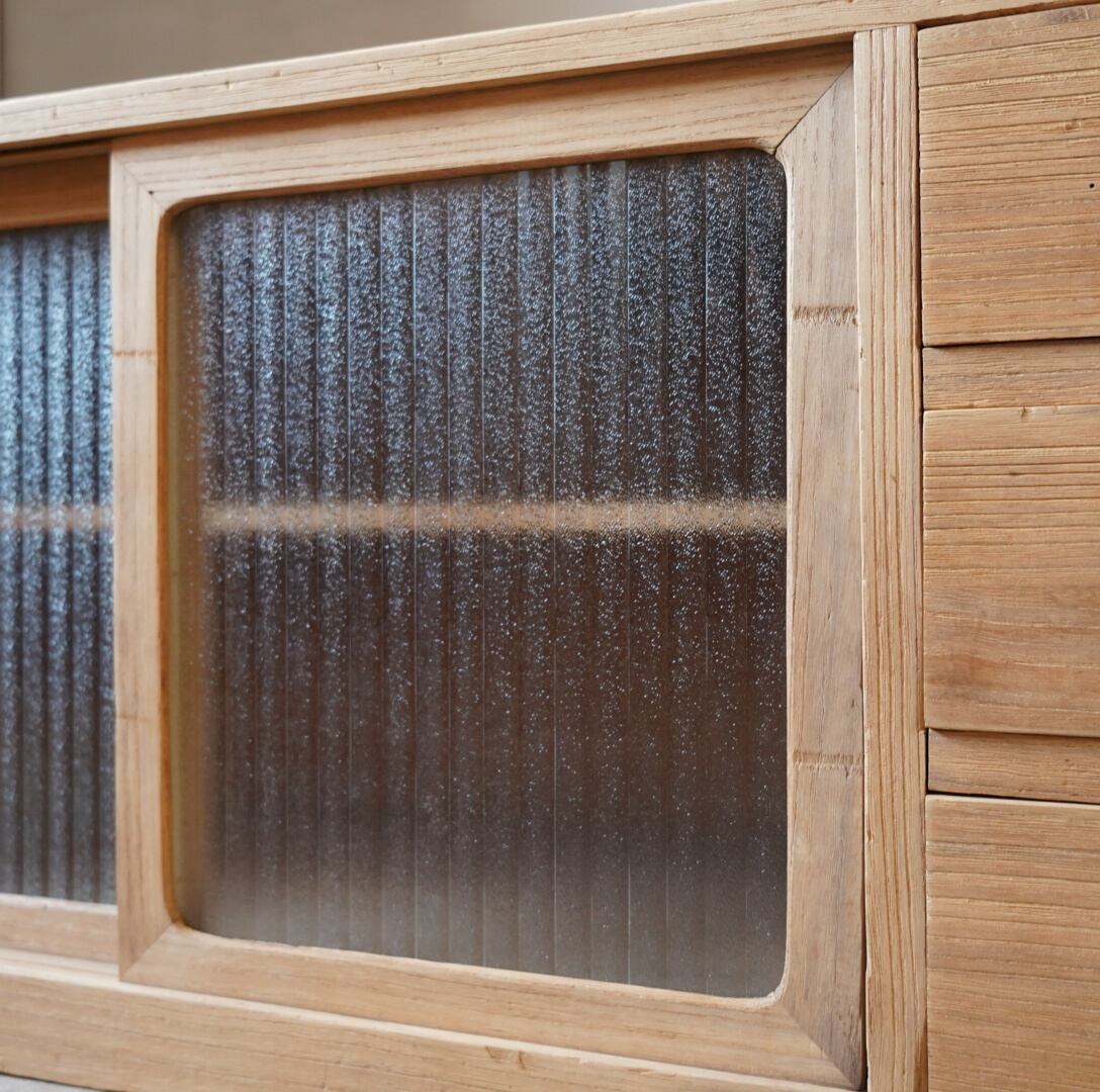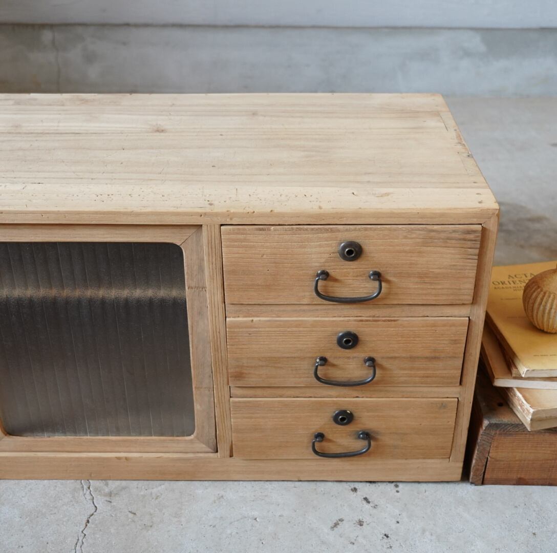 並んだ3杯の引き出しとキラキラと光を反射するモールガラスの引き戸が美しいローボードです。