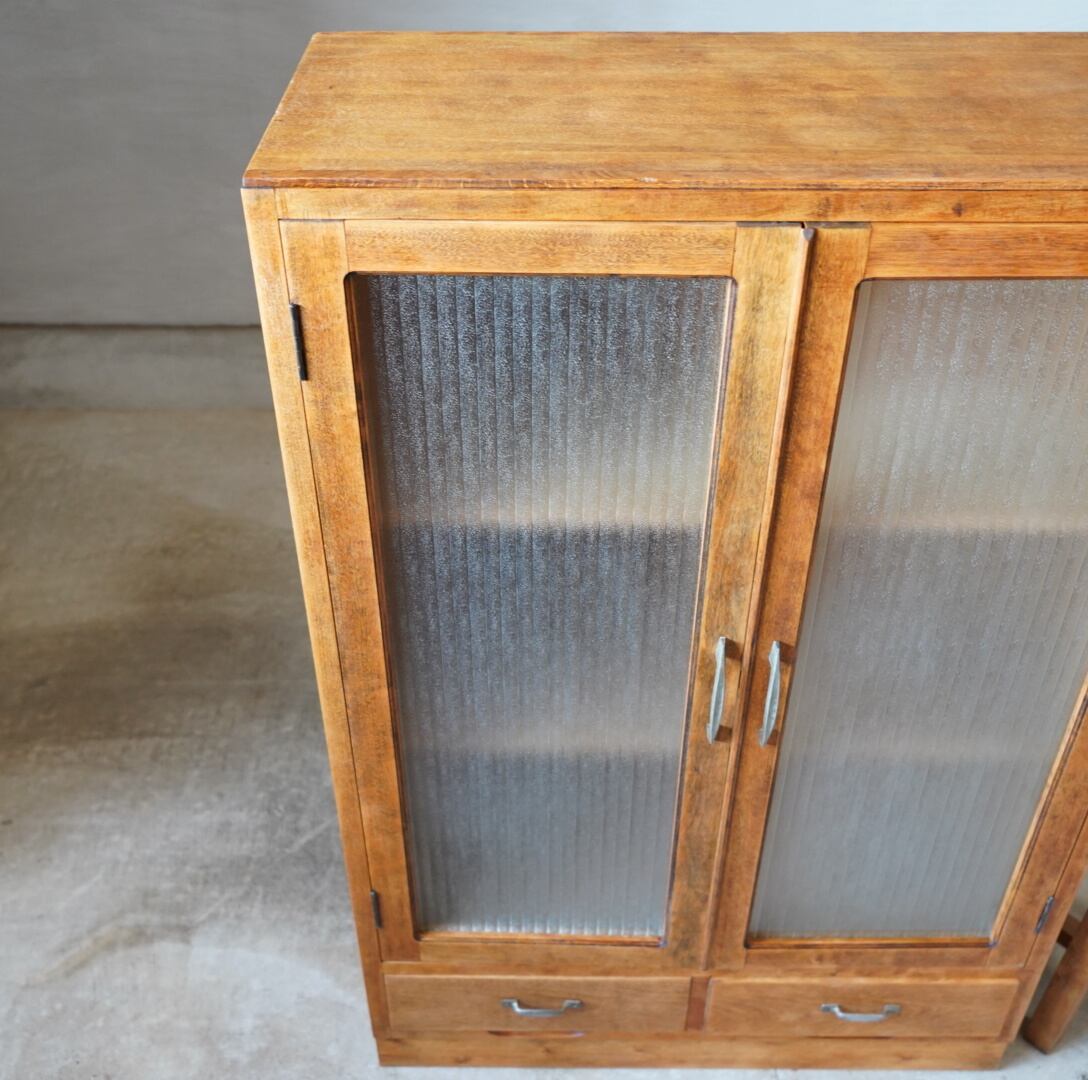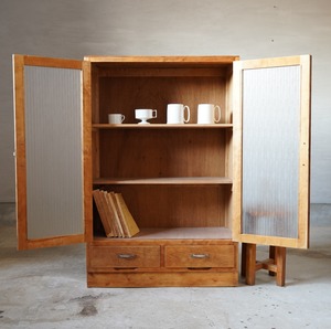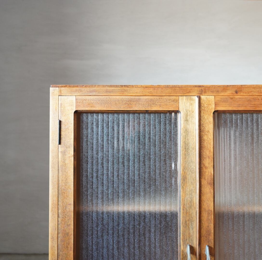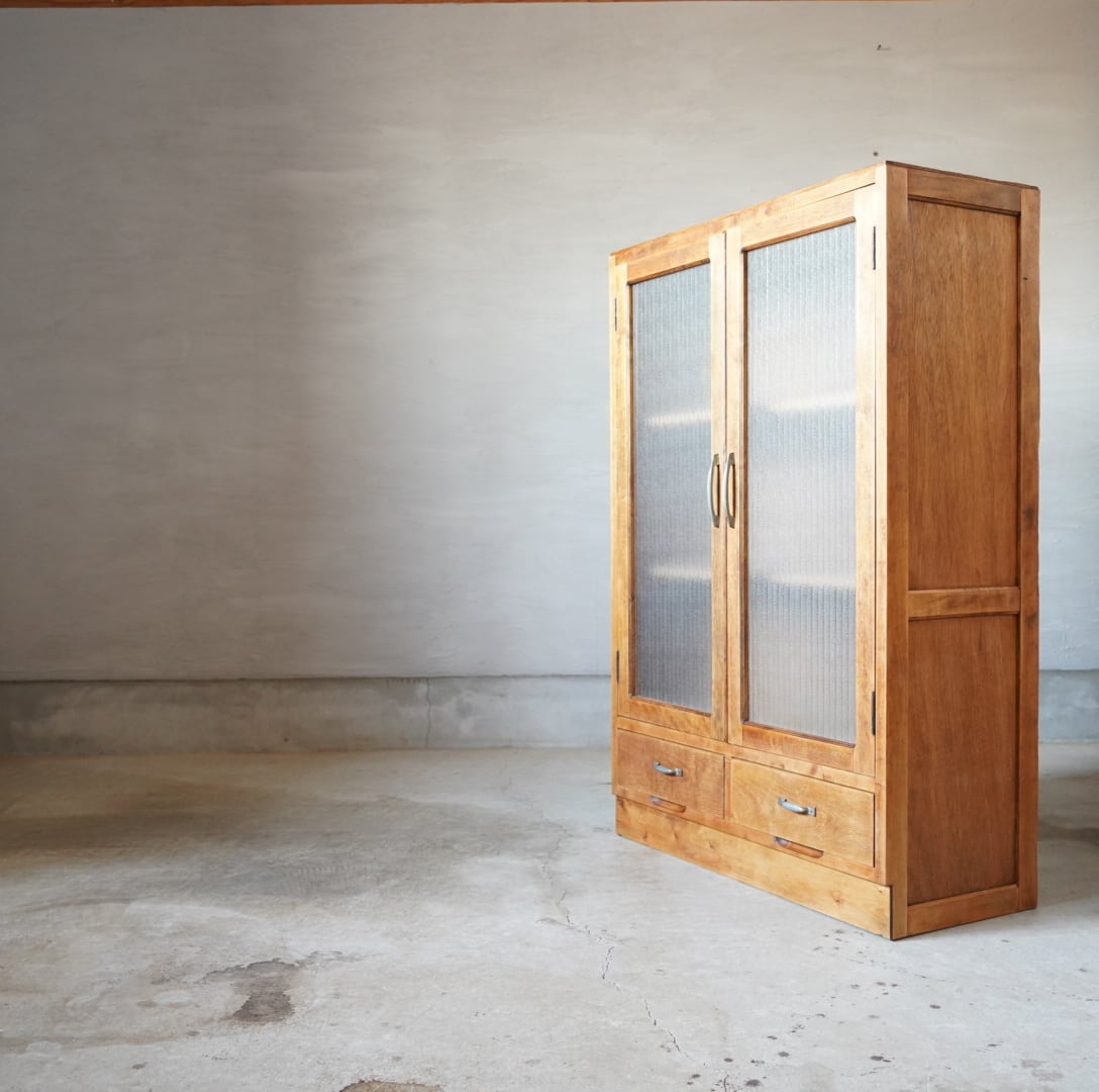 ナチュラルな木味とキラキラと光を反射するモールガラスの開き戸が美しいキャビネットです。