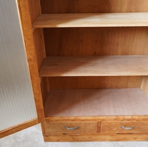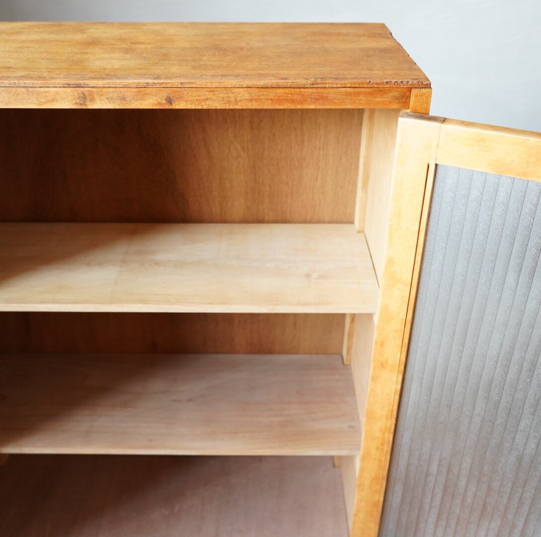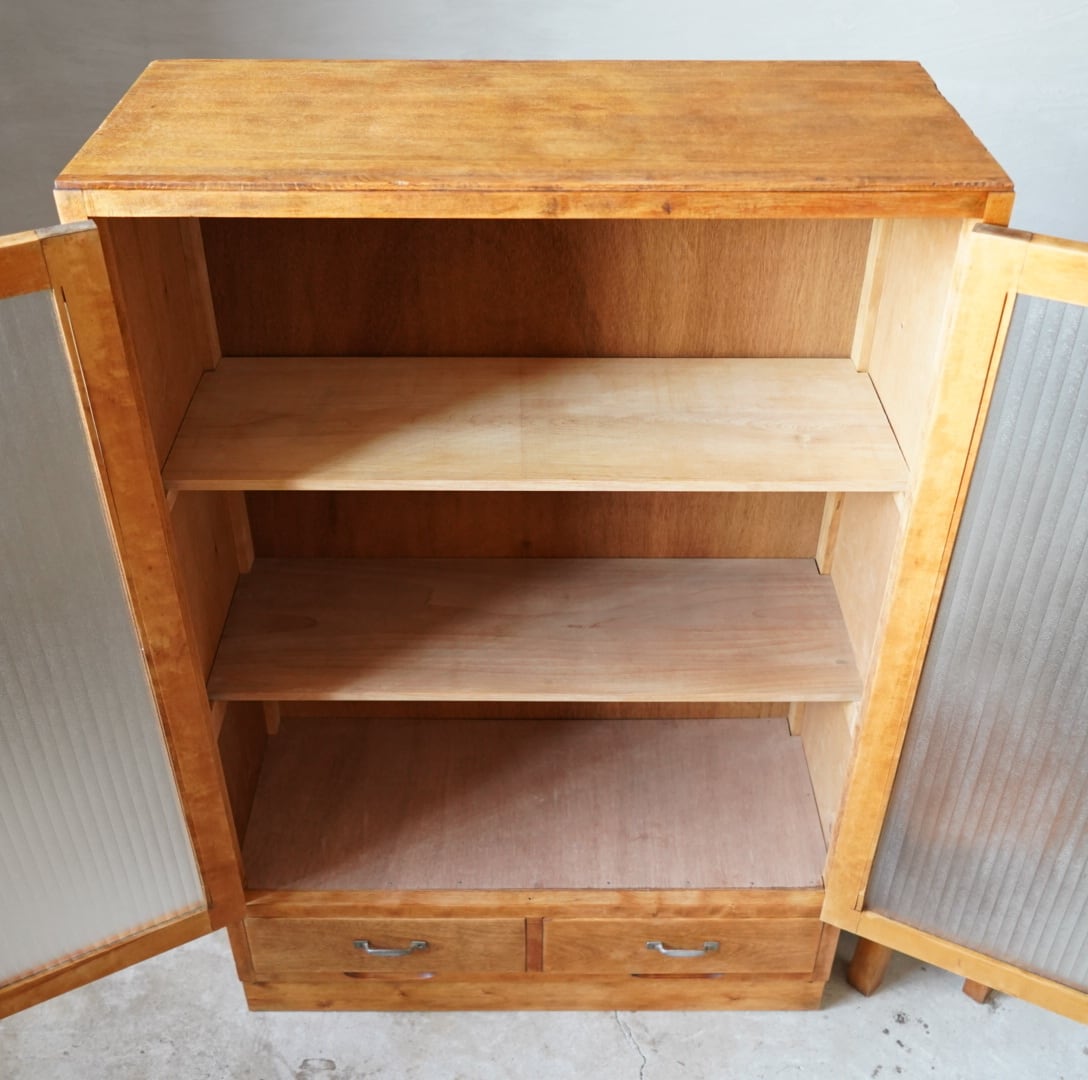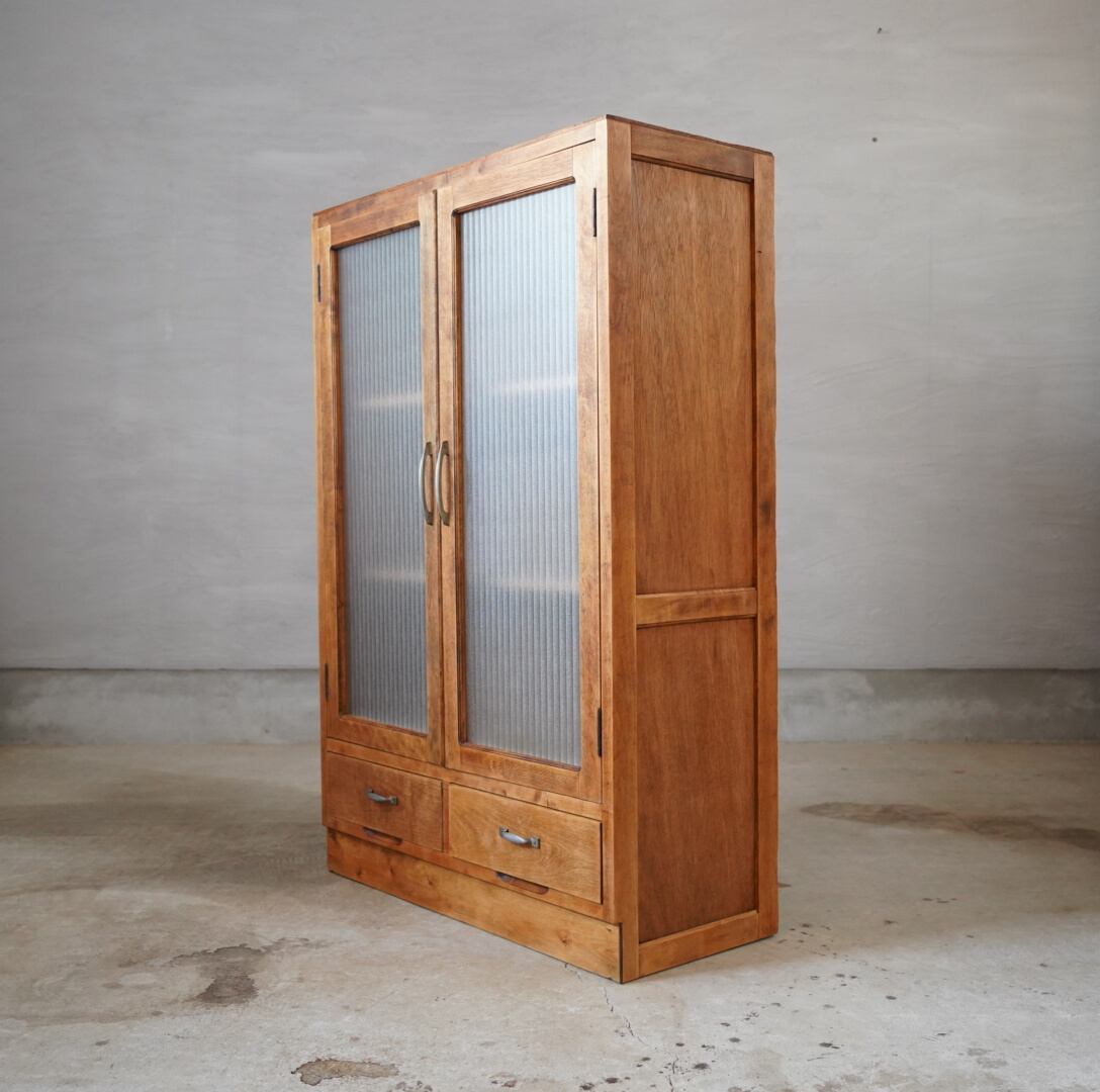 ナチュラルな木味とキラキラと光を反射するモールガラスの開き戸が美しいキャビネットです。