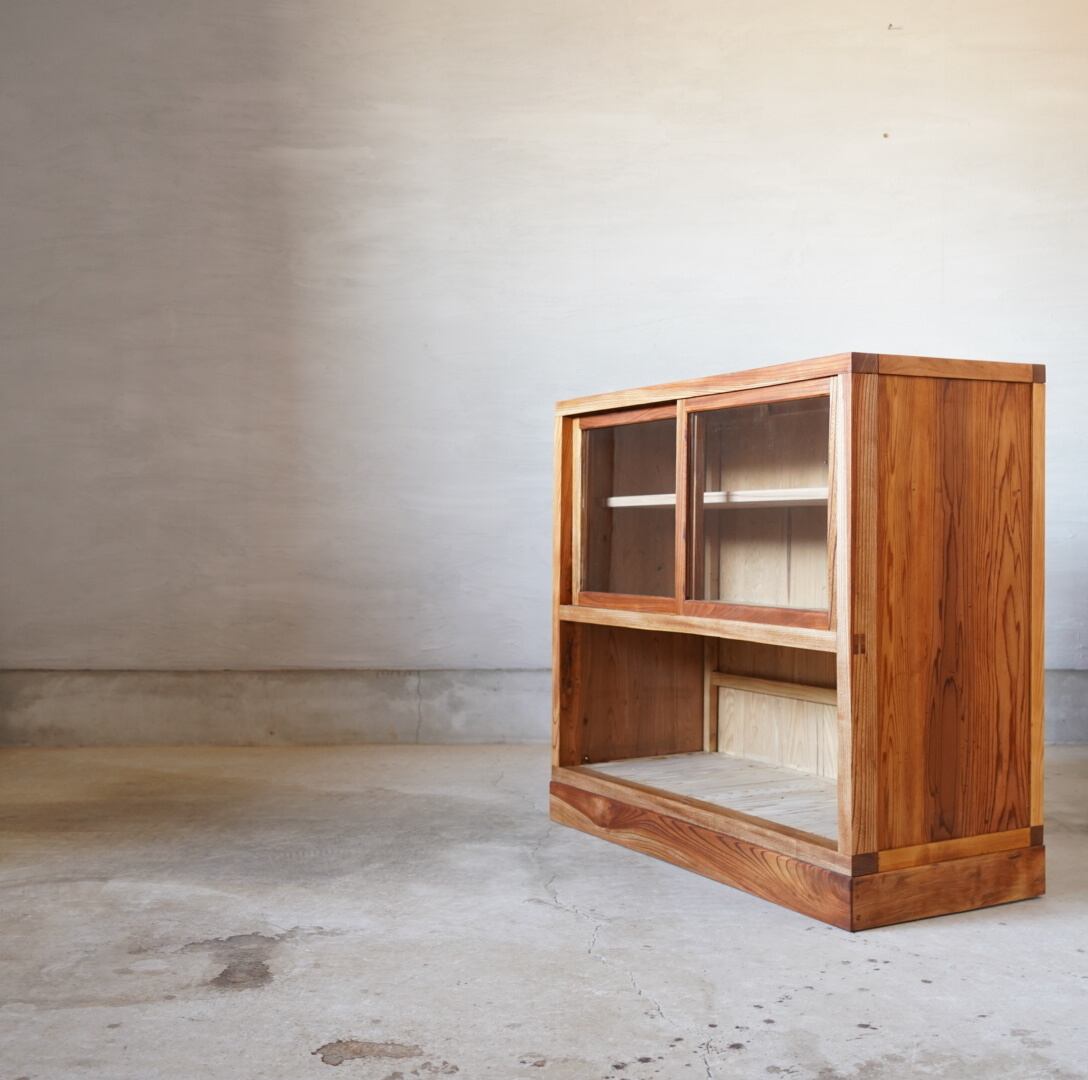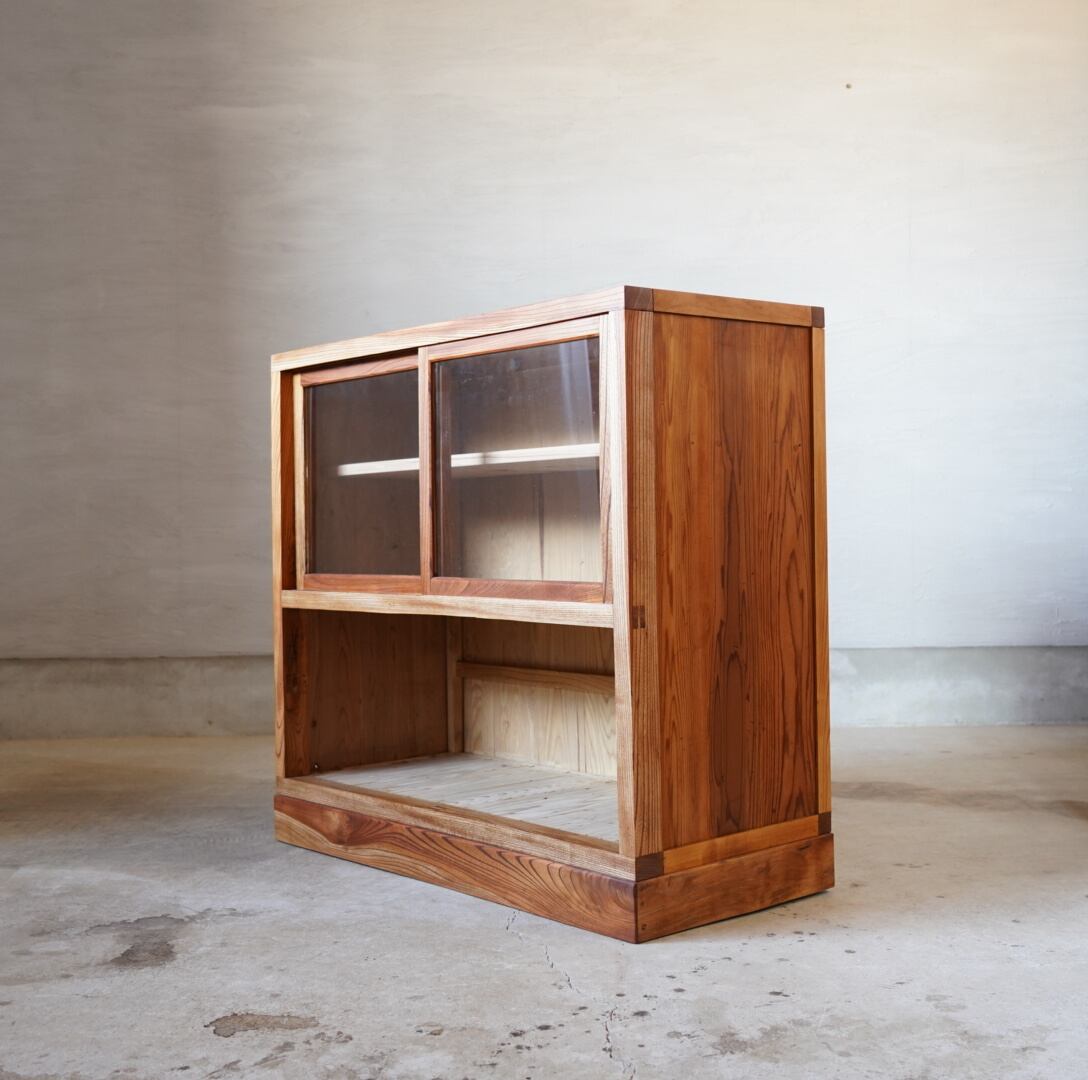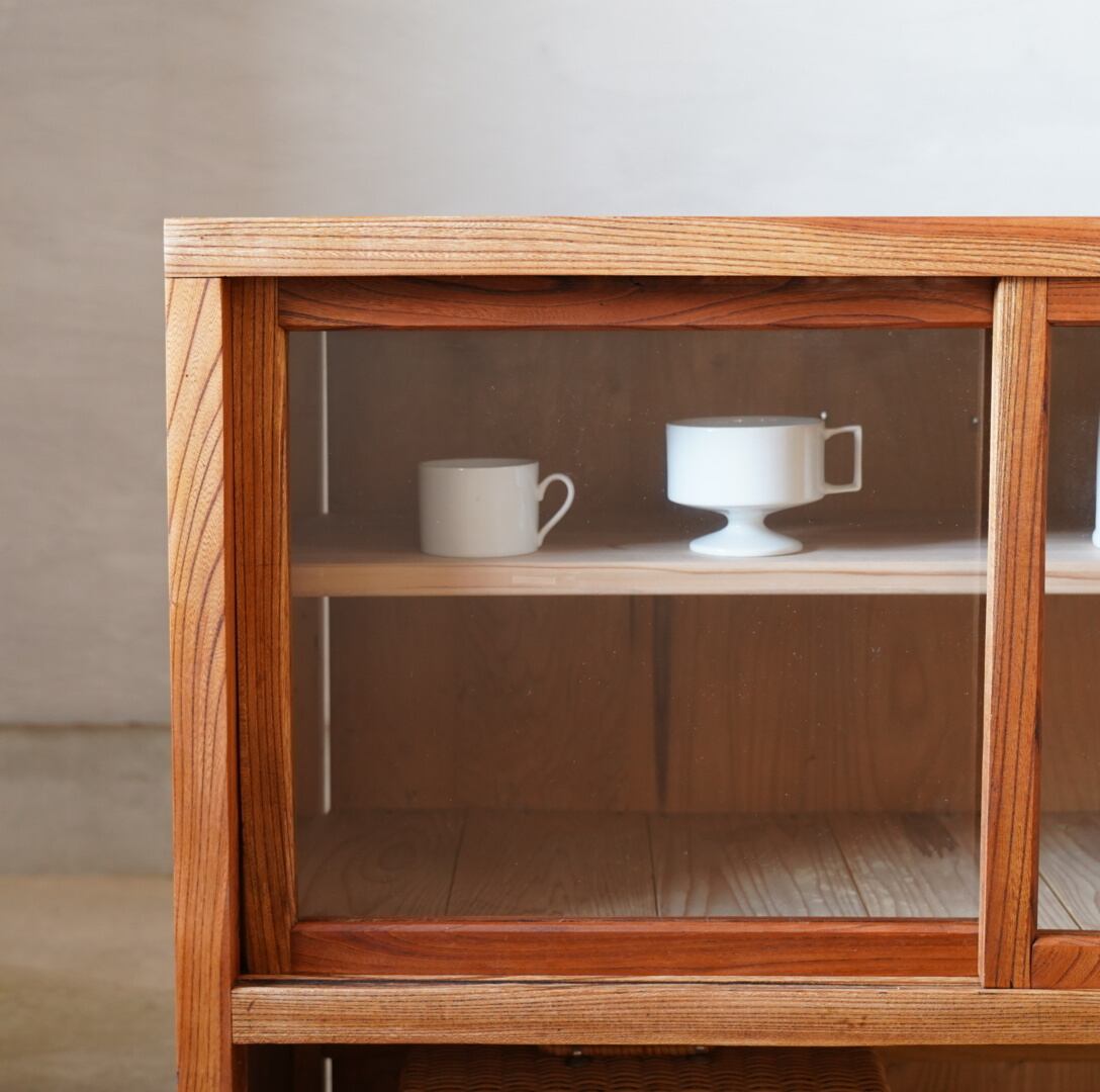 無垢材のナチュラルな木味とすっきりとしたガラス引き戸が美しいキャビネットです。