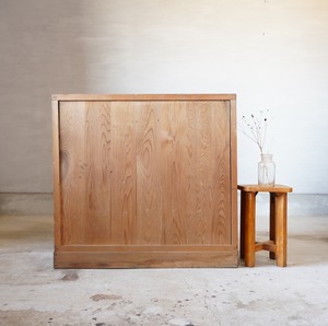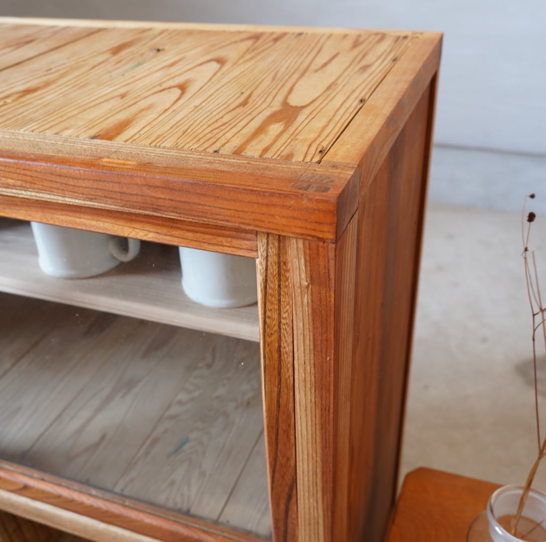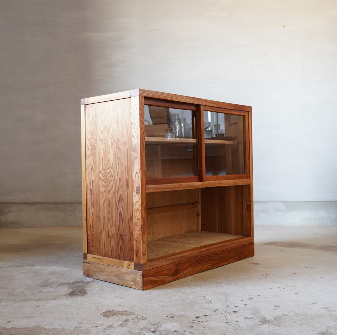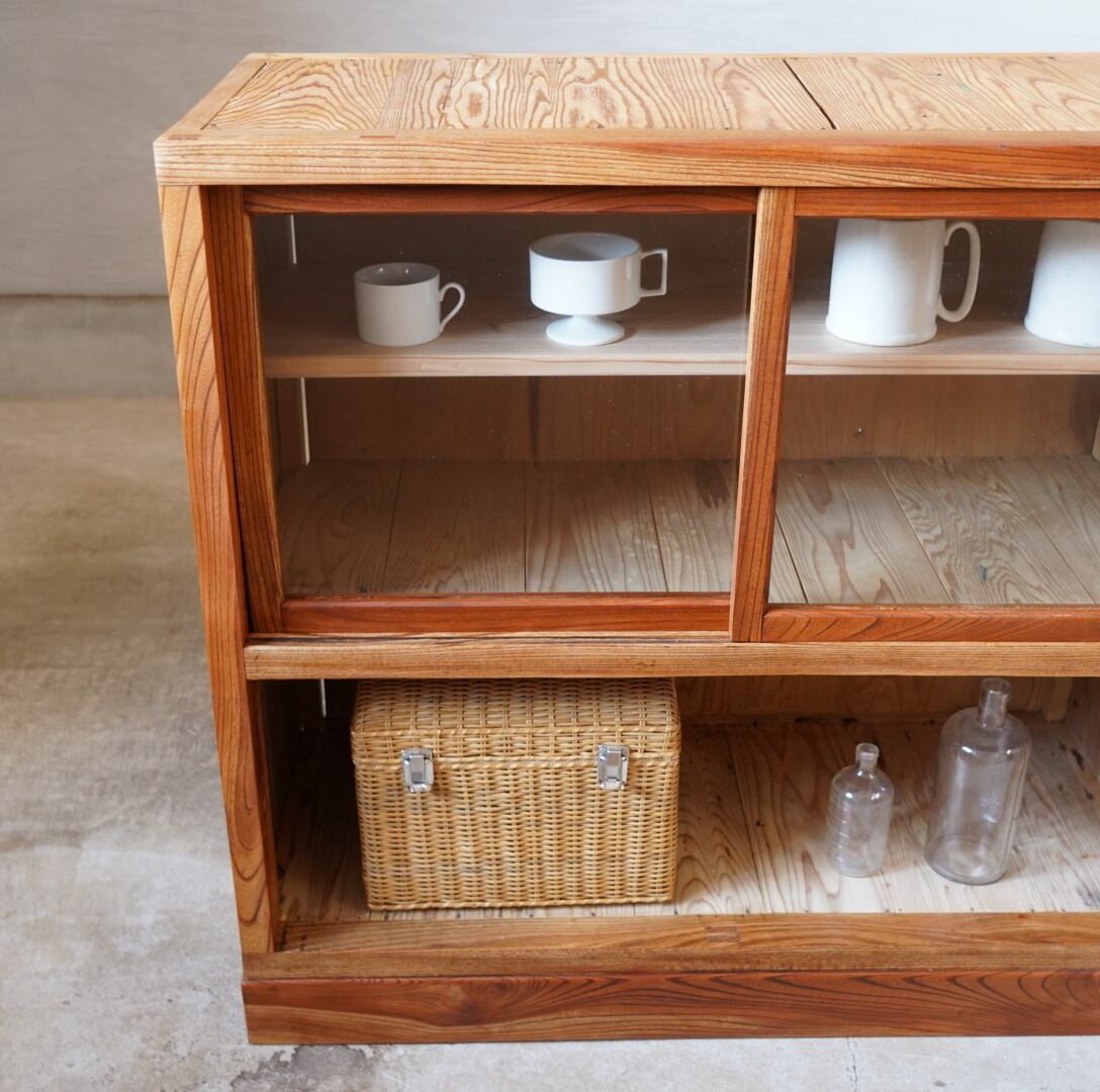 無垢材のナチュラルな木味とすっきりとしたガラス引き戸が美しいキャビネットです。
