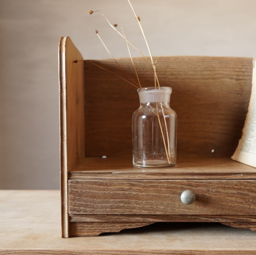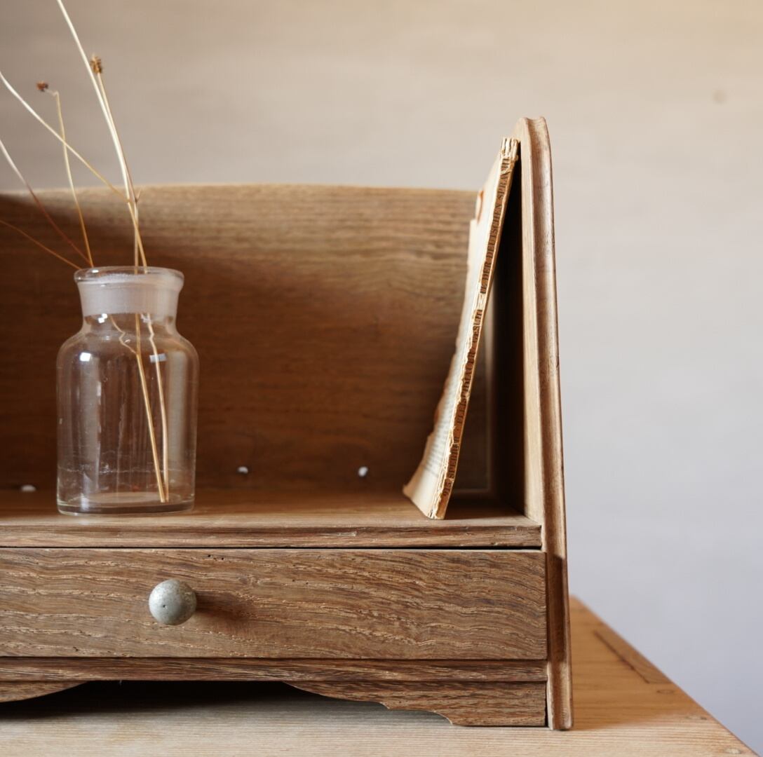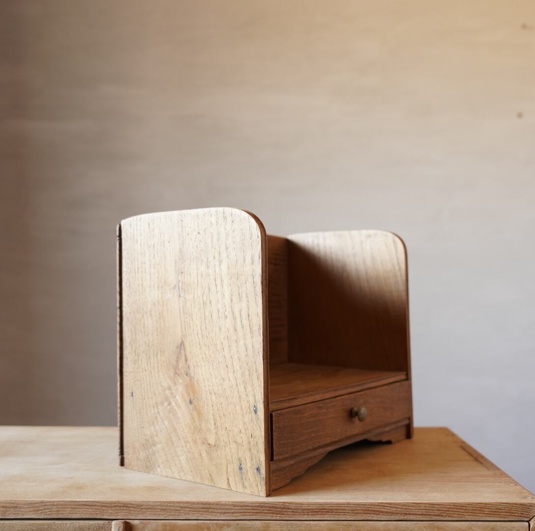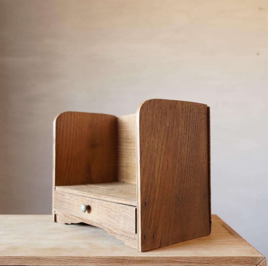 古い栗材の深みのある経年変化と丸い金属つまみの引き出しが可愛らしいブックスタンドです。