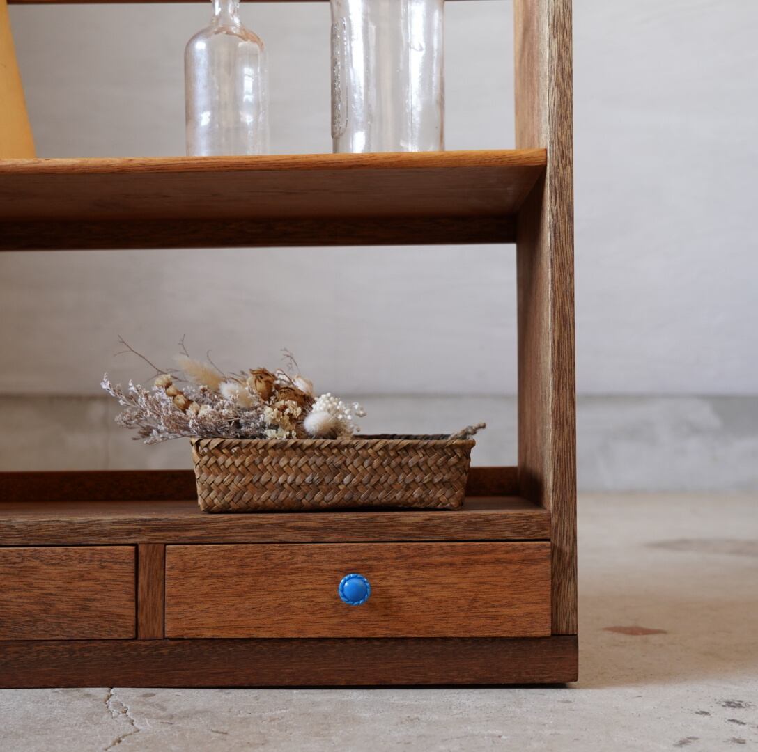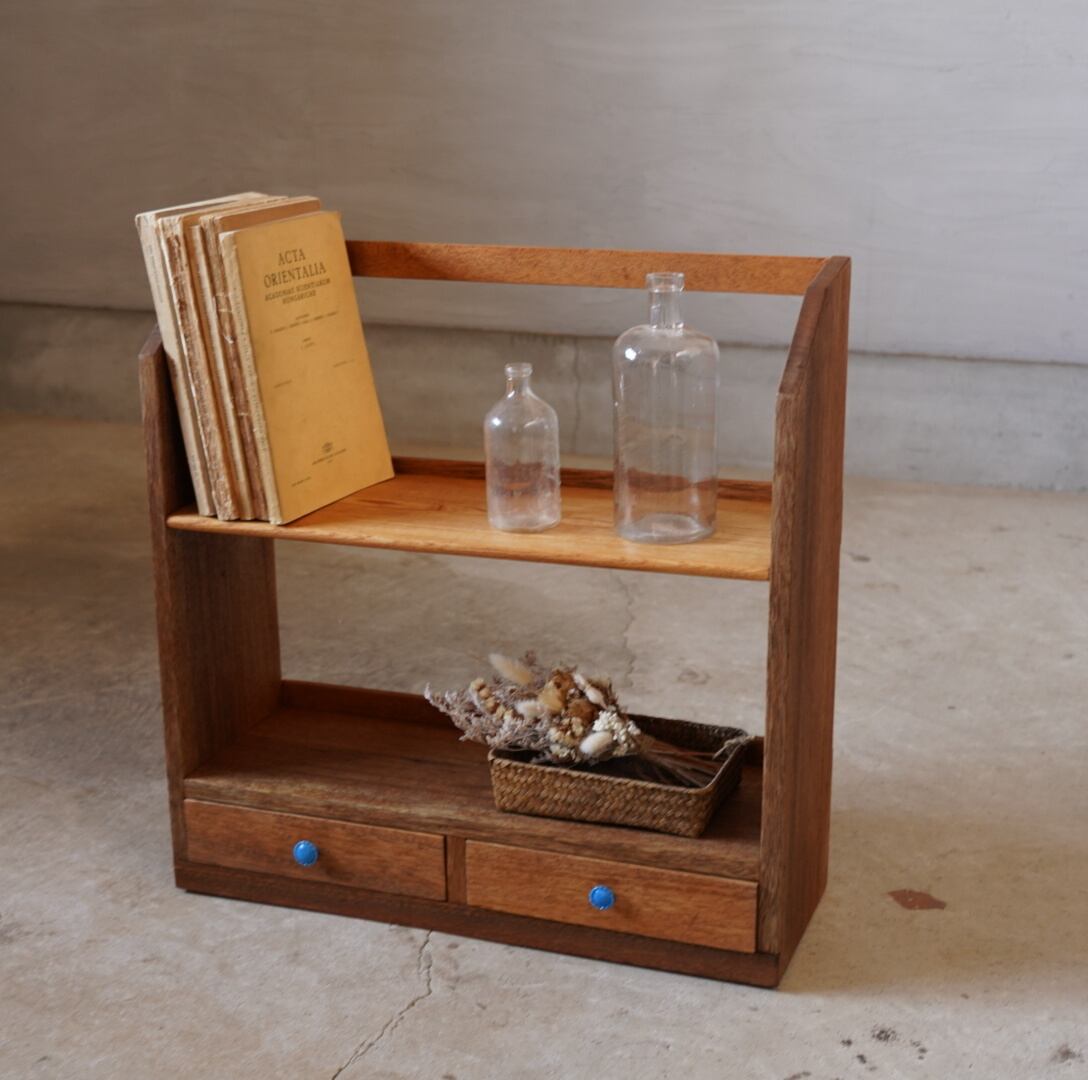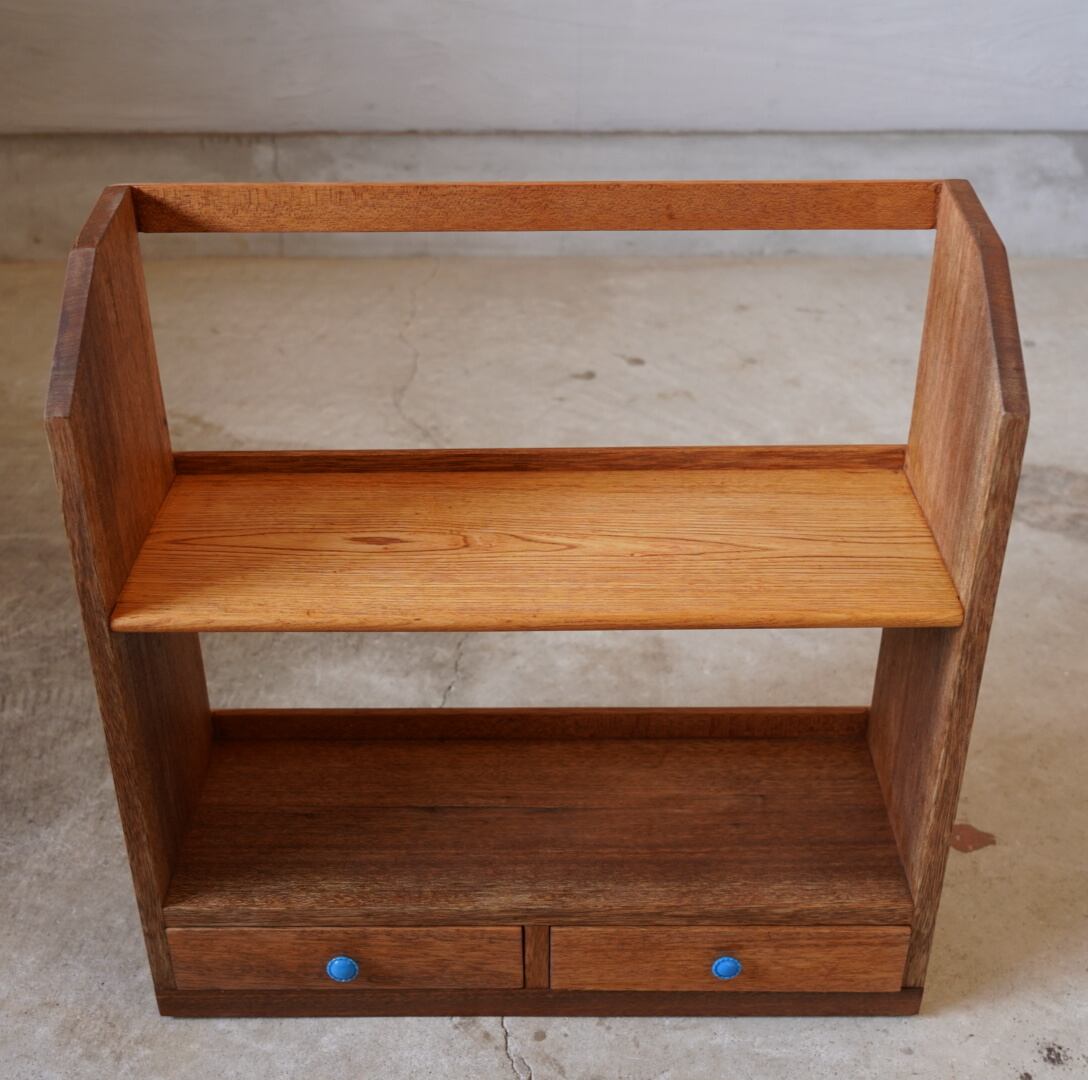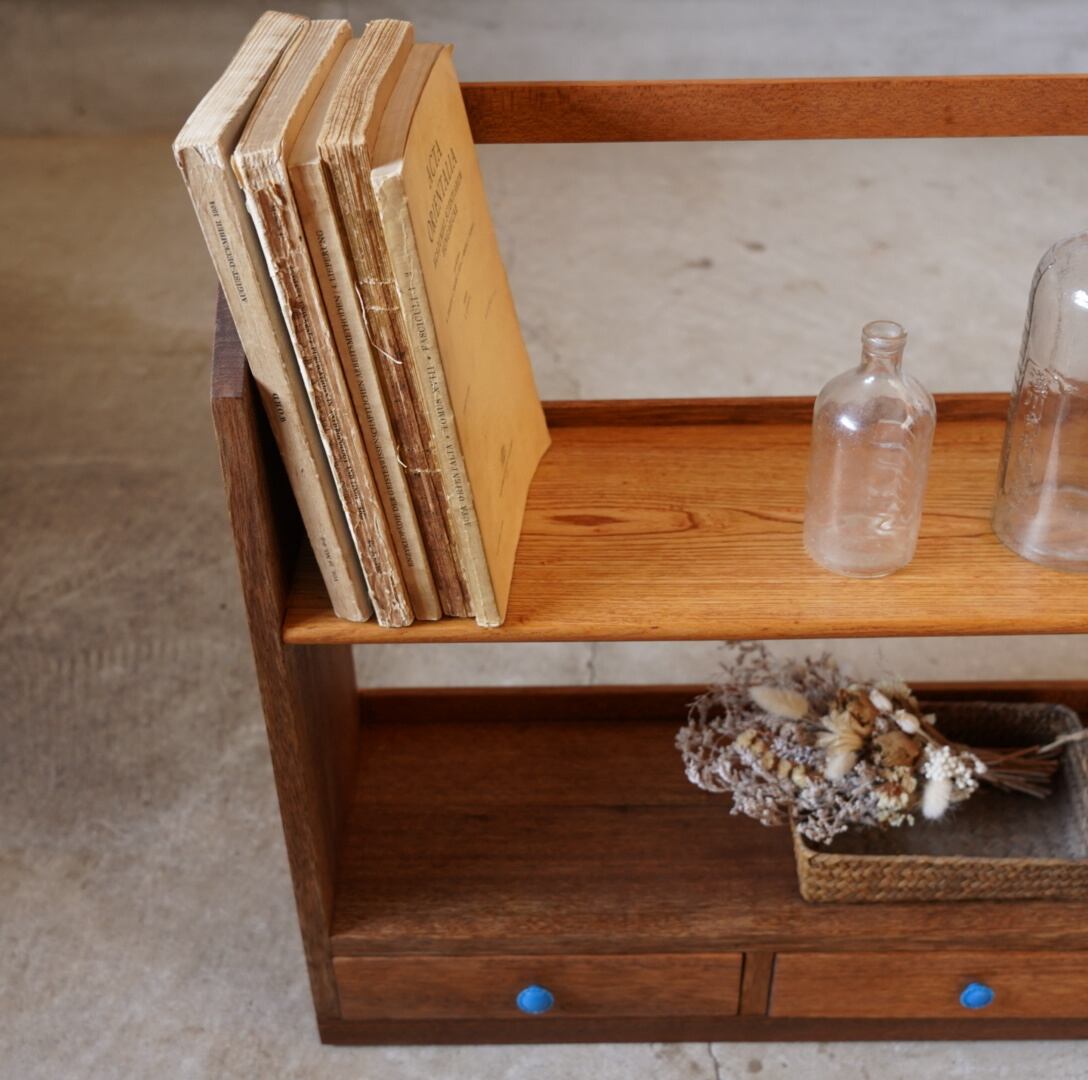無垢材の温かみのある経年変化と青いつまみの引き出しが可愛らしいブックスタンドです。