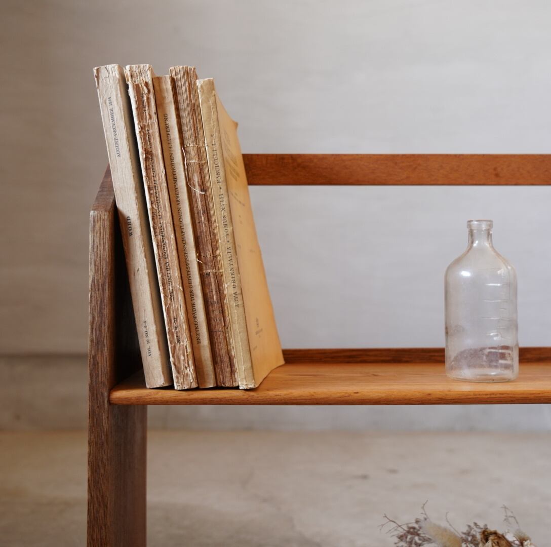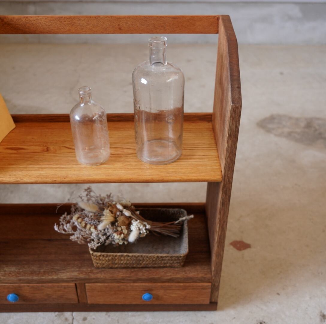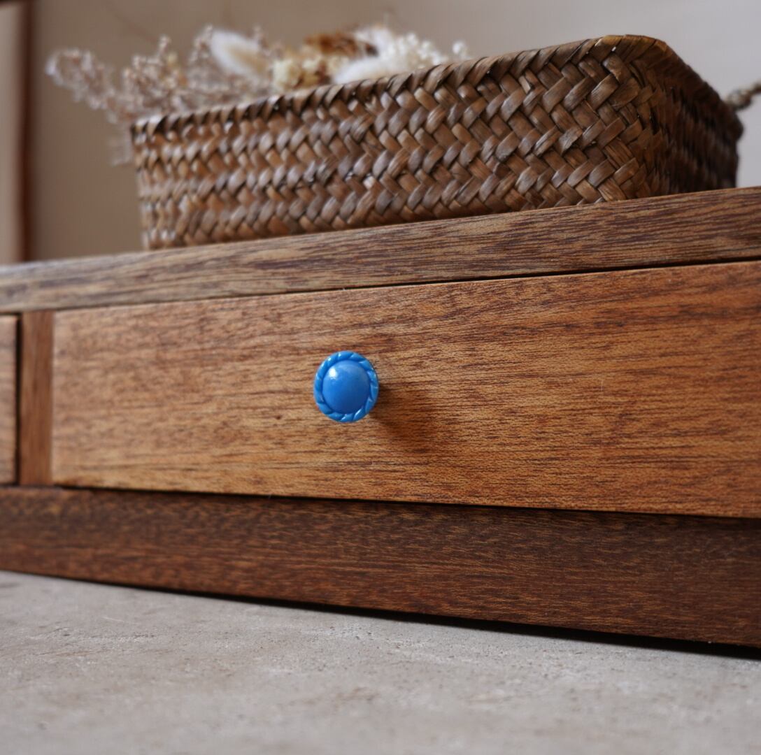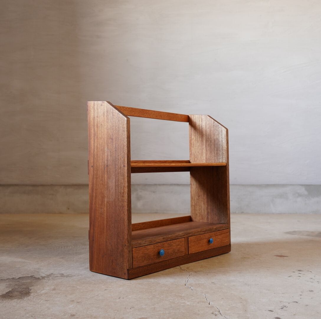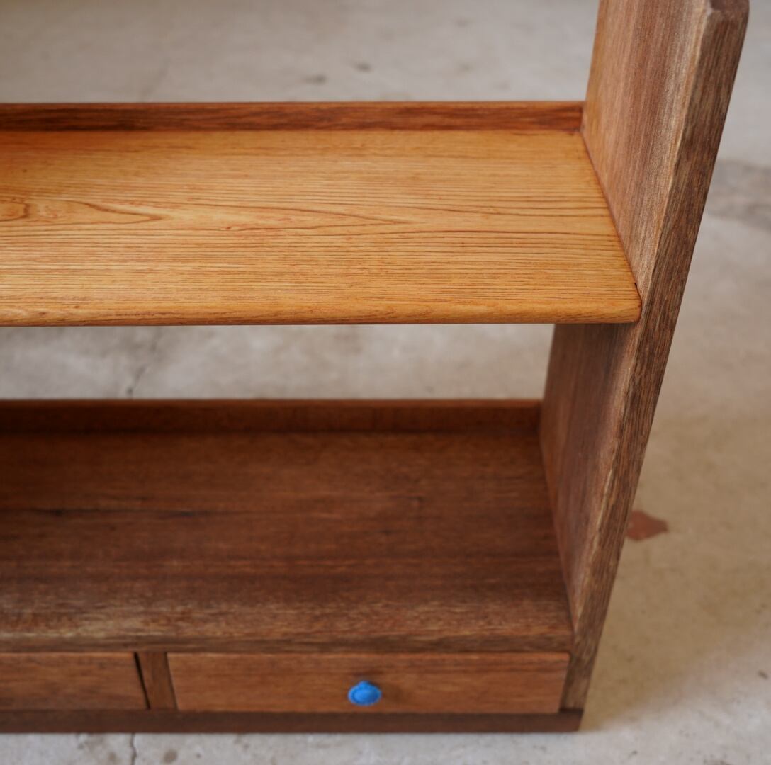 無垢材の温かみのある経年変化と青いつまみの引き出しが可愛らしいブックスタンドです。