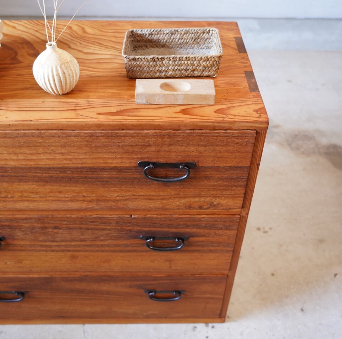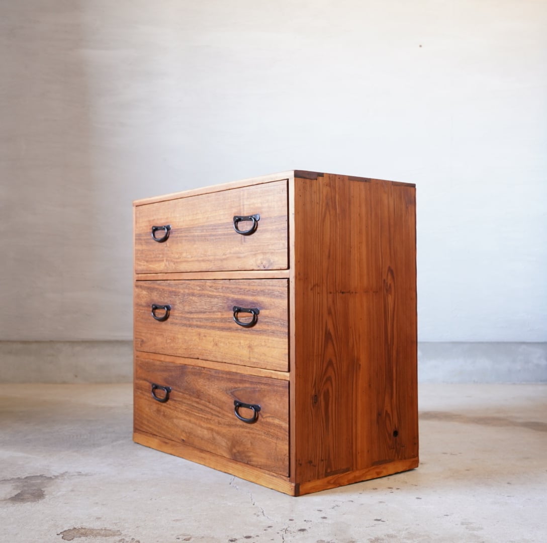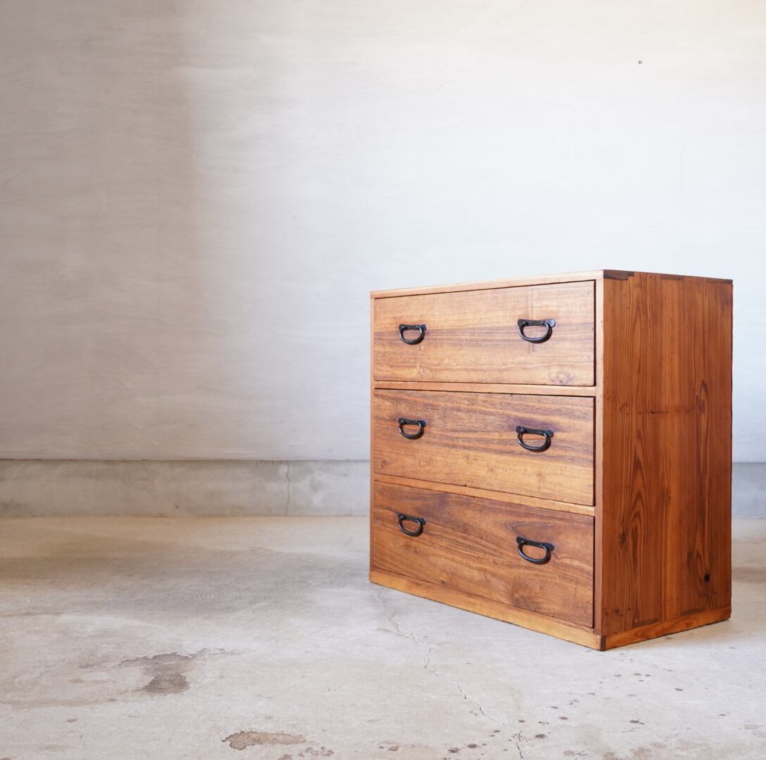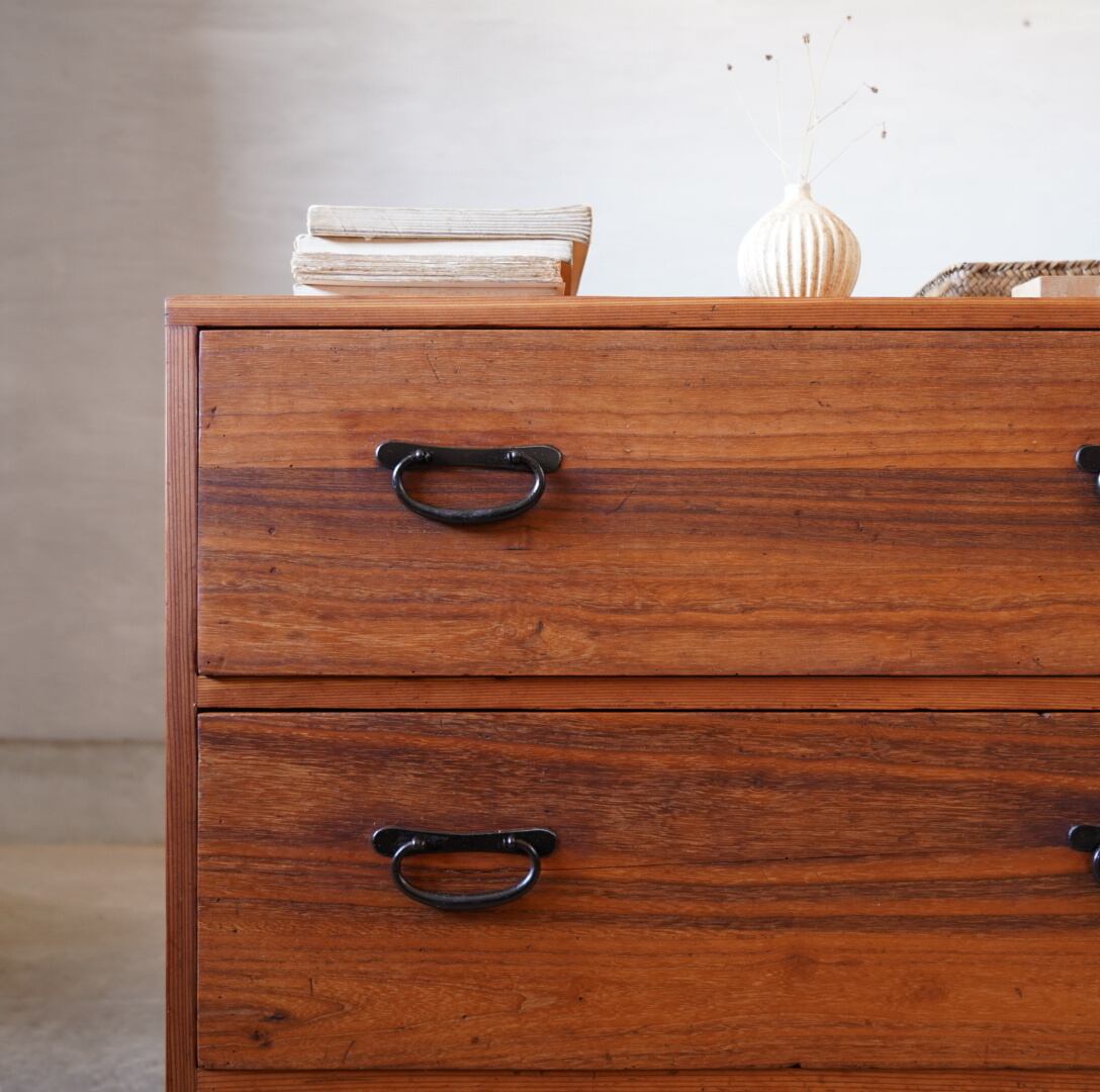 無垢材の味わい深い経年変化と並んだ金属の取手がとても雰囲気の良いチェストです。