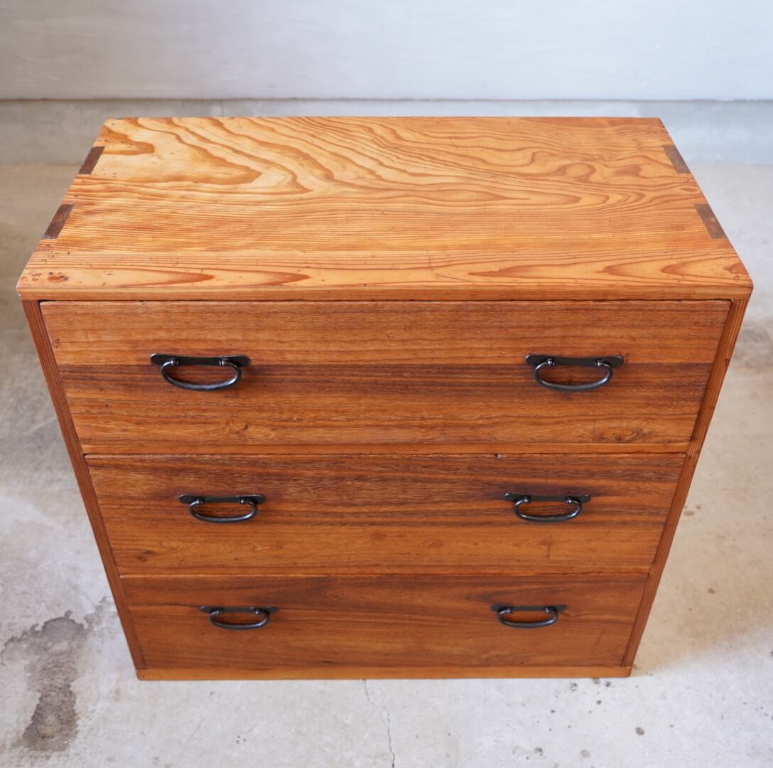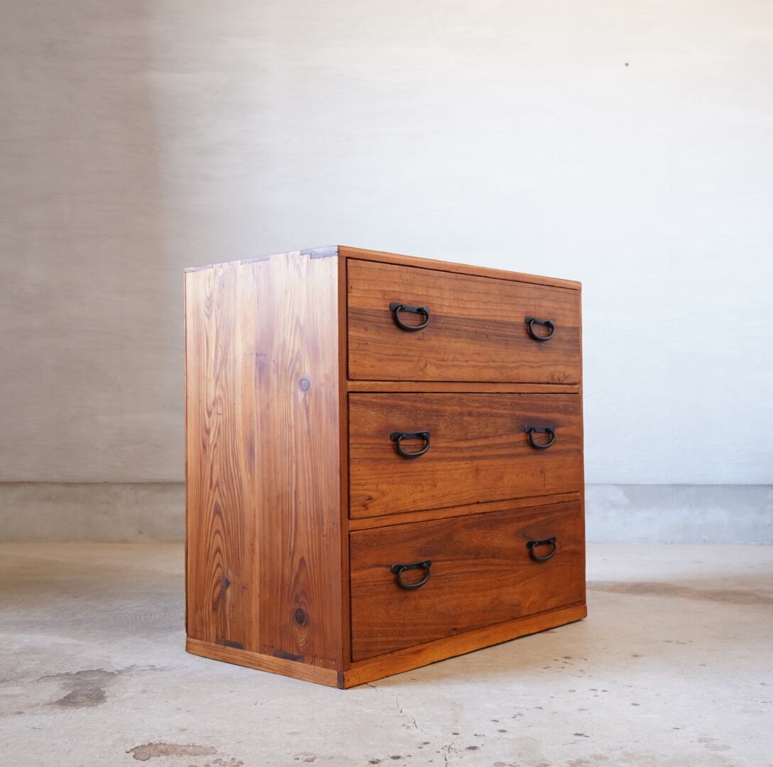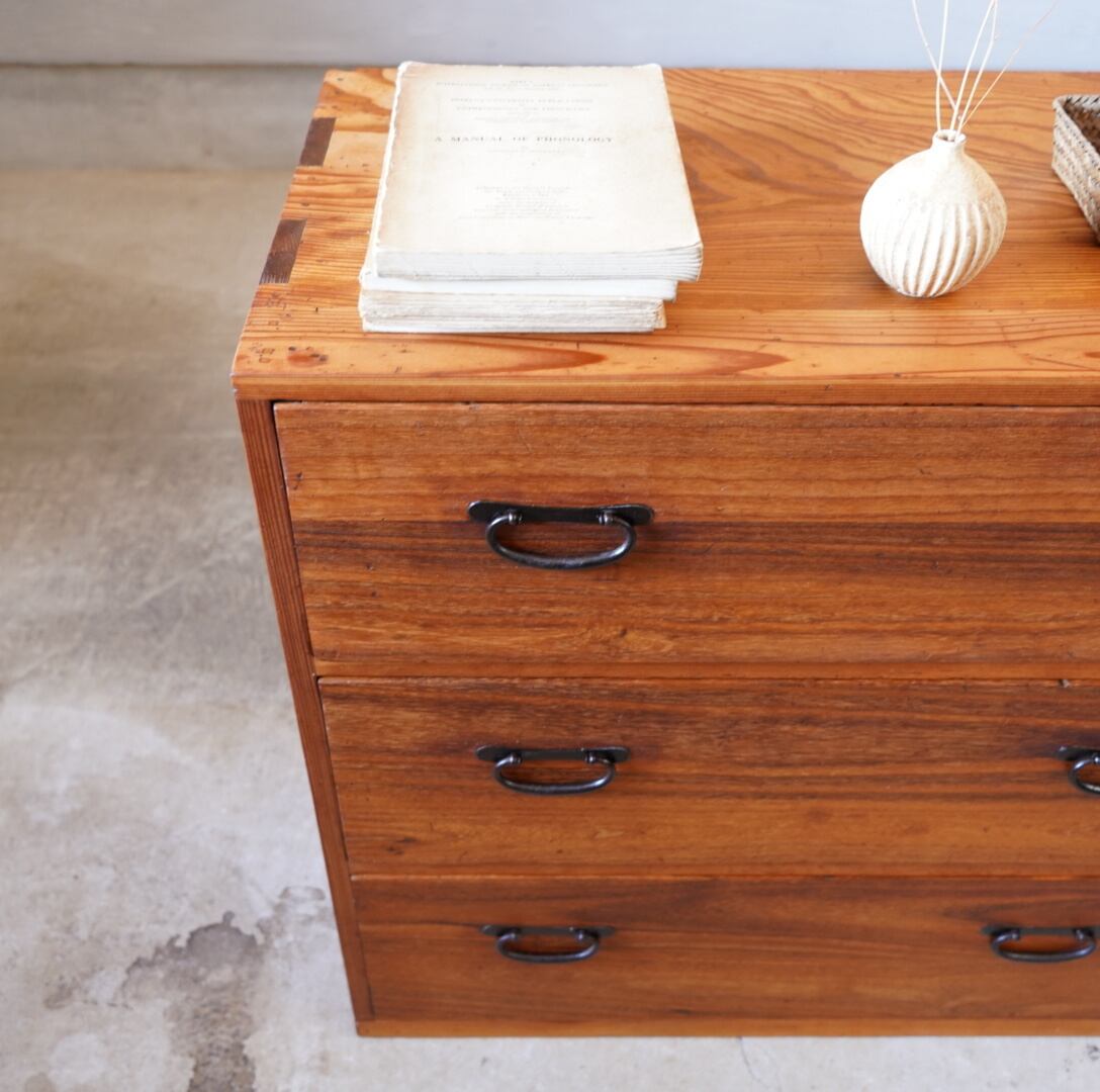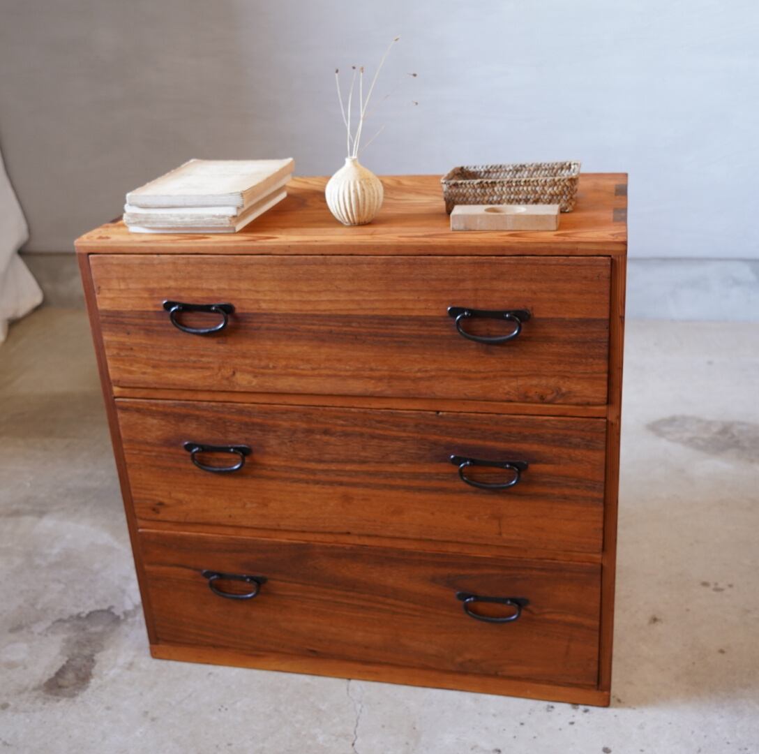無垢材の味わい深い経年変化と並んだ金属の取手がとても雰囲気の良いチェストです。