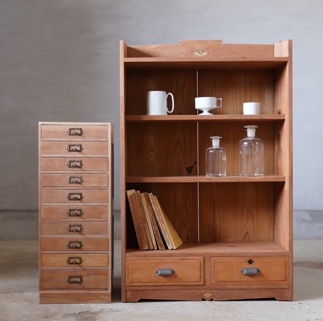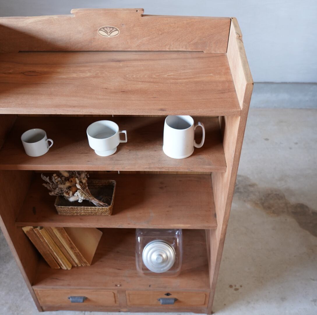 無垢材の温かみのある木味と金属の取手がついた2杯の引き出しが美しい木製棚です。