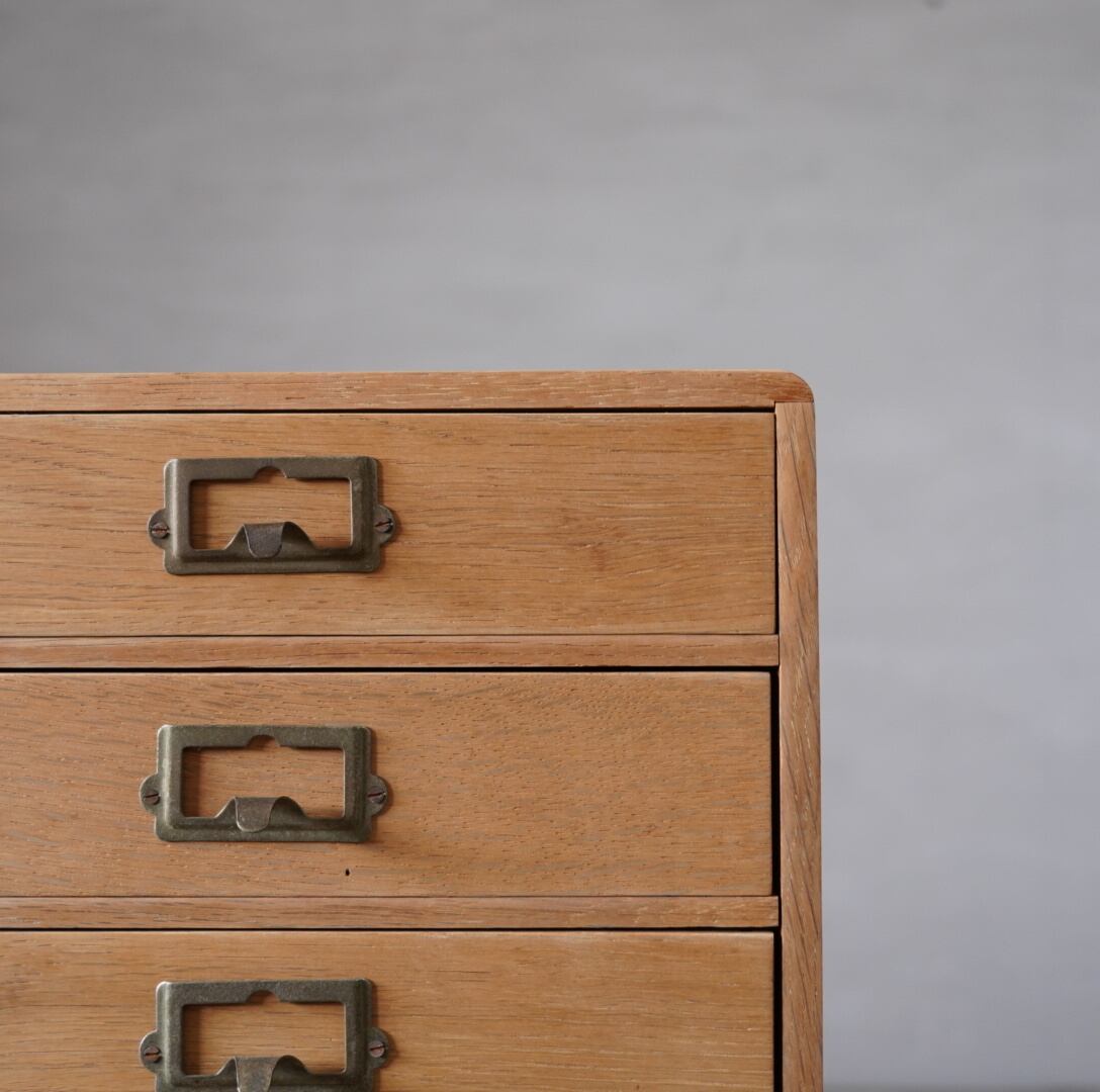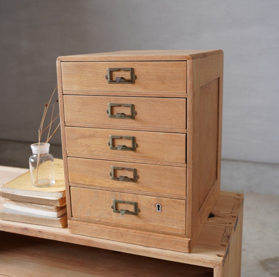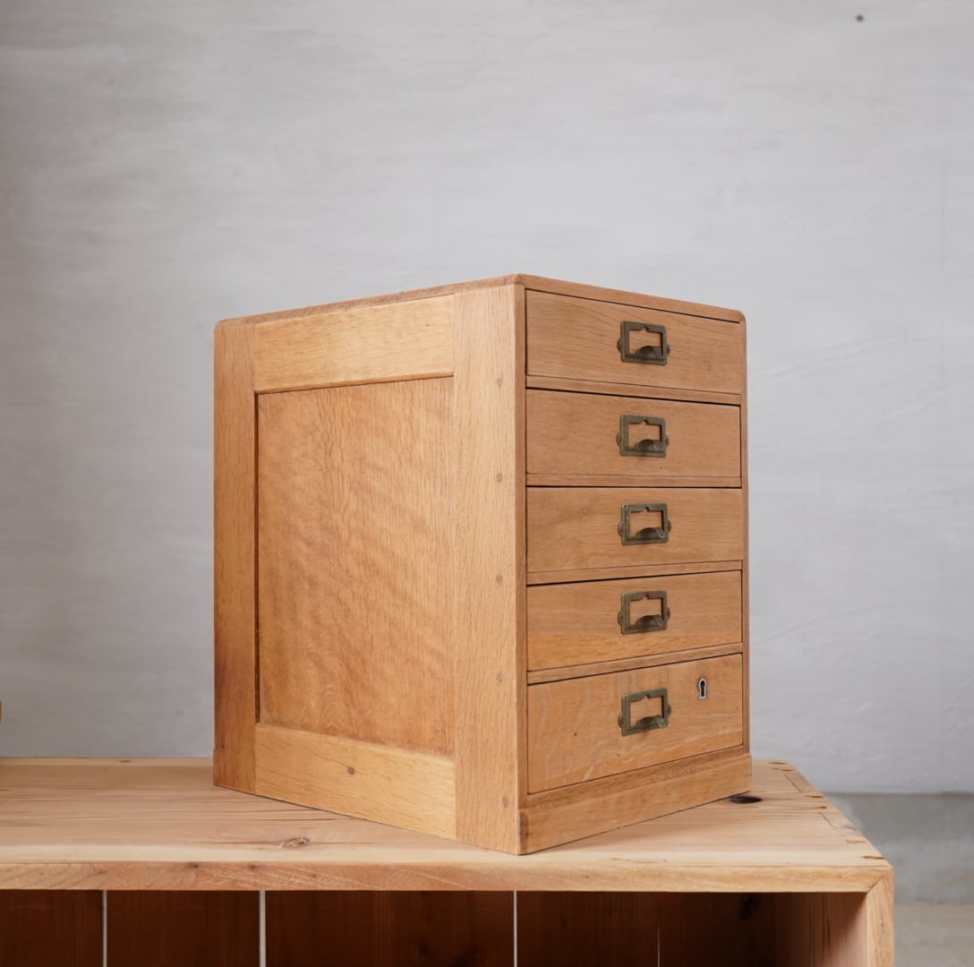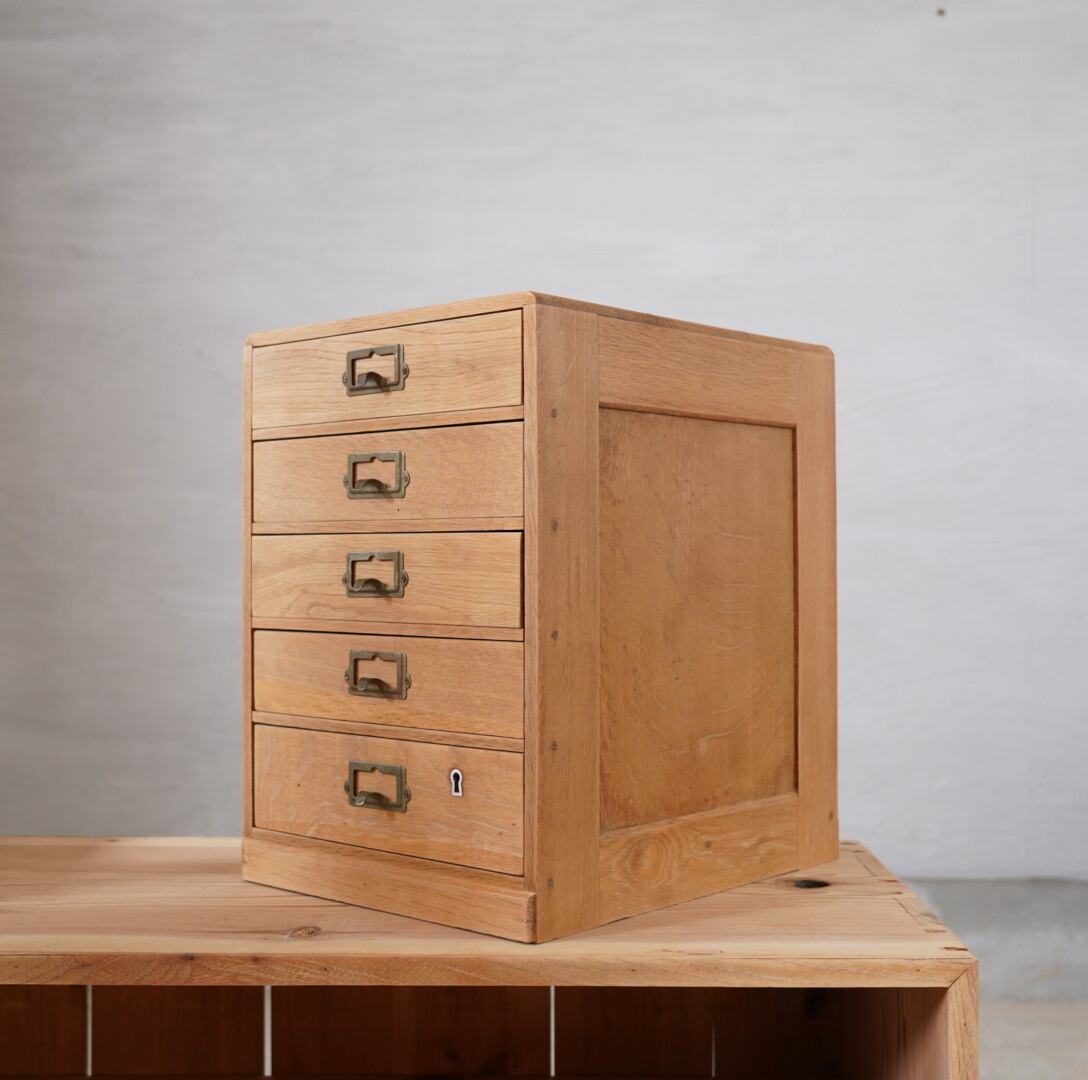 楢材の温かみのある木味と経年変化のあるネームプレートが可愛らしい5杯の引き出しです。