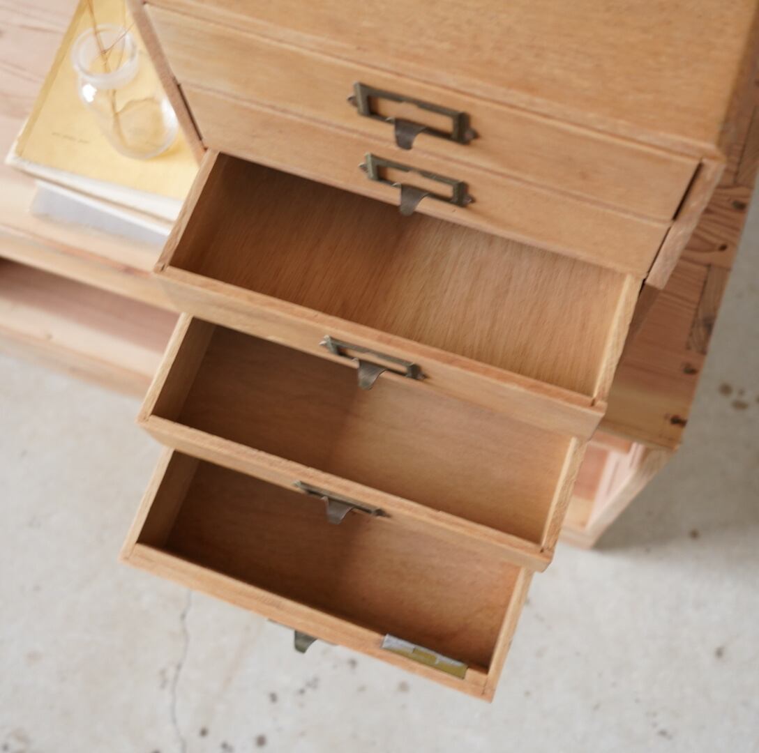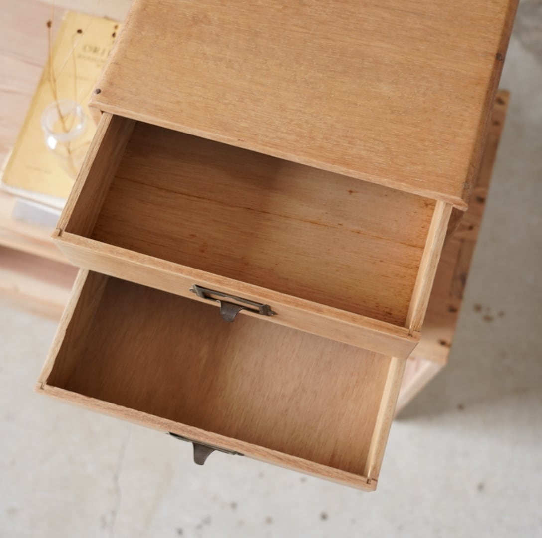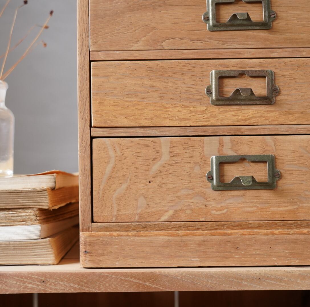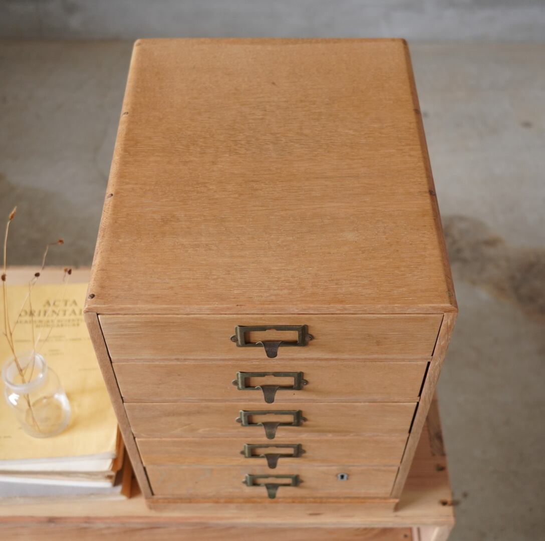 楢材の温かみのある木味と経年変化のあるネームプレートが可愛らしい5杯の引き出しです。