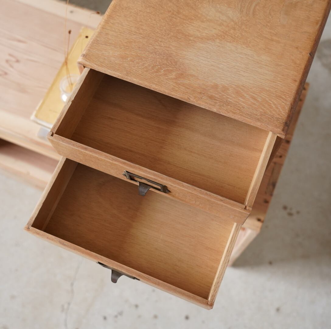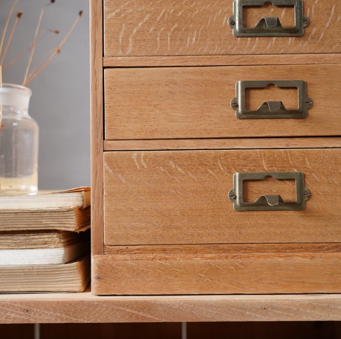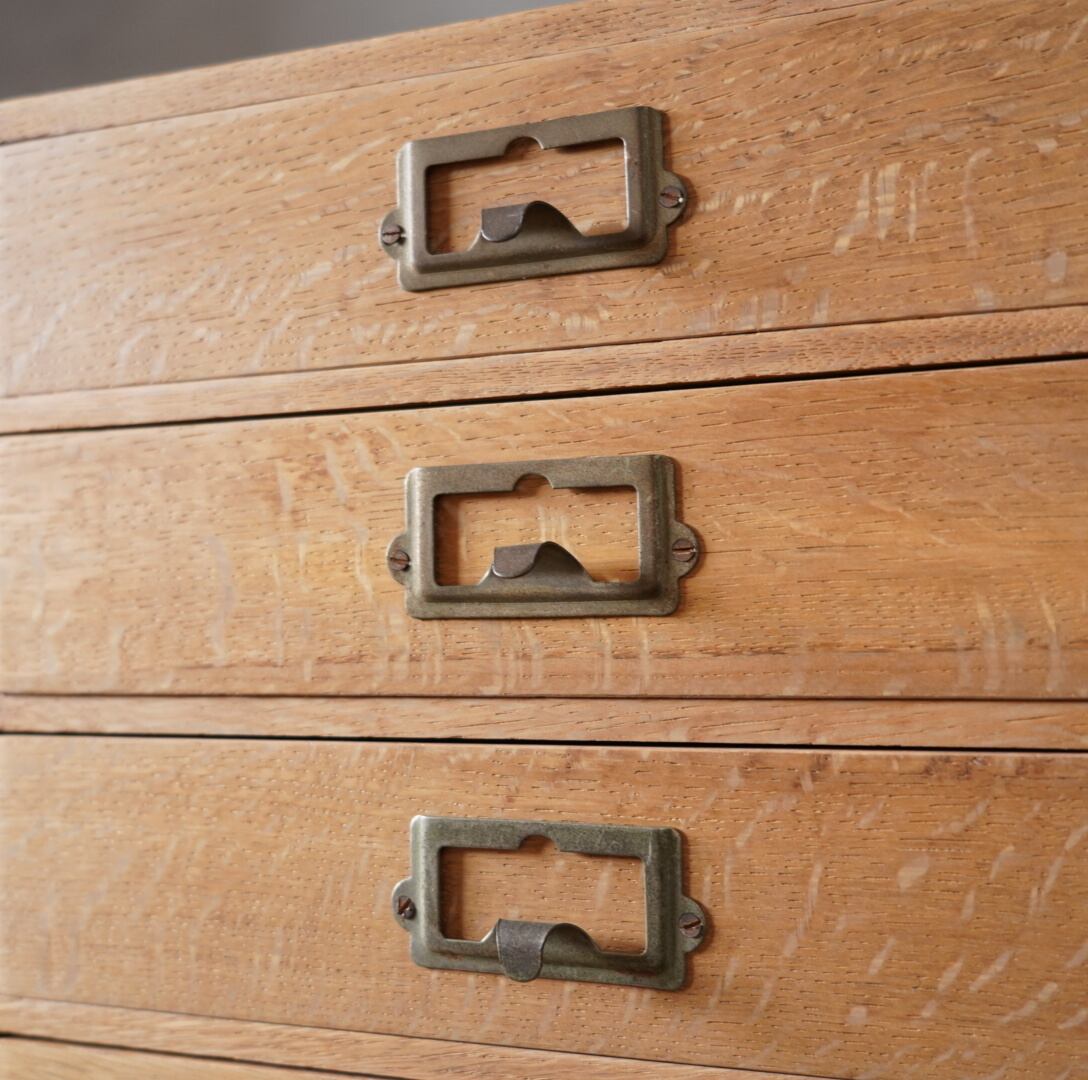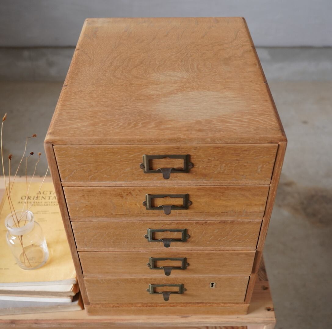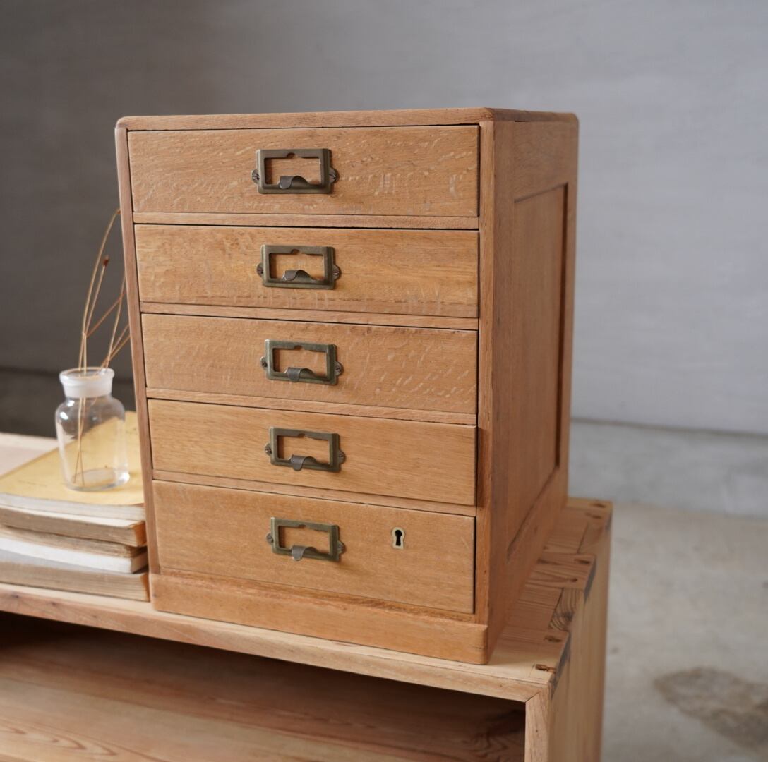 楢材の温かみのある木味と経年変化のあるネームプレートが可愛らしい5杯の引き出しです。