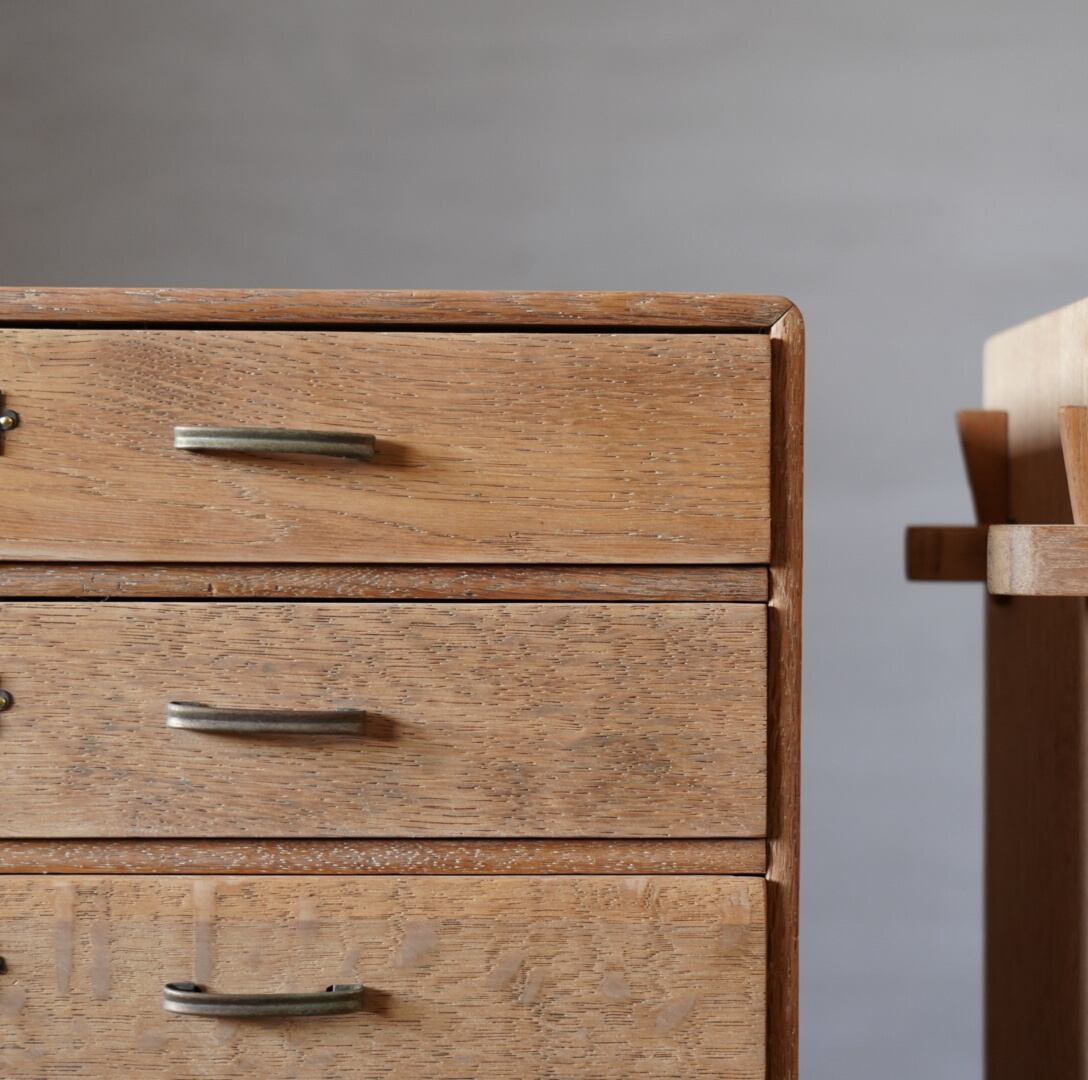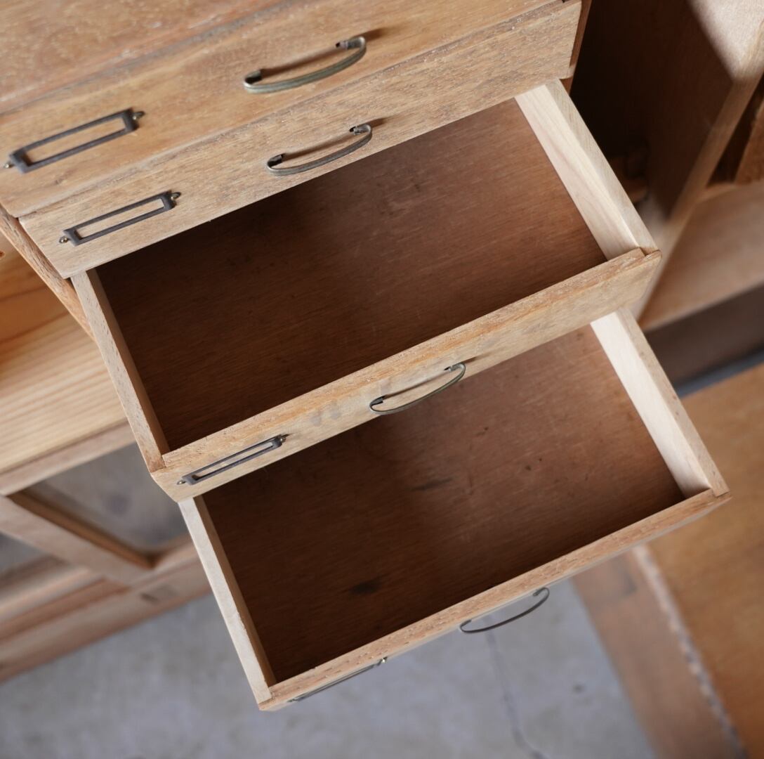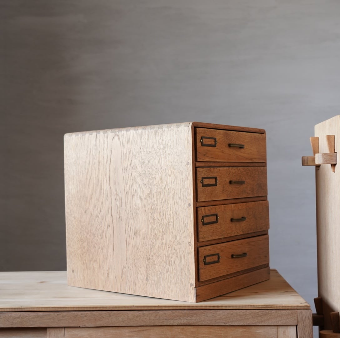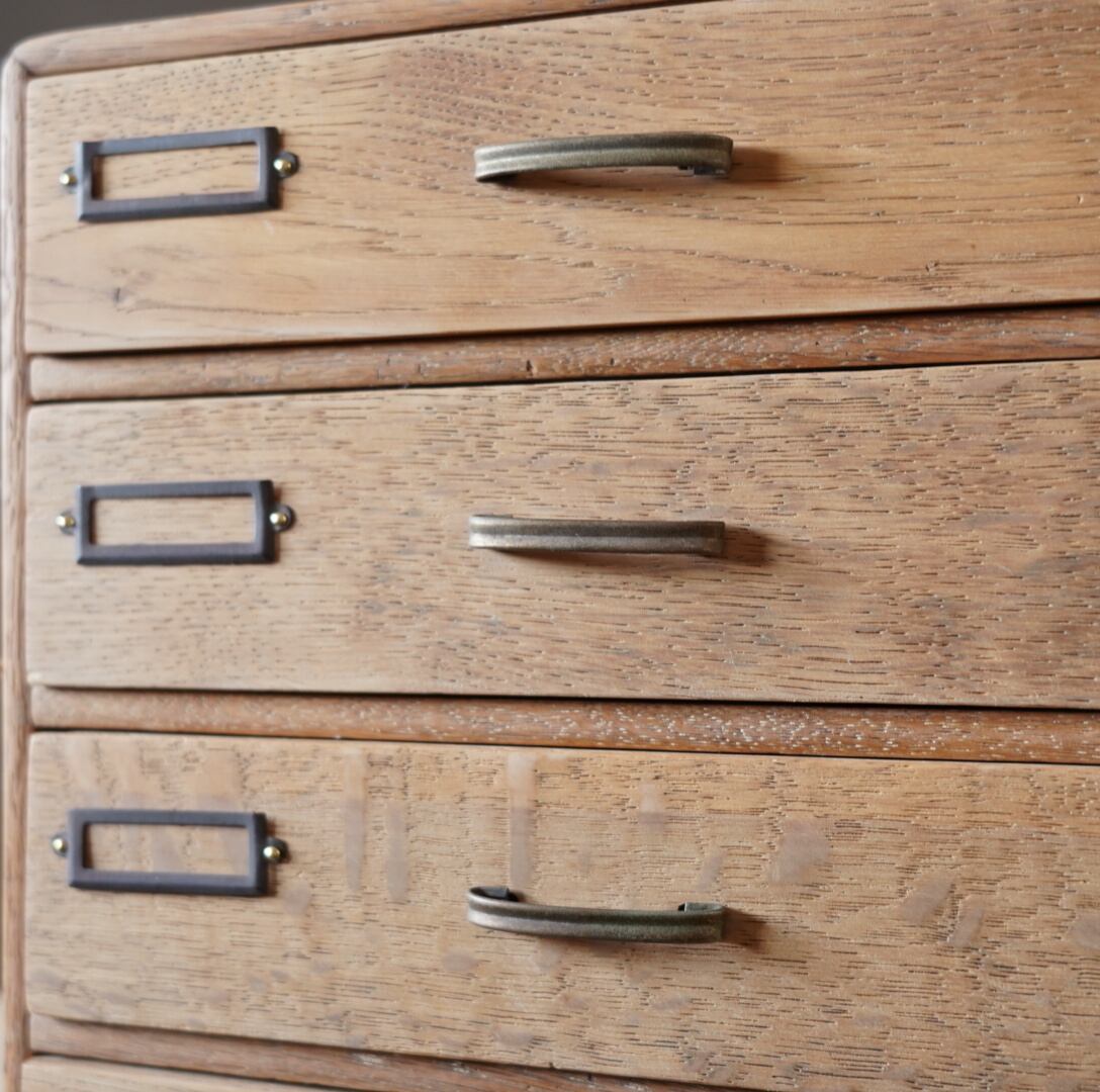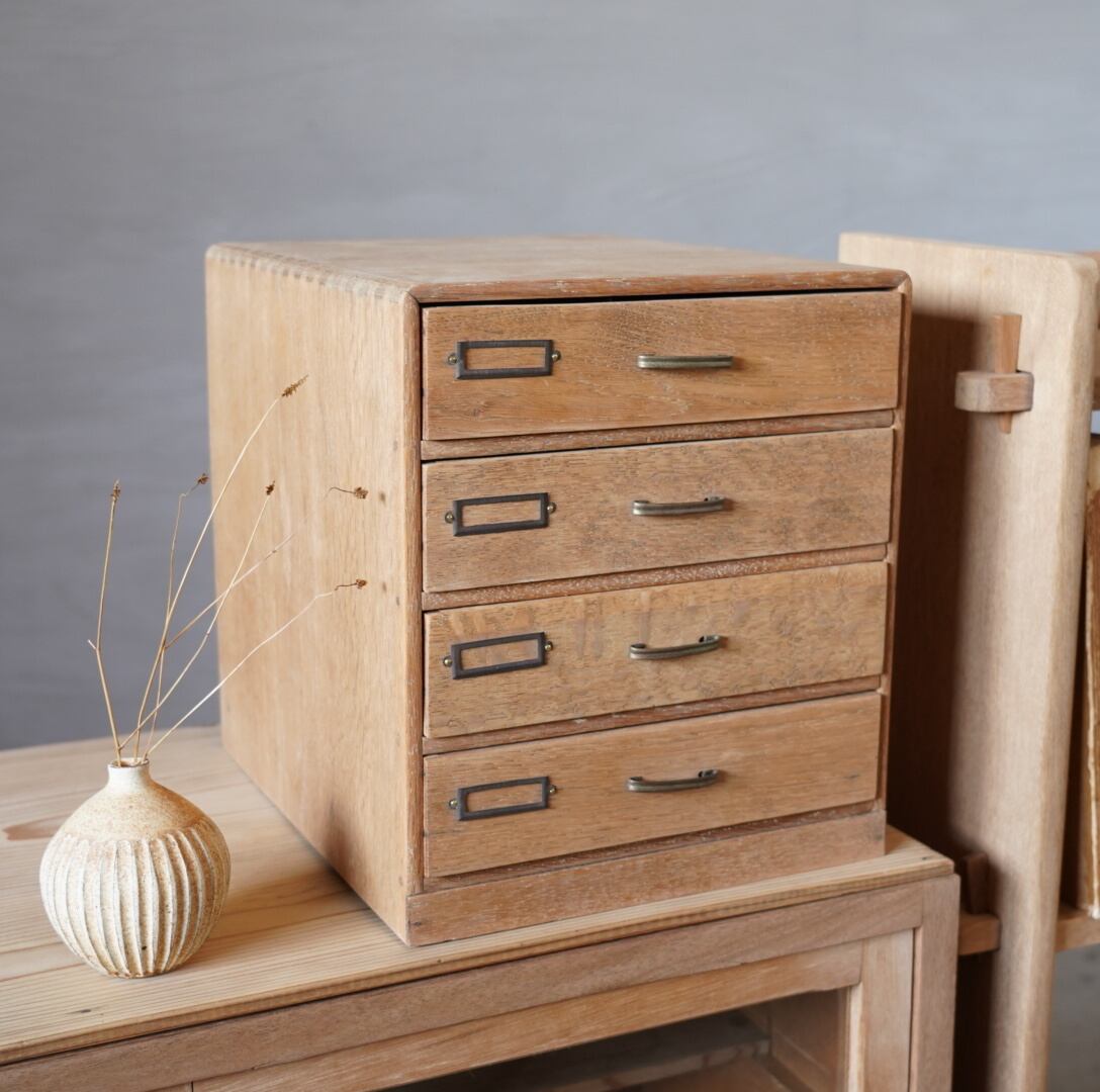 ナチュラルな木味、並んだ金属の取手とネームプレートが可愛らしい4杯の引き出し。
