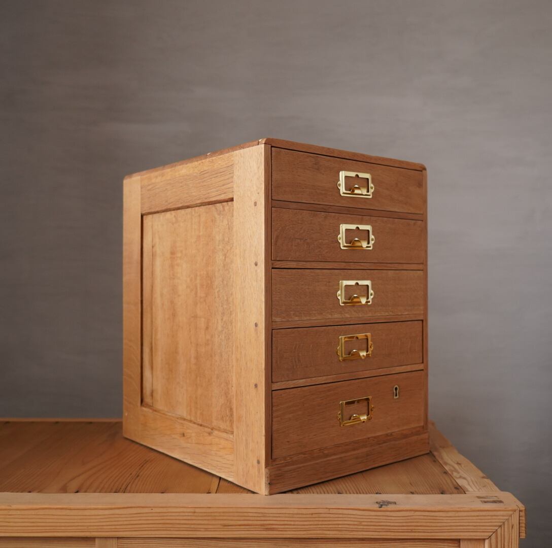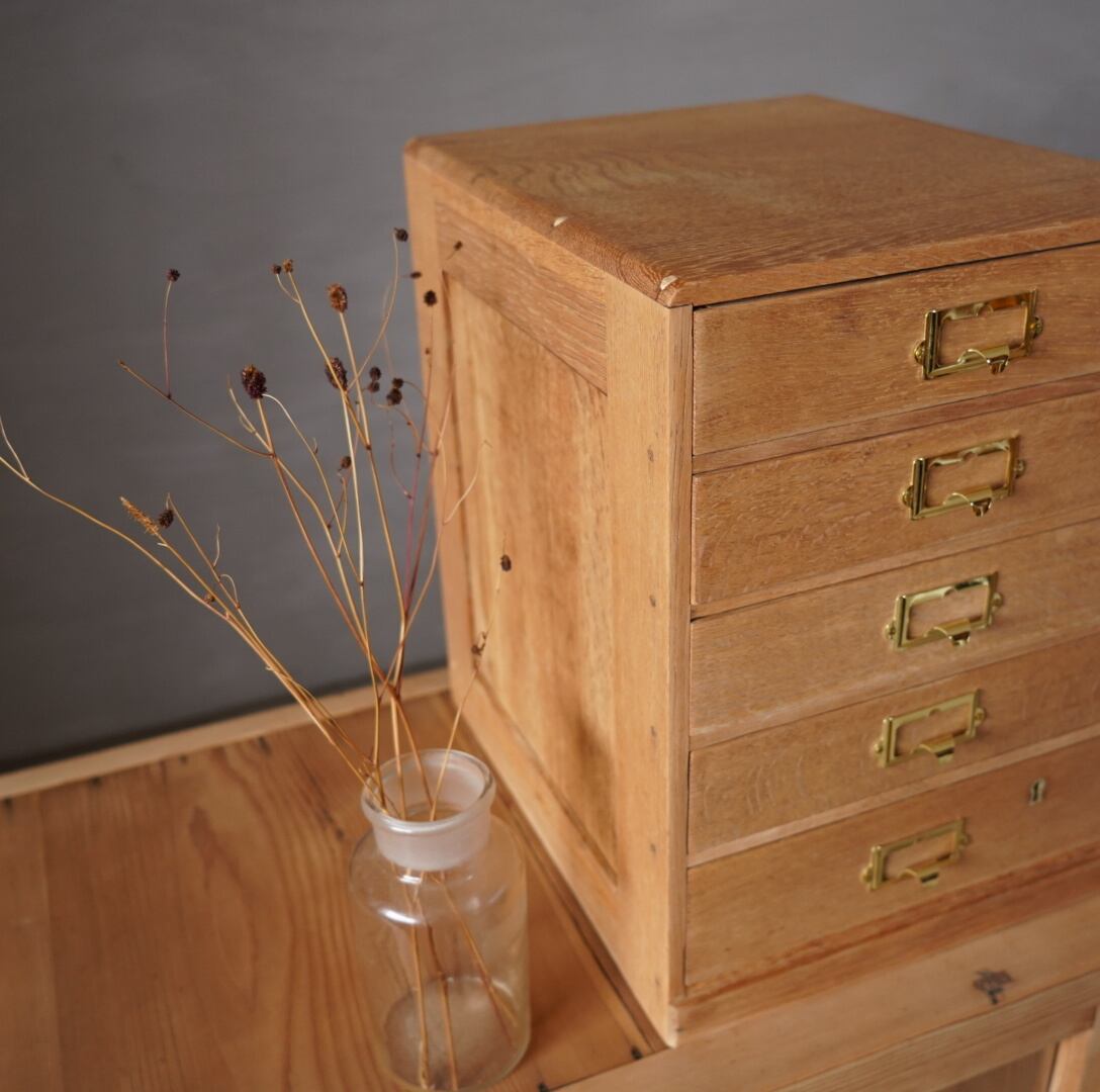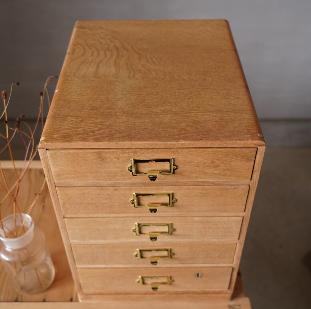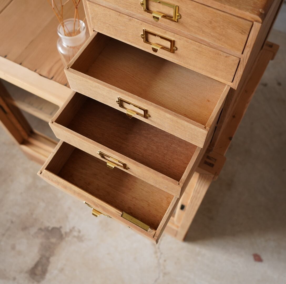 楢材の温かみのある木味とつまみのついた真鍮のネームプレートが可愛らしい5杯の引き出し。
