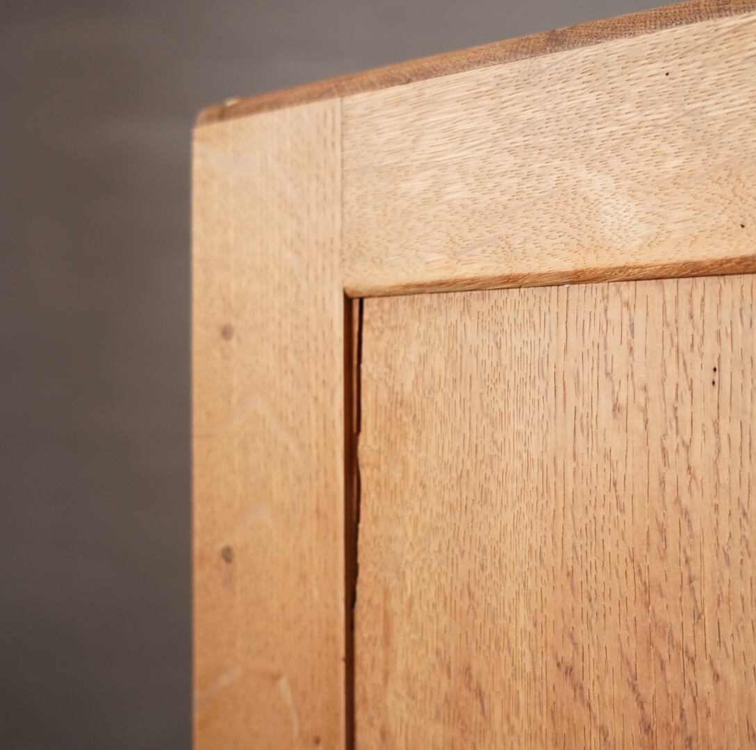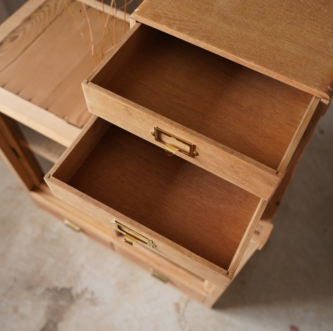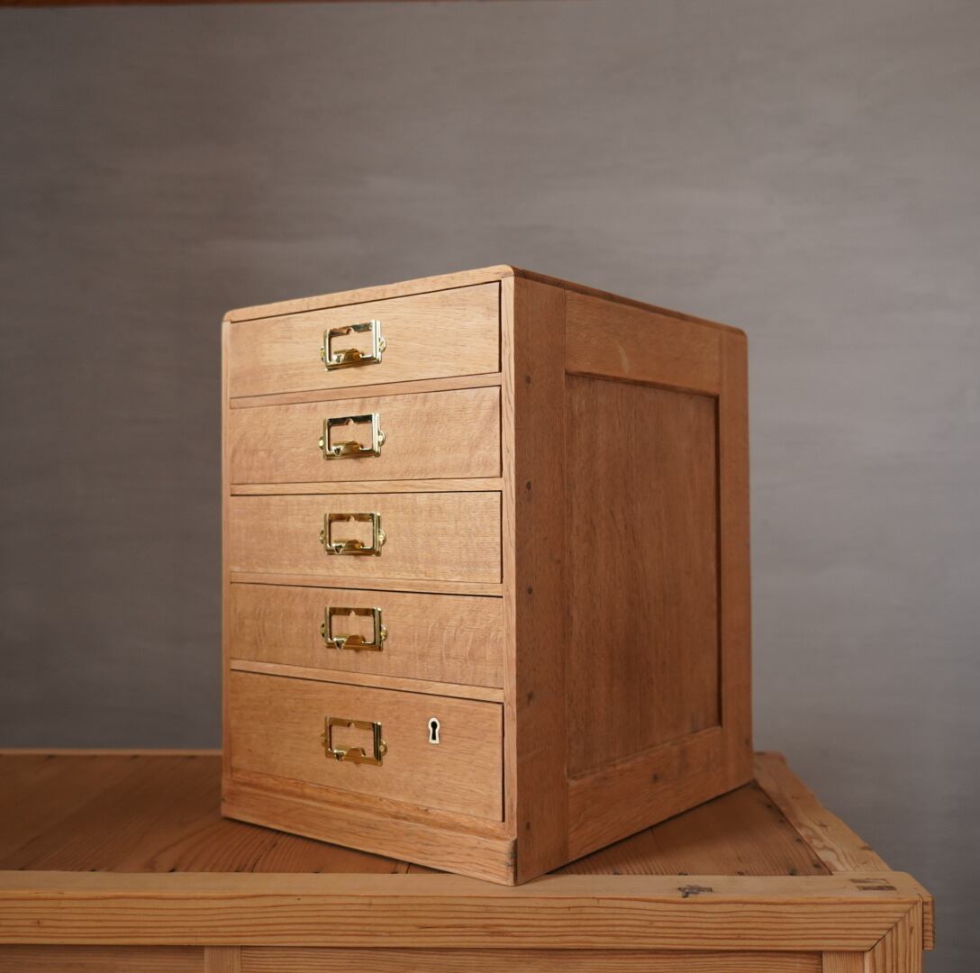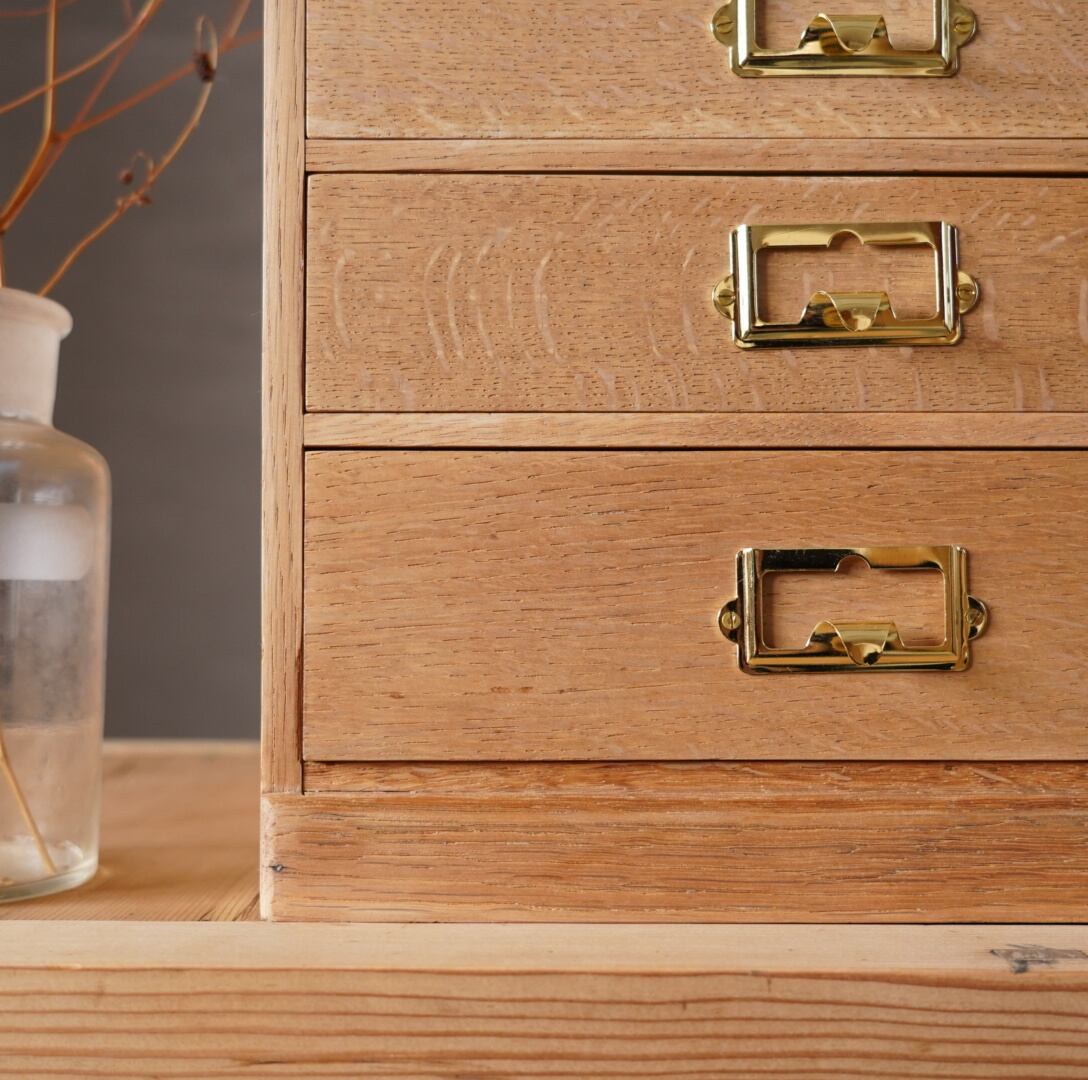楢材の温かみのある木味とつまみのついた真鍮のネームプレートが可愛らしい5杯の引き出し。