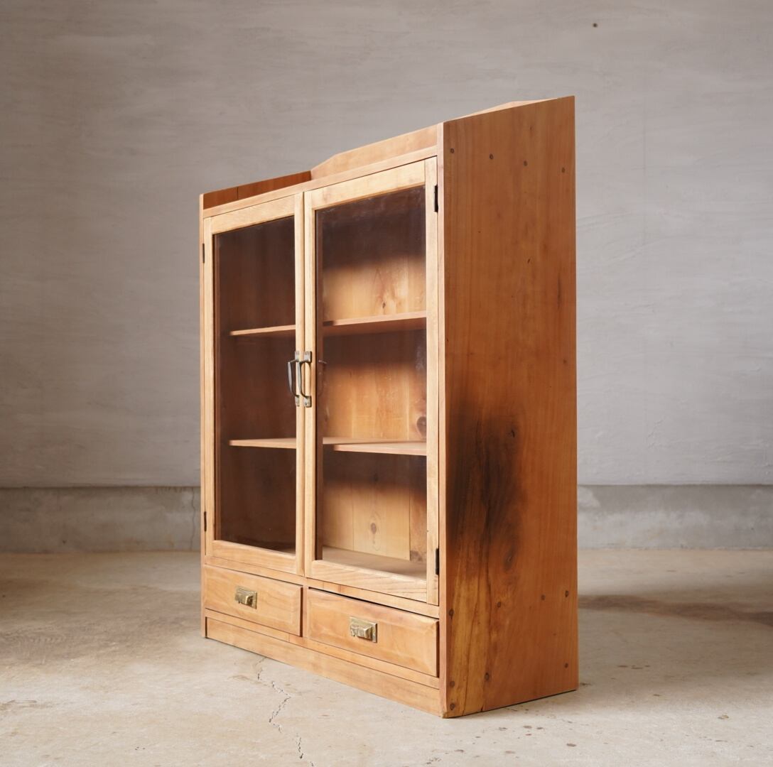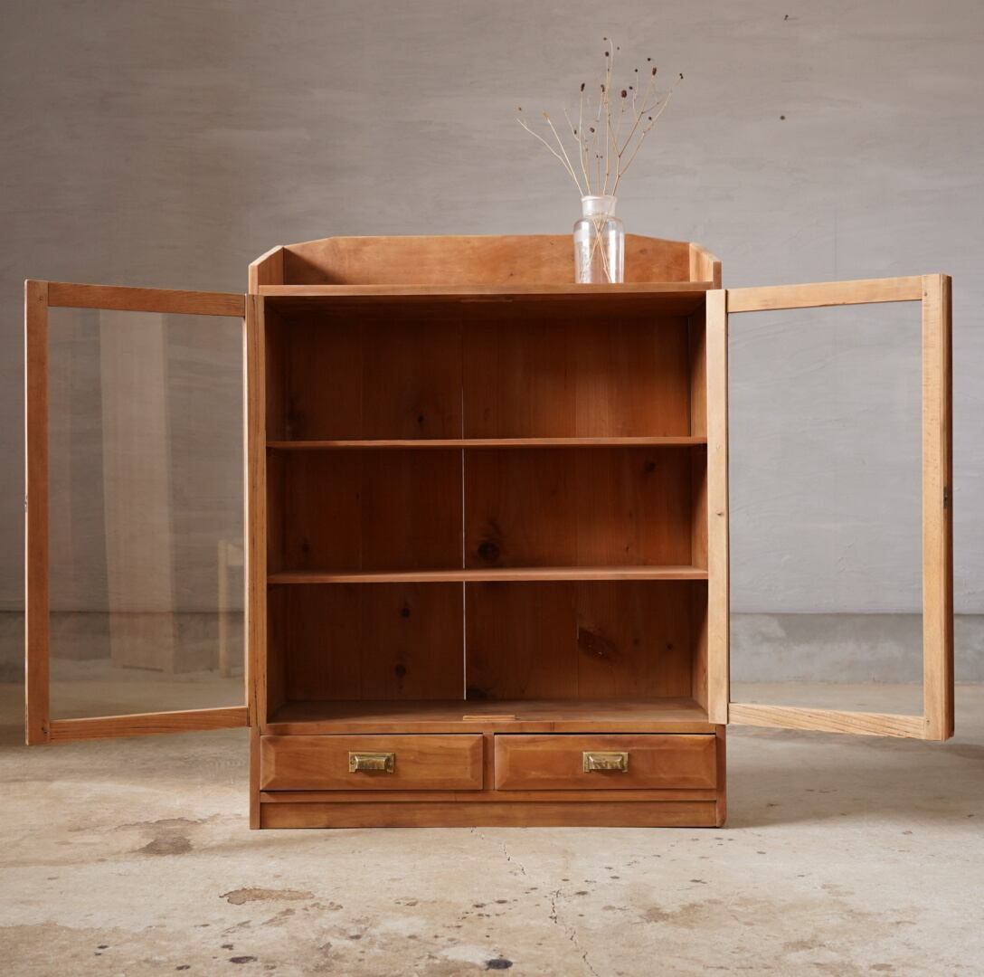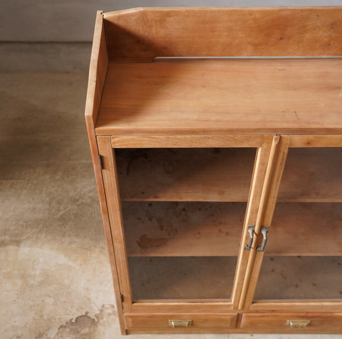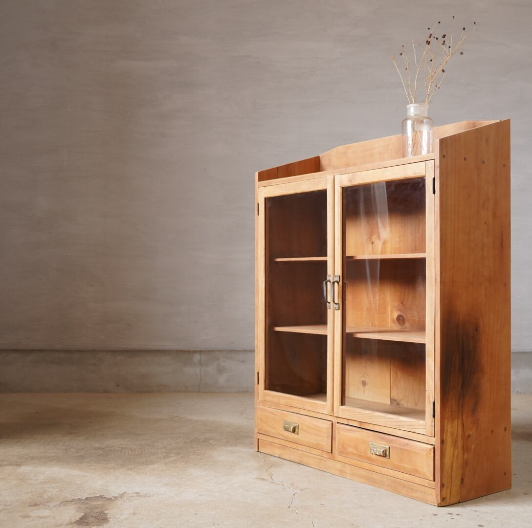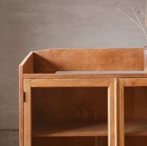 無垢材のナチュラルな木味と大きなガラスの開き戸が美しいキャビネット。
