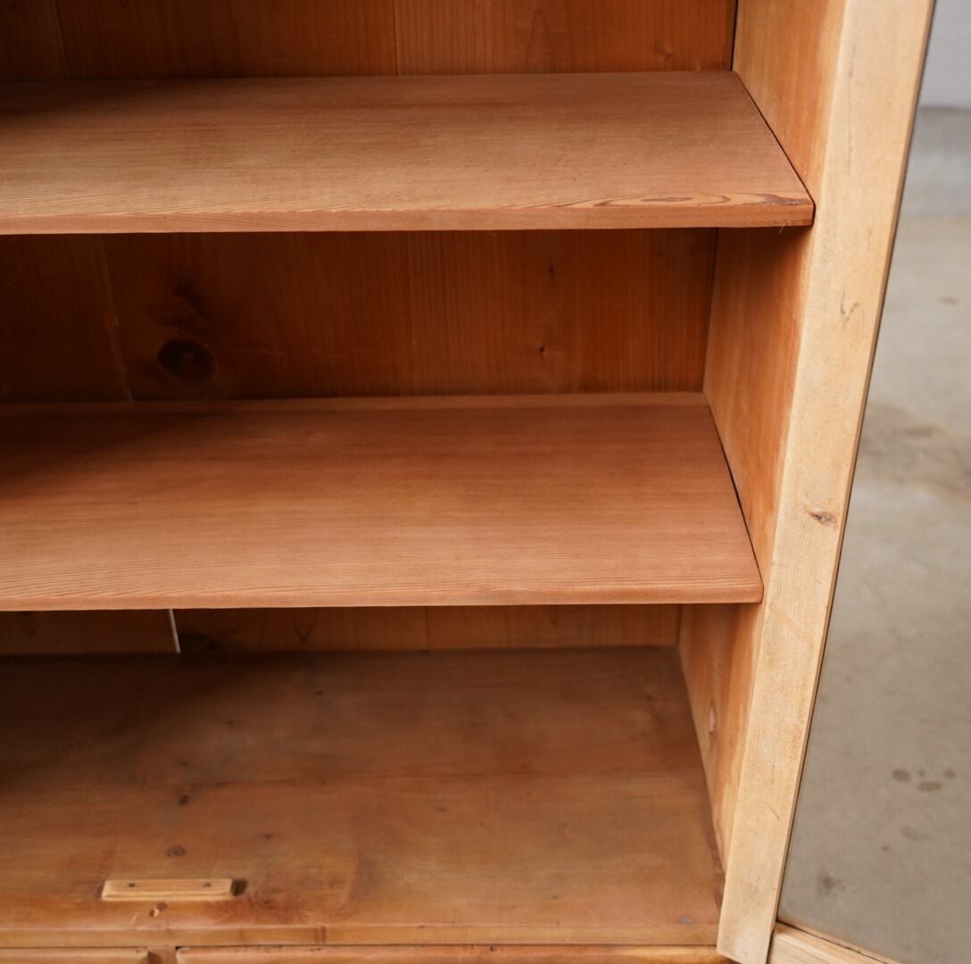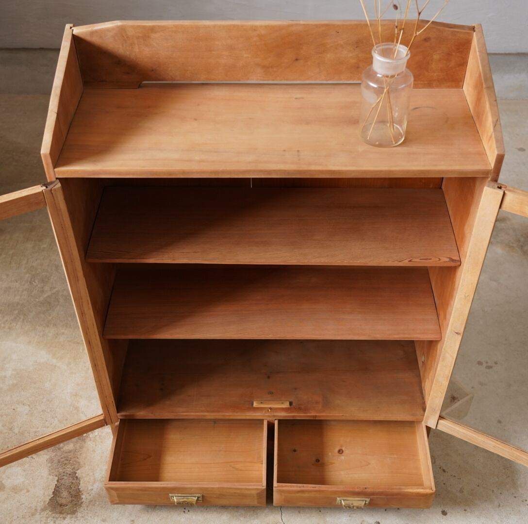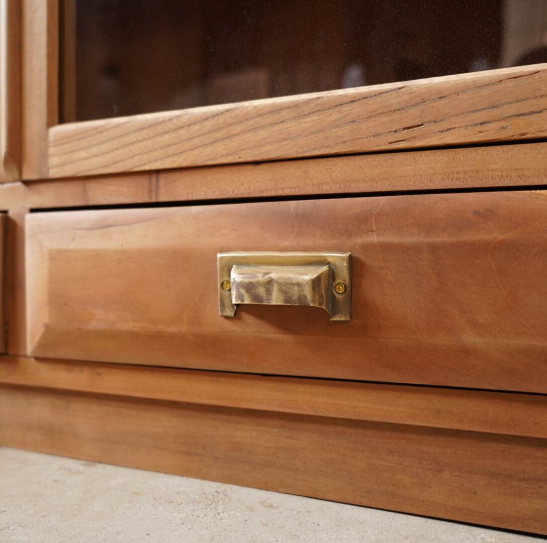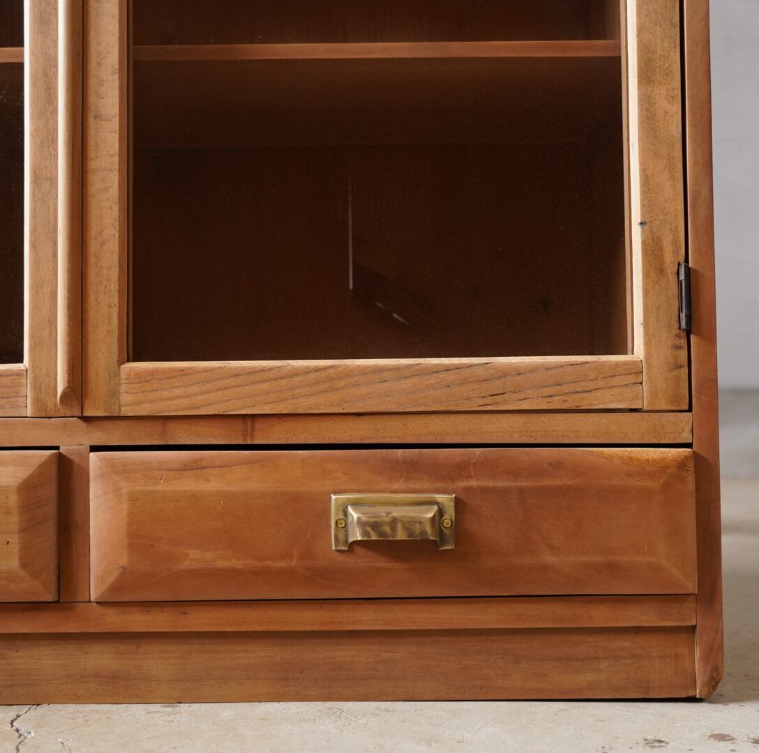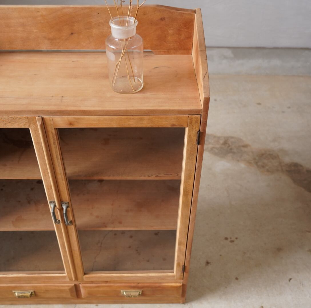 無垢材のナチュラルな木味と大きなガラスの開き戸が美しいキャビネット。