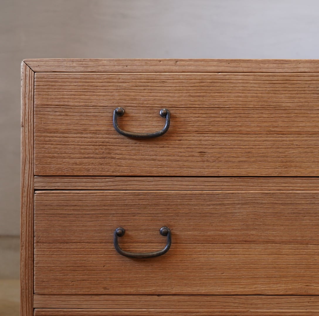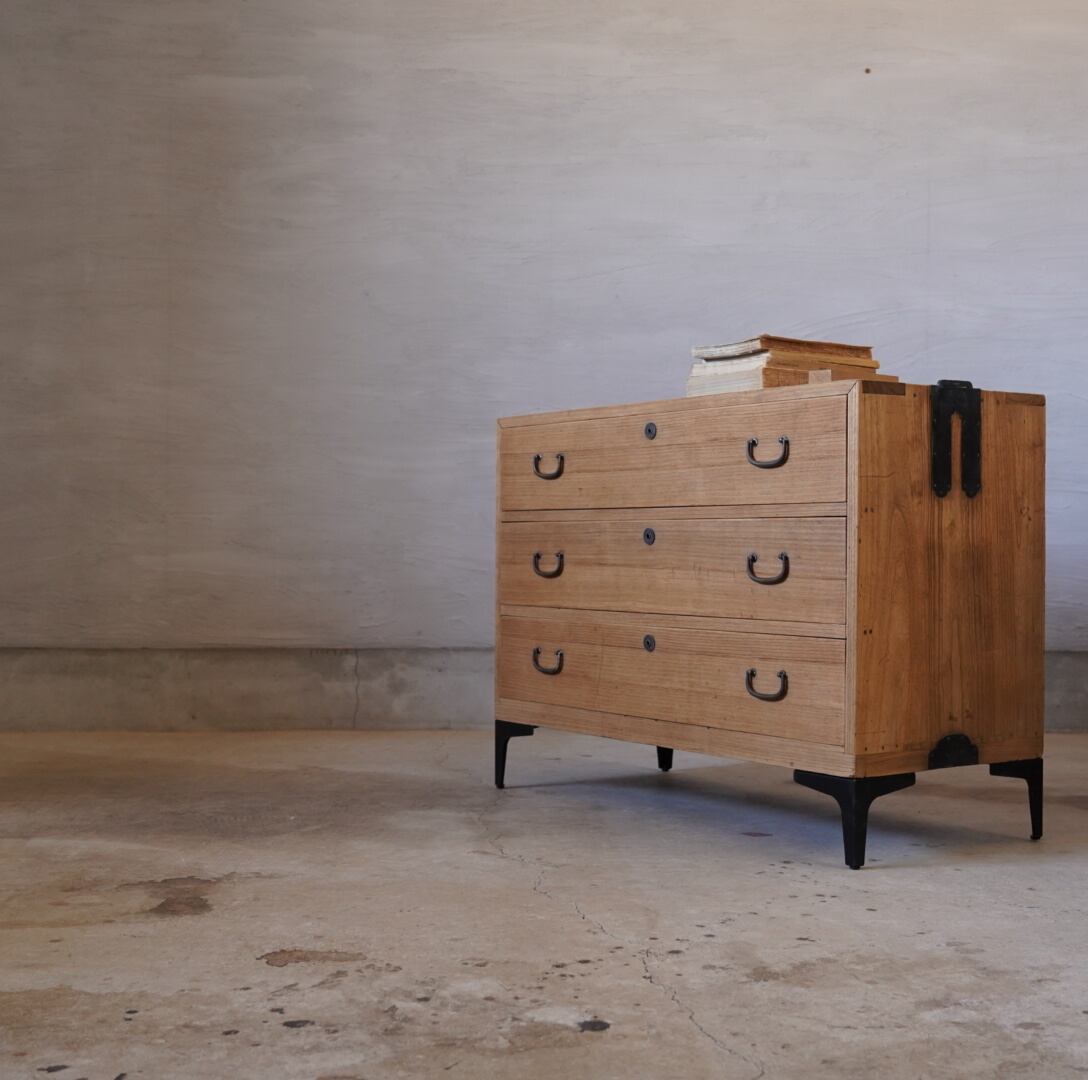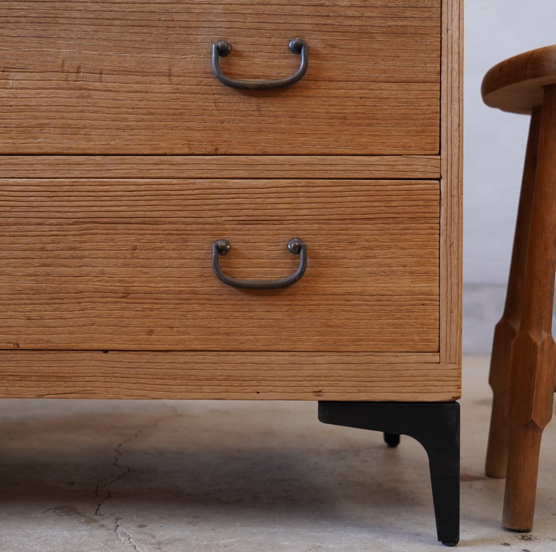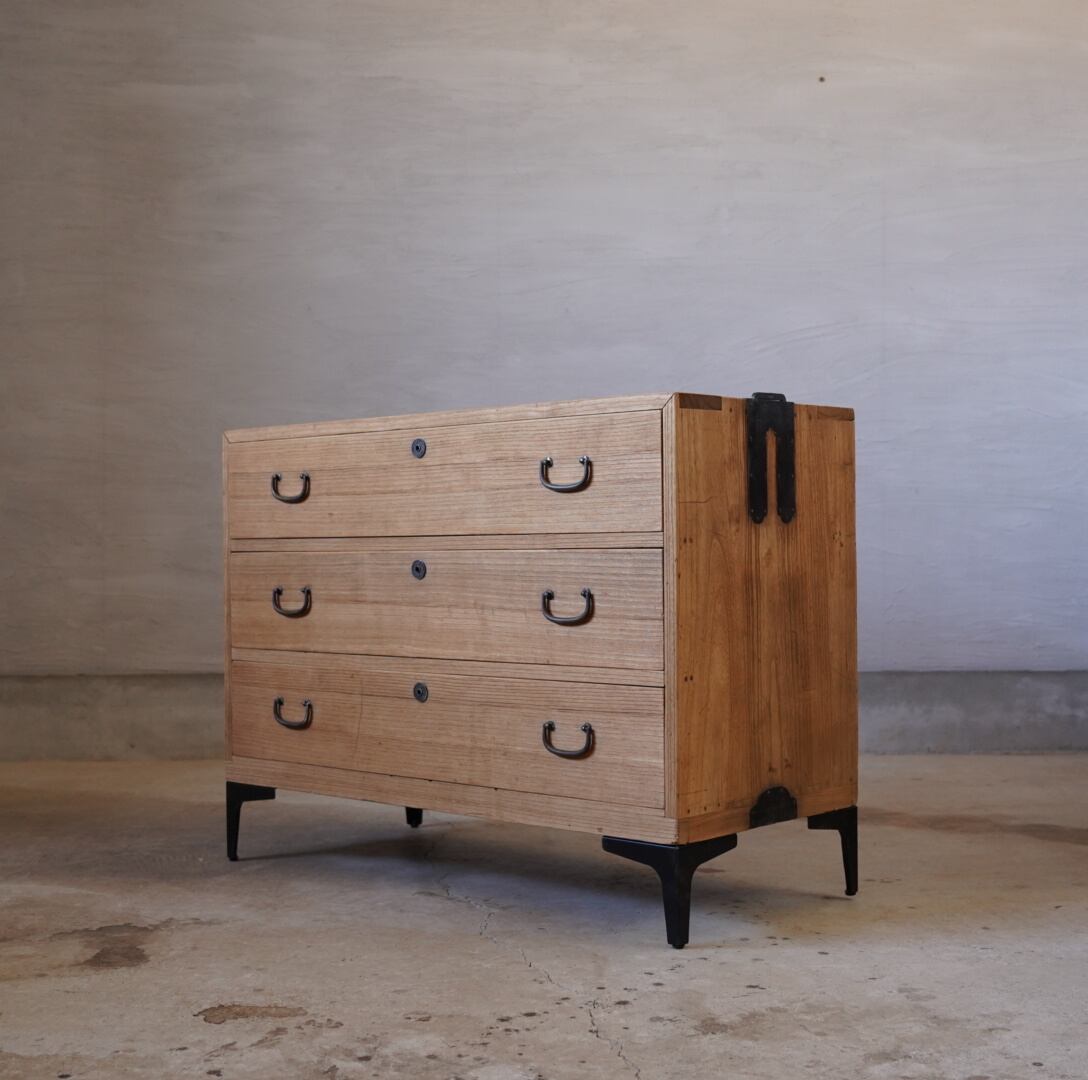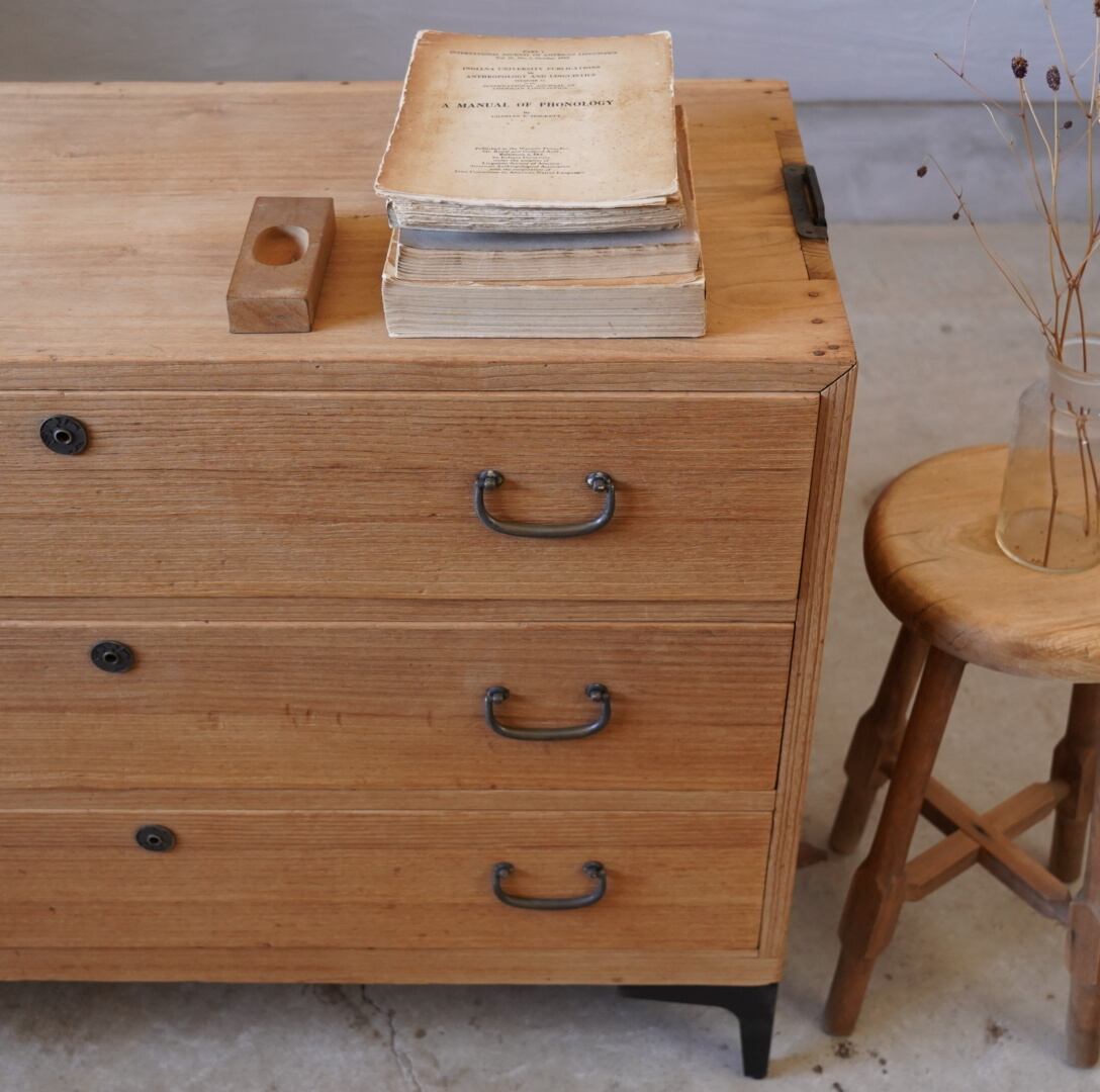 ナチュラルな木味とすっきりとしたアイアン脚が魅力的な3杯の引き出しチェストです。