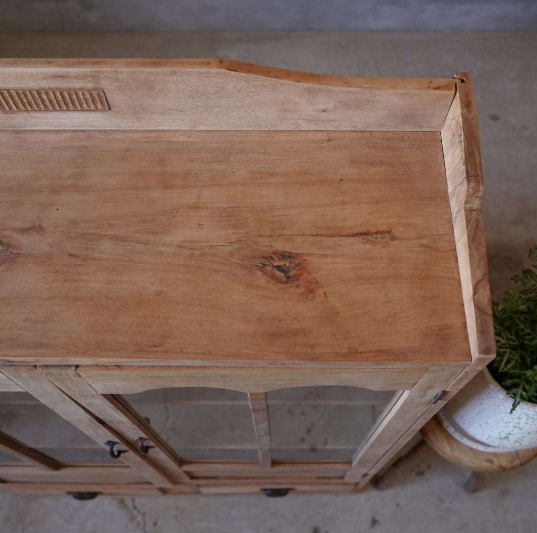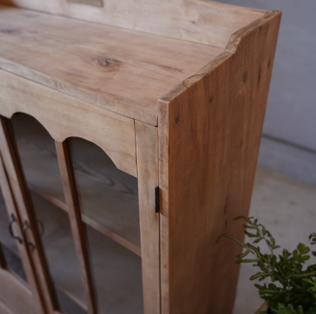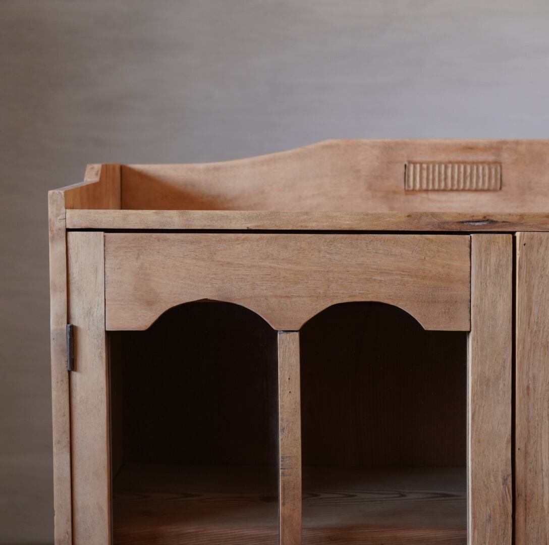 無垢材のナチュラルな木味と個性的なデザインの扉が魅力的なキャビネットです。