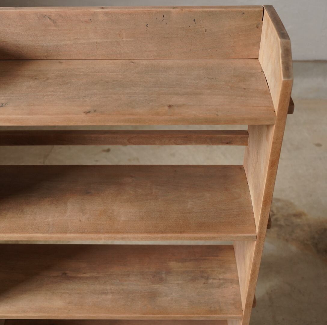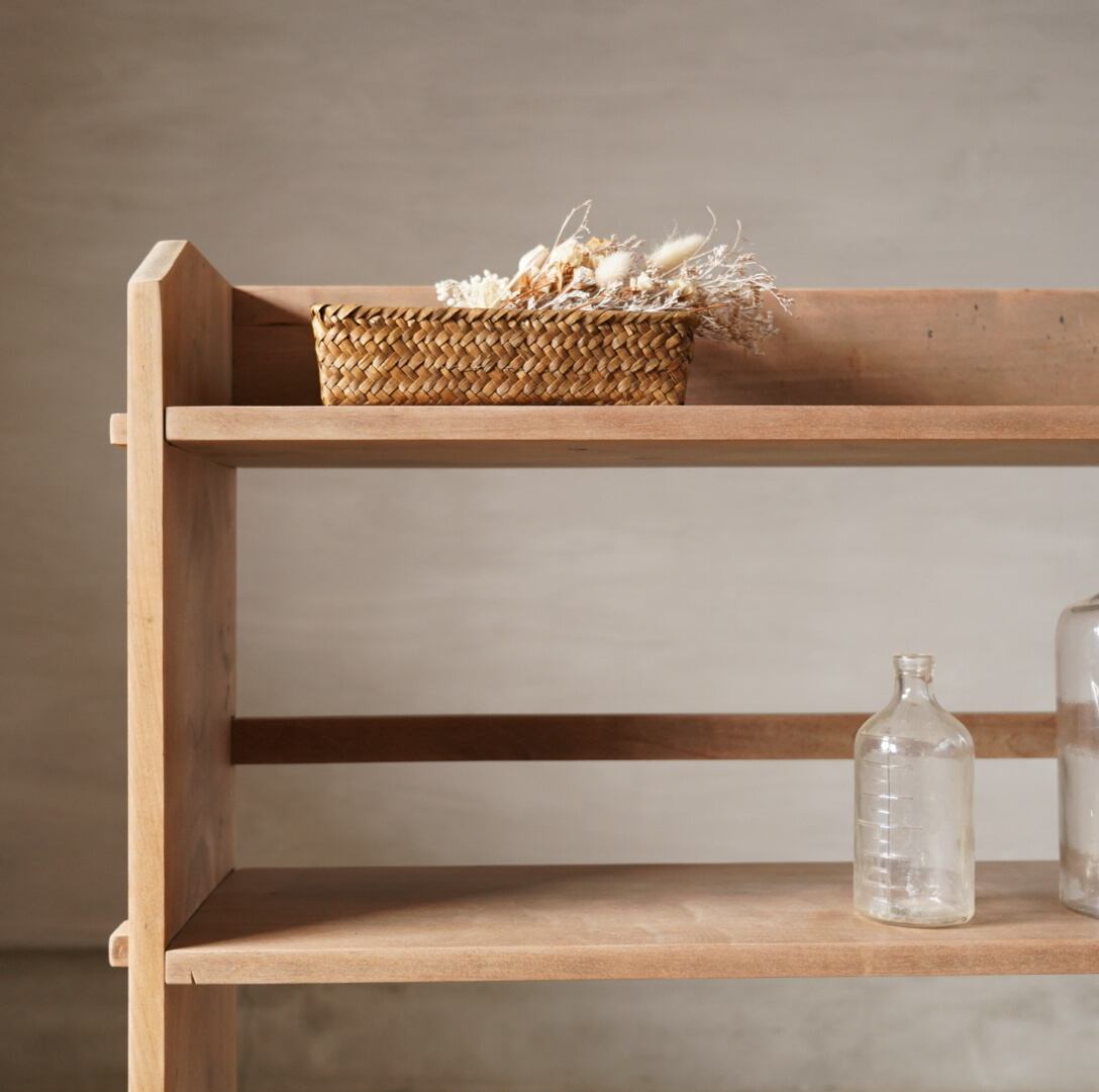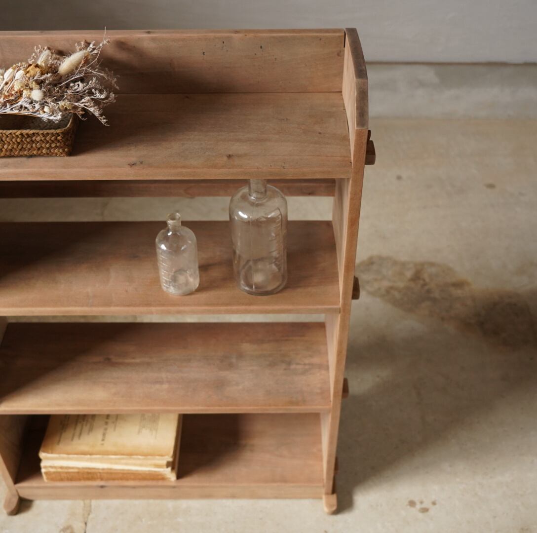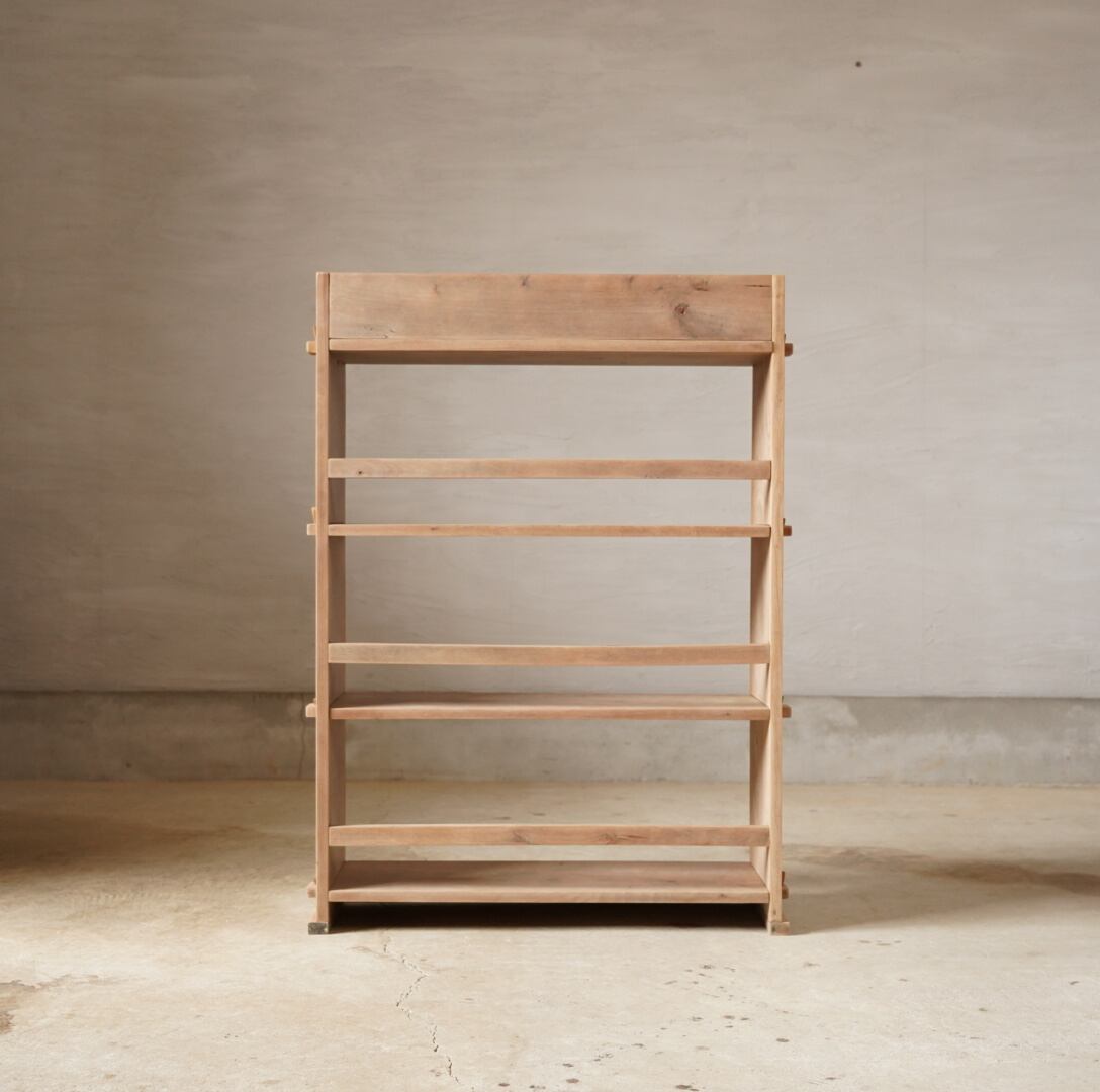 古い無垢材の素朴な風合いとすっきりとしたシルエットが美しい4段のオープンラック。
