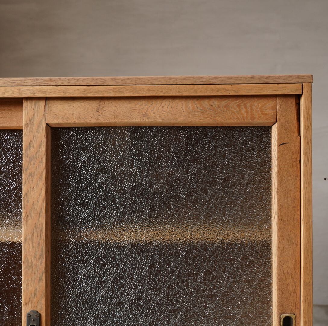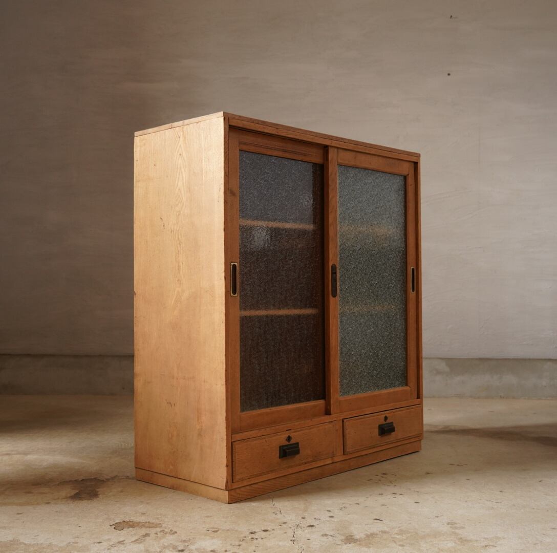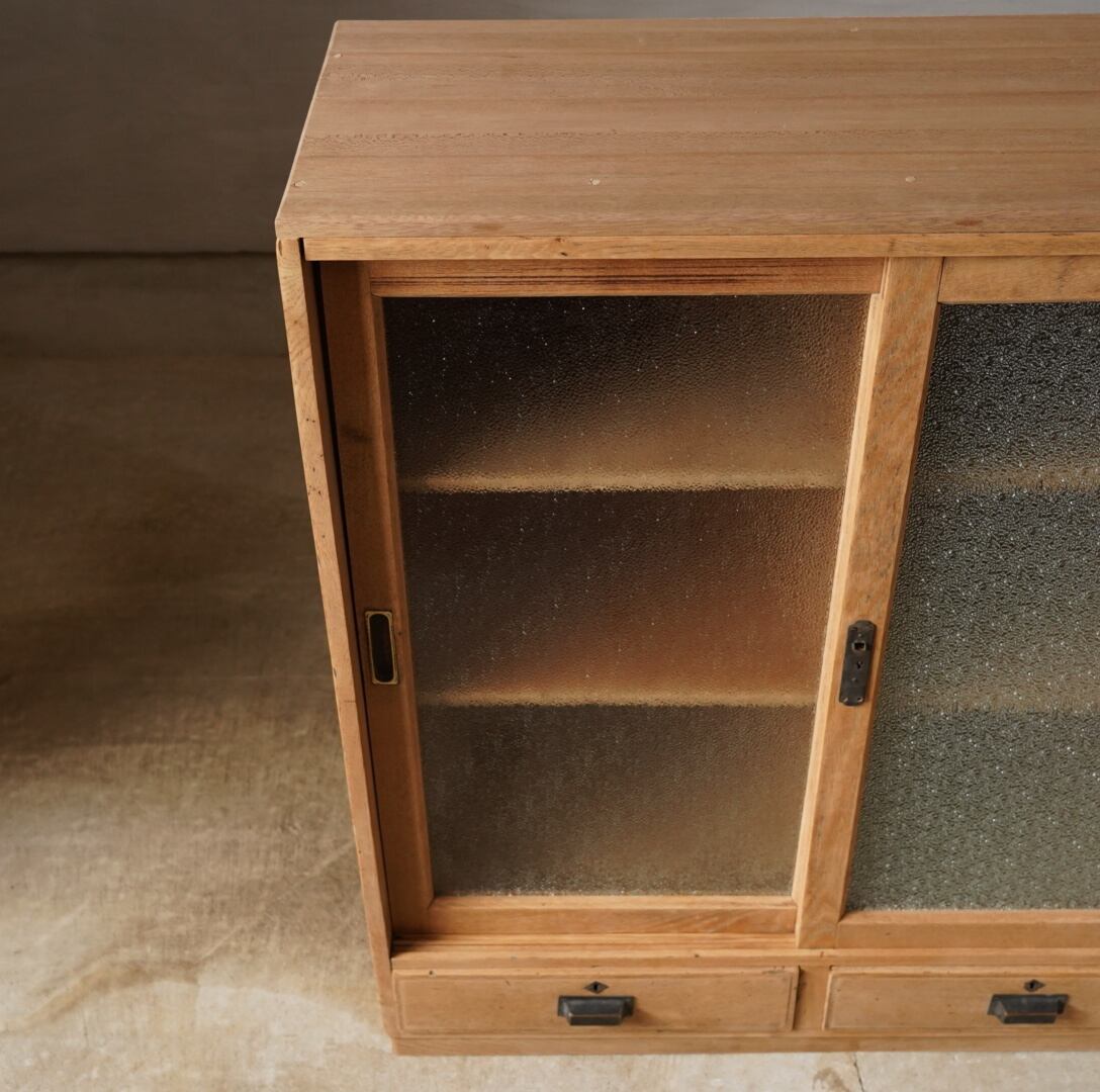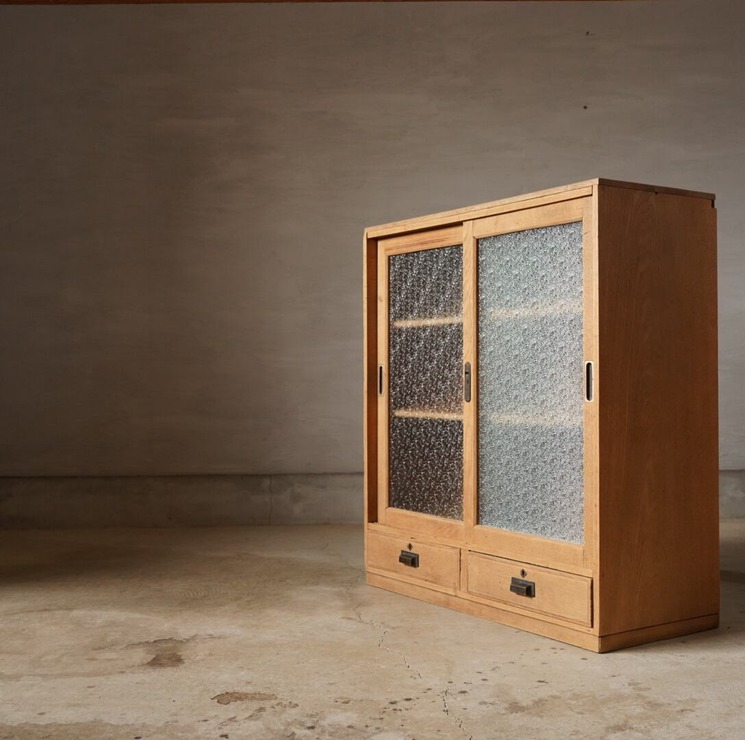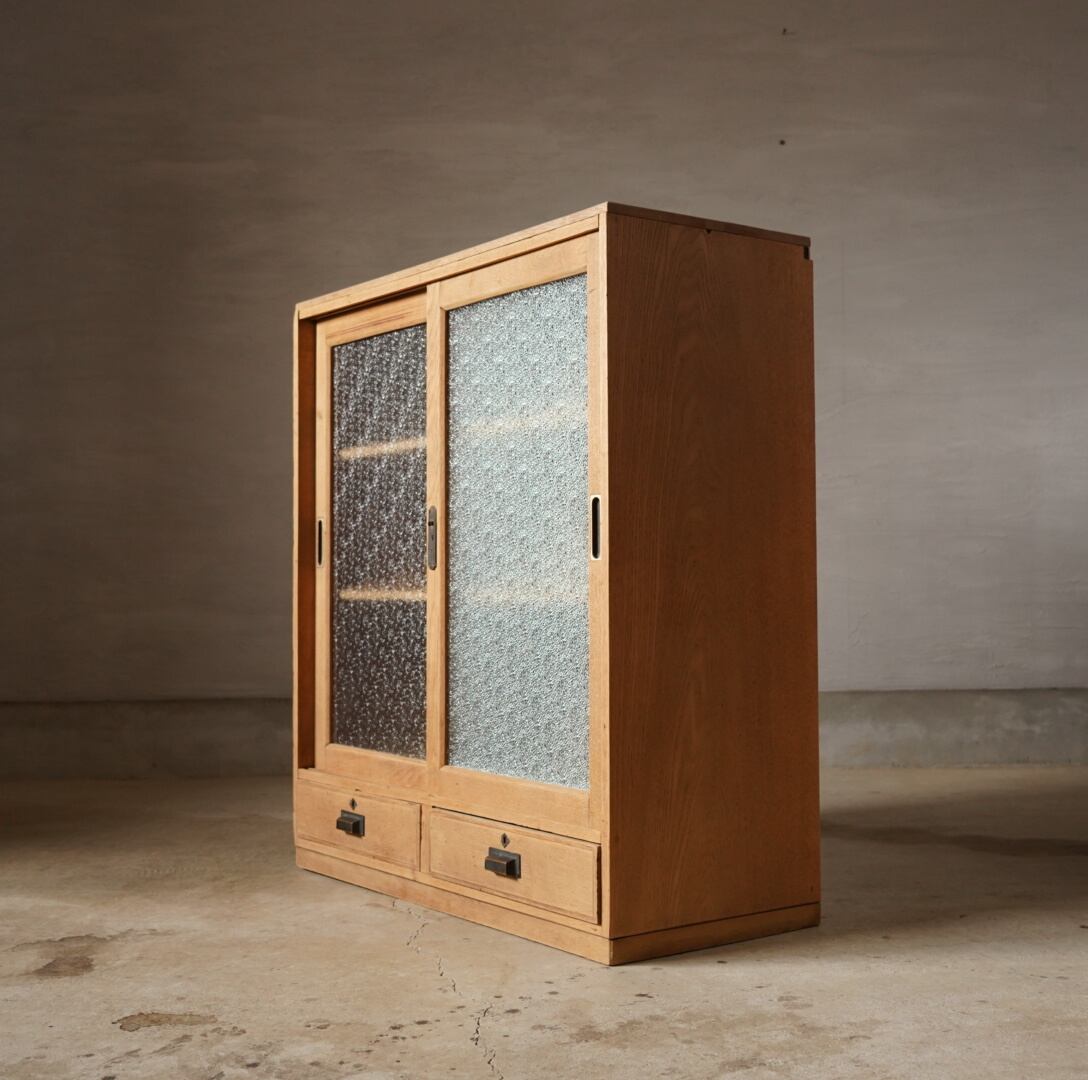 無垢材のナチュラルな木味と大きなダイヤガラスの引き戸が美しいキャビネットです。