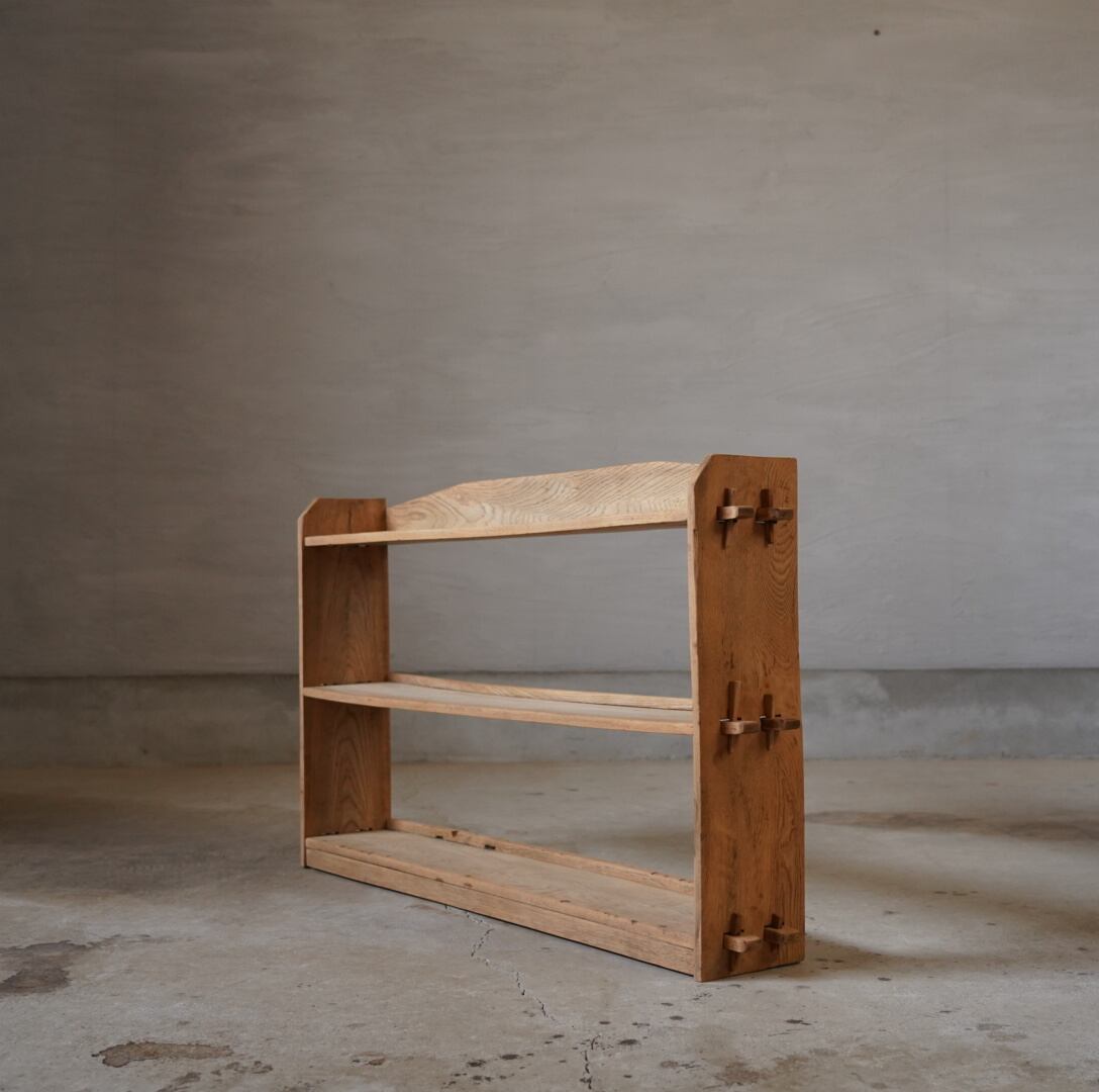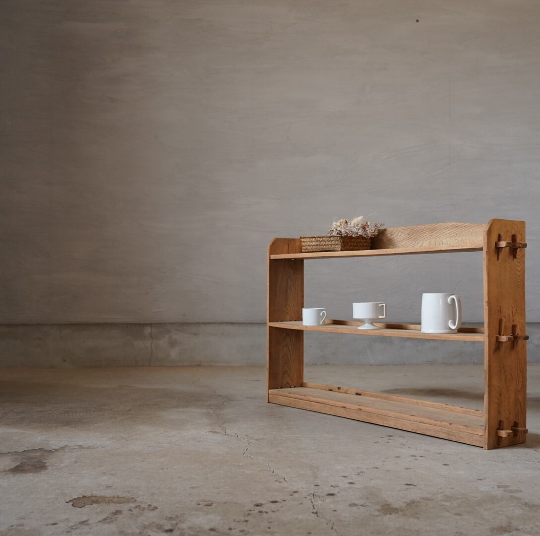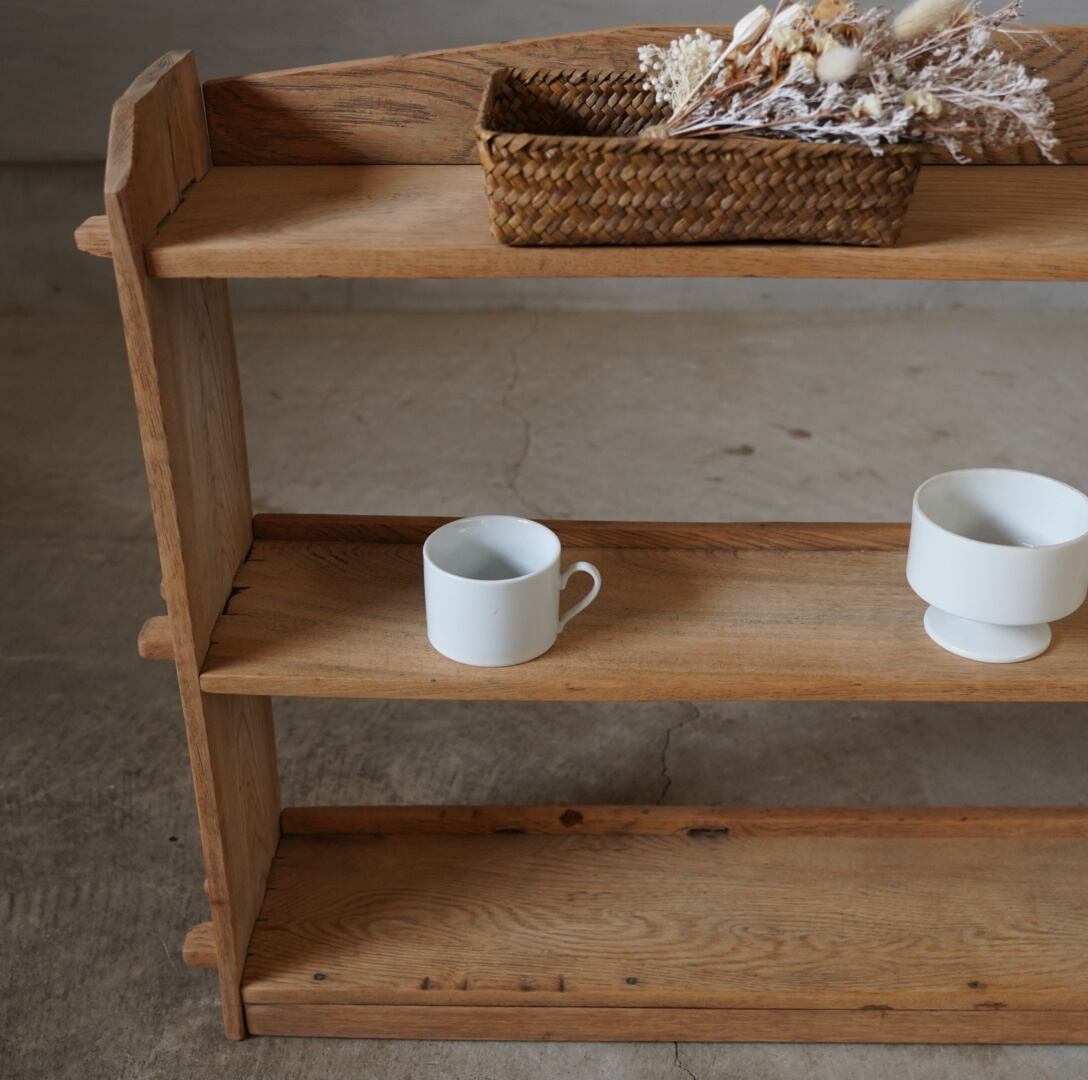 古い無垢材の素朴な風合いとすっきりとしたシルエットが美しい3段のオープンラック。