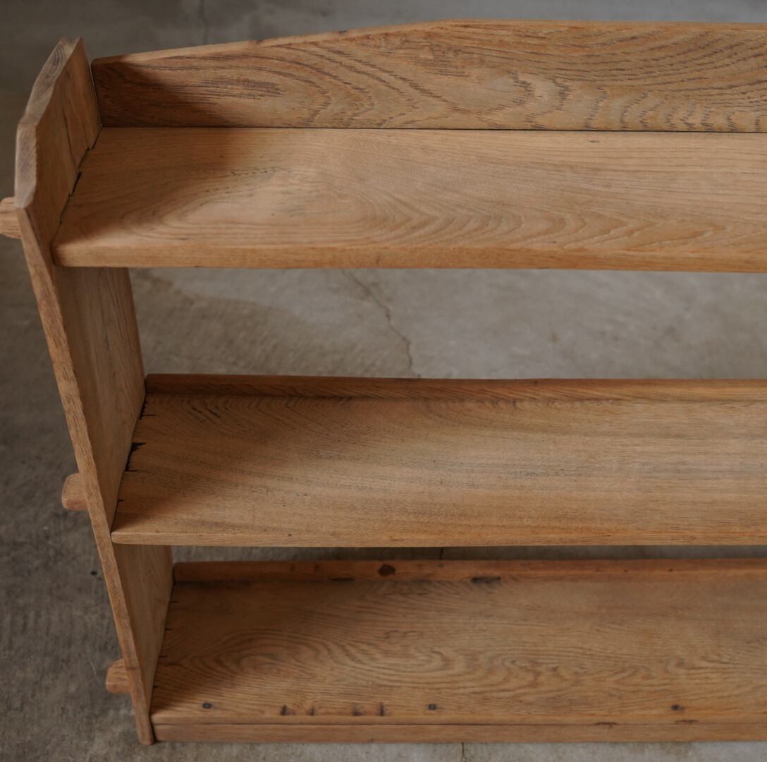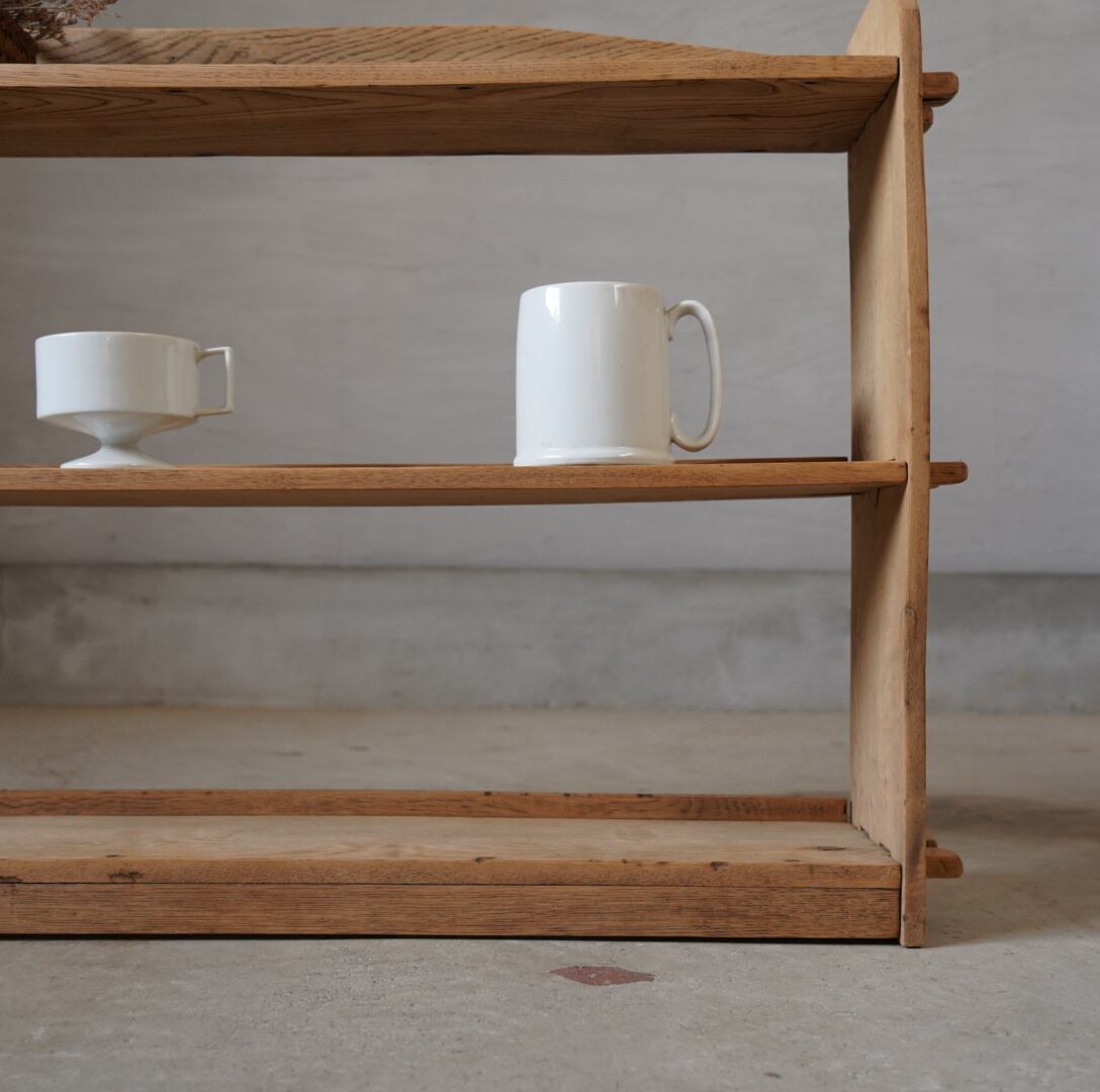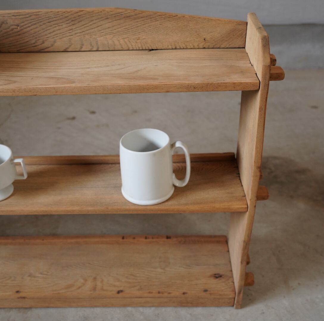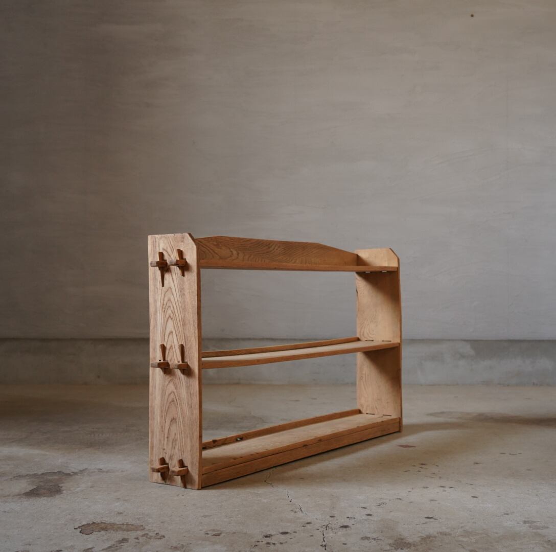 古い無垢材の素朴な風合いとすっきりとしたシルエットが美しい3段のオープンラック。