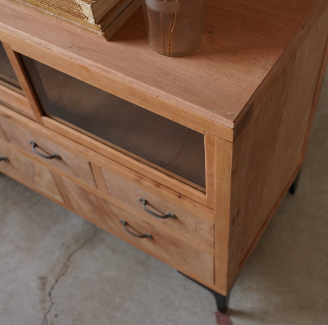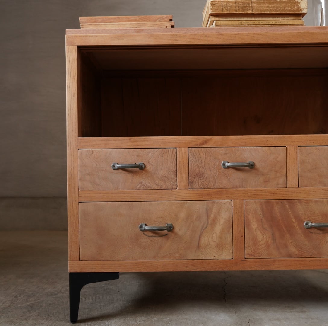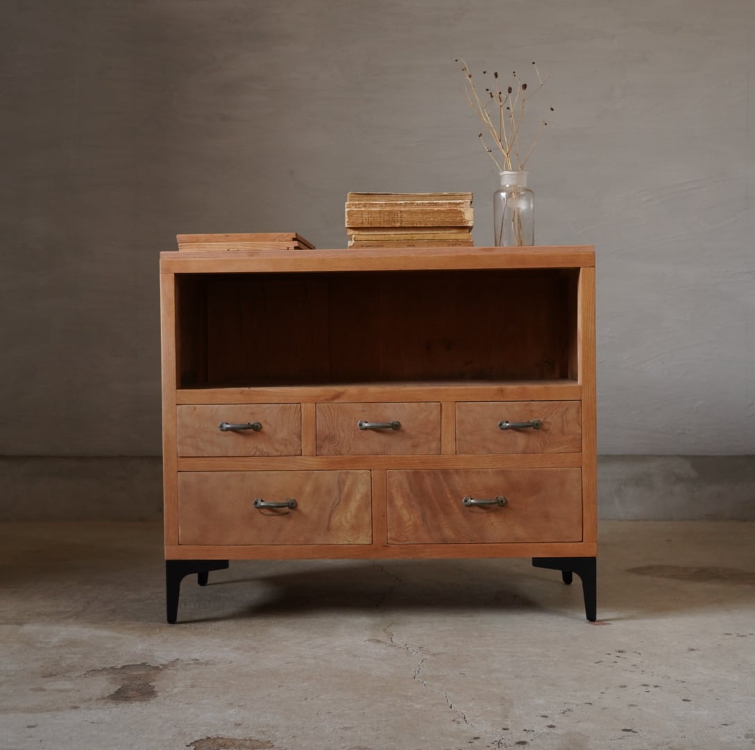 並んだ5杯の引き出しとすっきりとしたアイアン脚が魅力的なキャビネット。