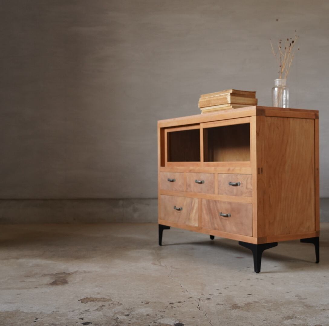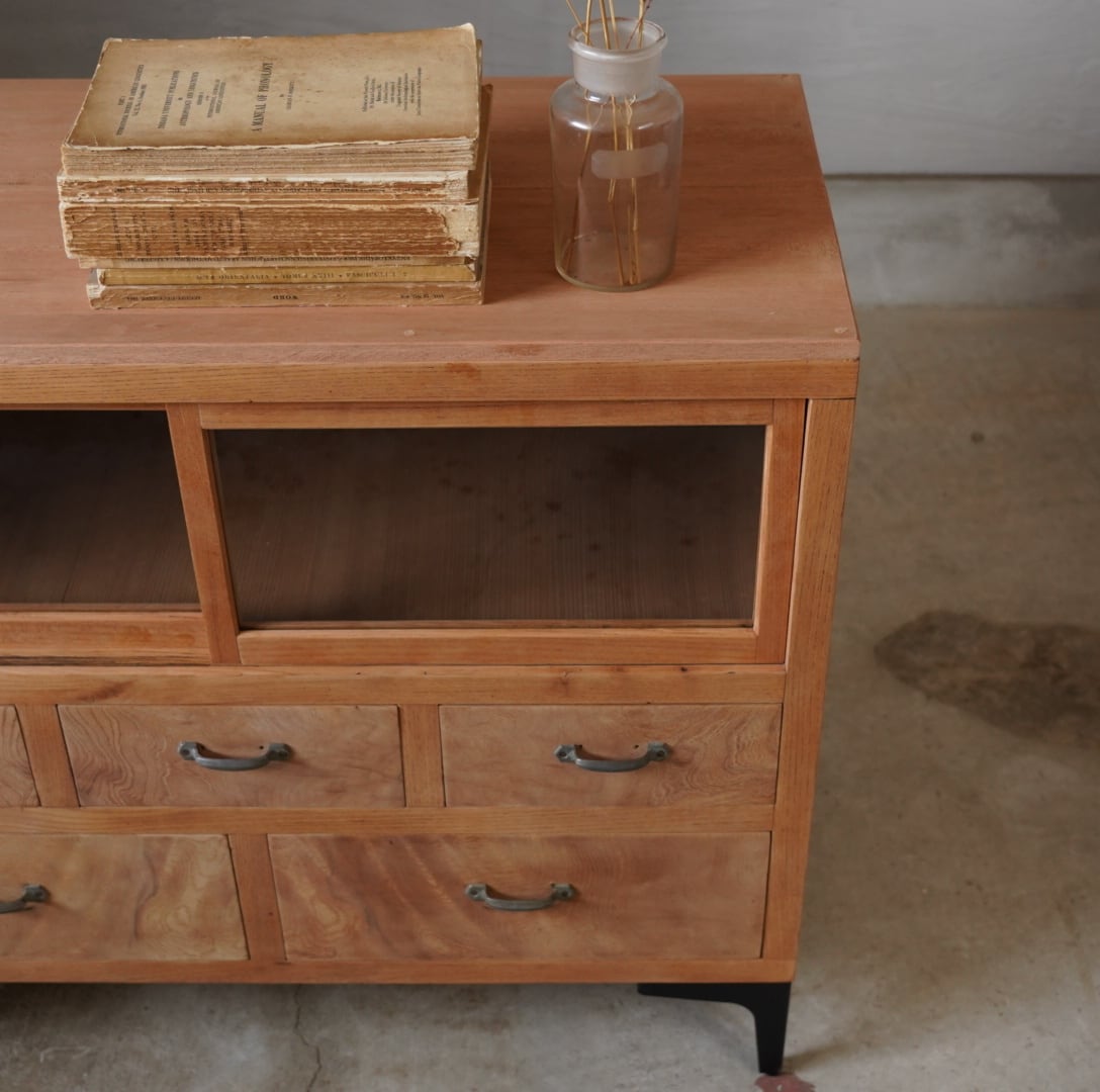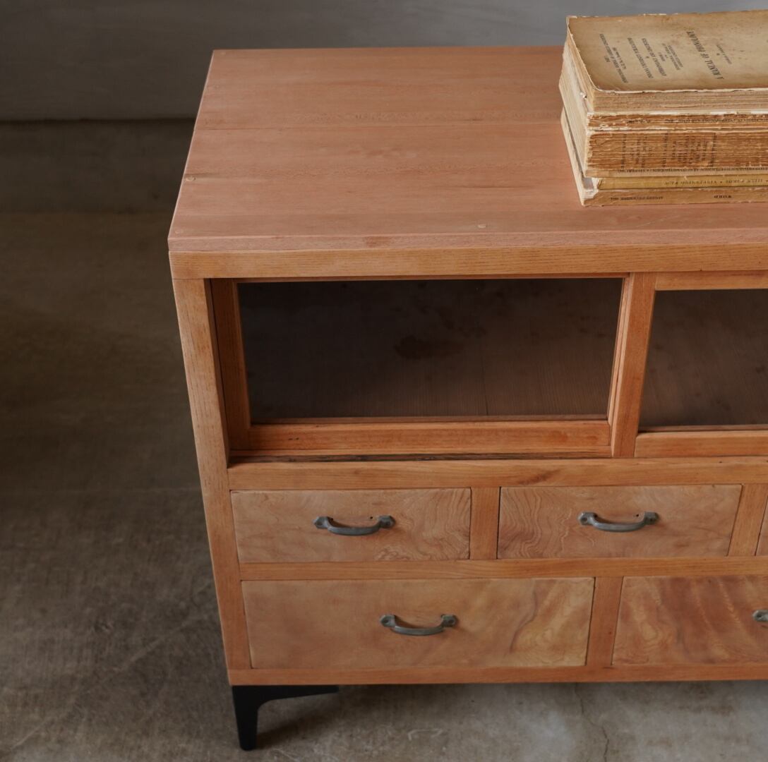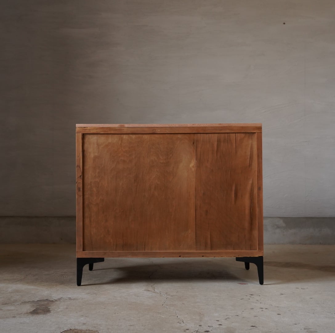 並んだ5杯の引き出しとすっきりとしたアイアン脚が魅力的なキャビネット。