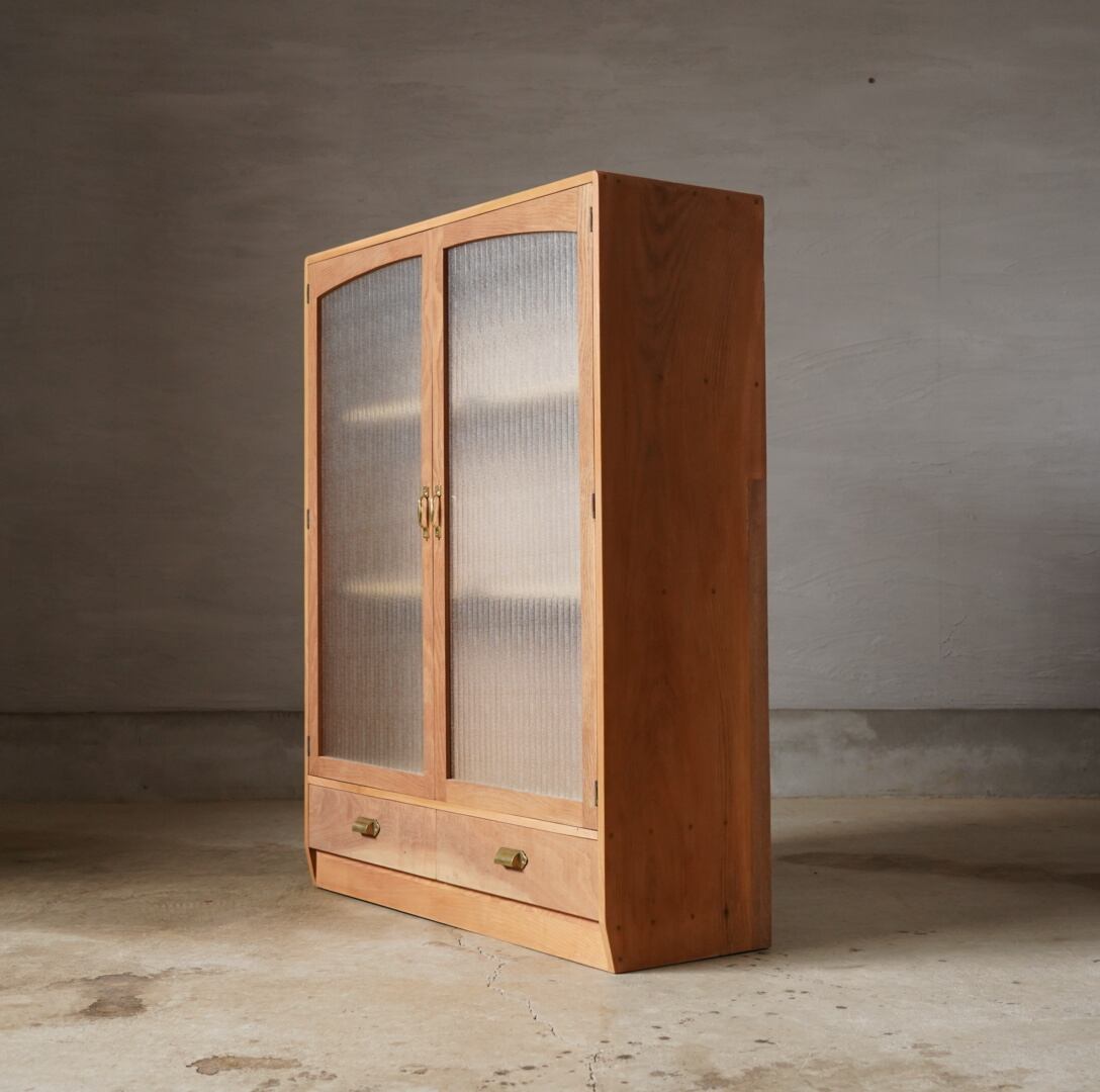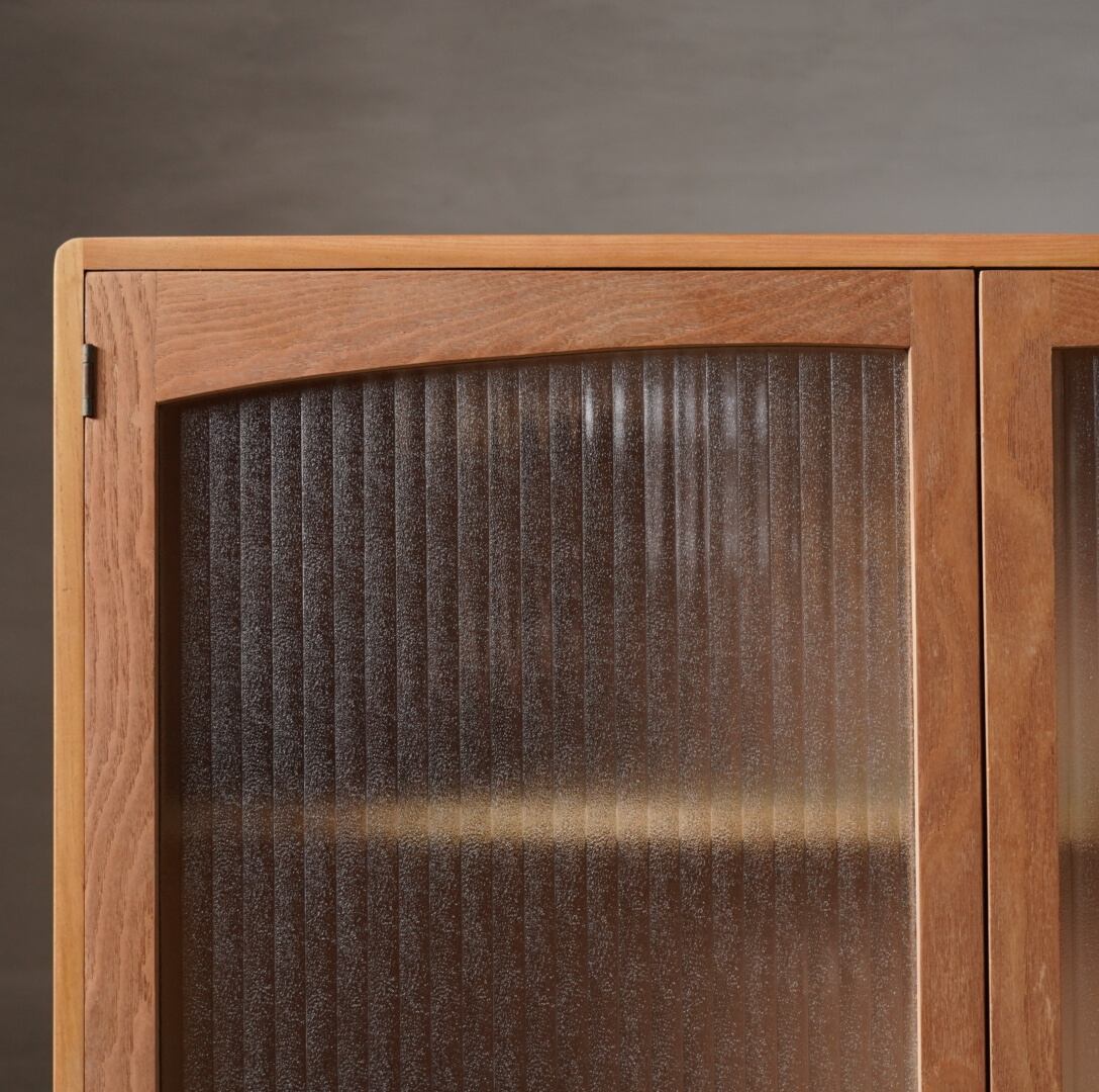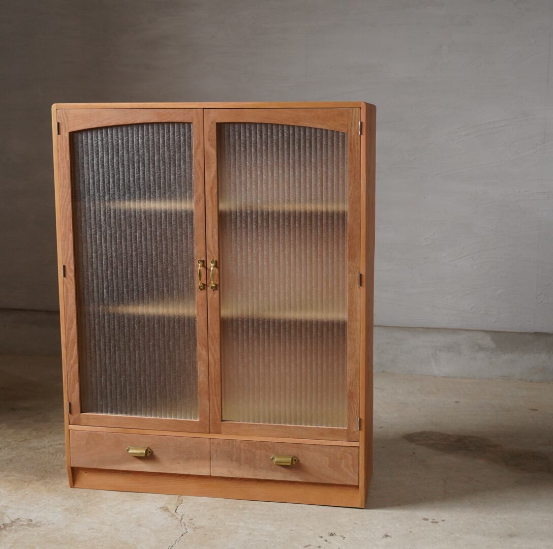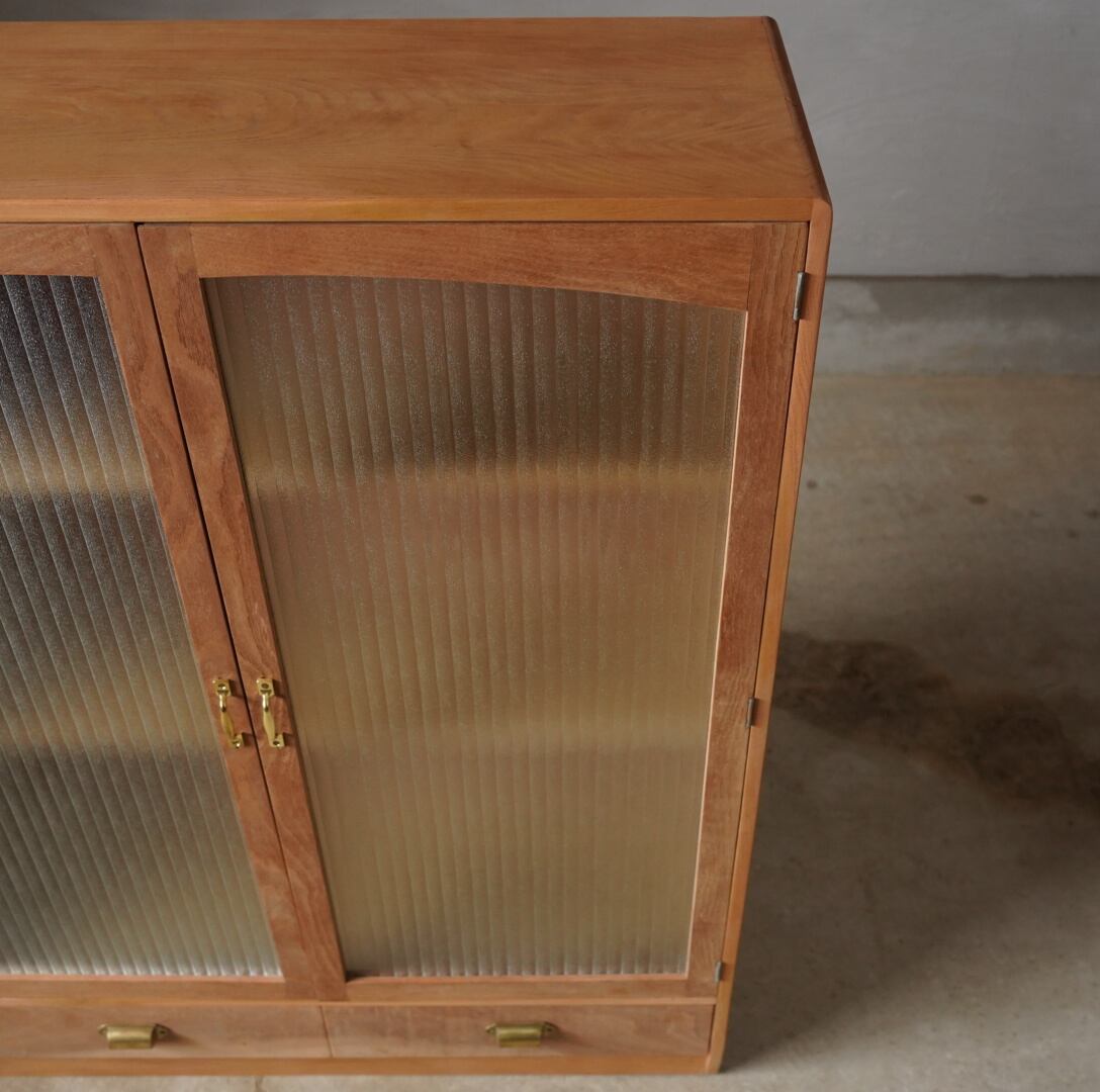 ナチュラルな木味とキラキラと光を反射するモールガラスの開き戸が美しいキャビネット。