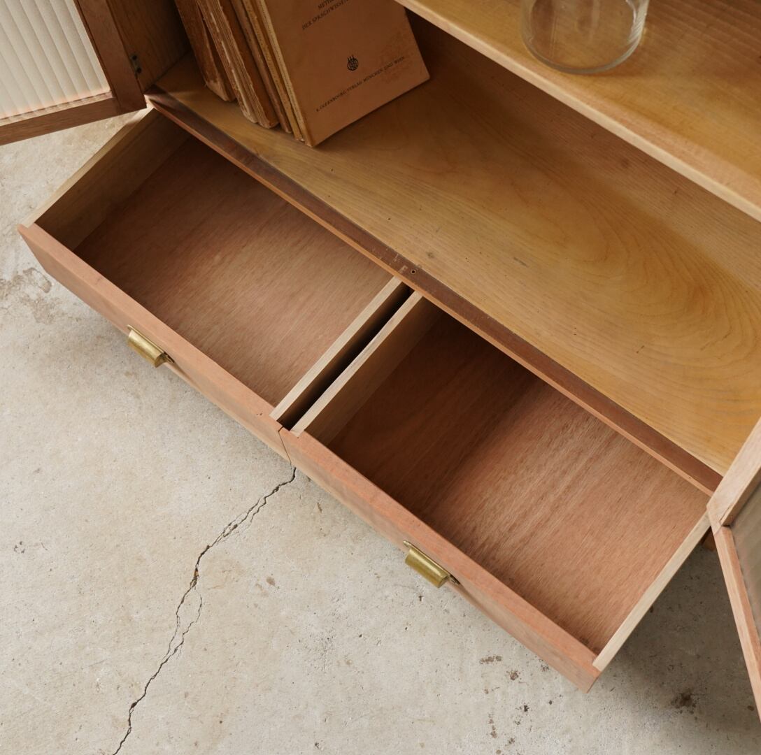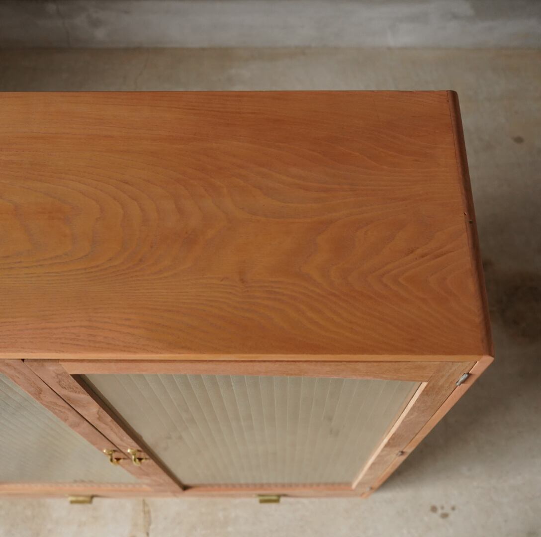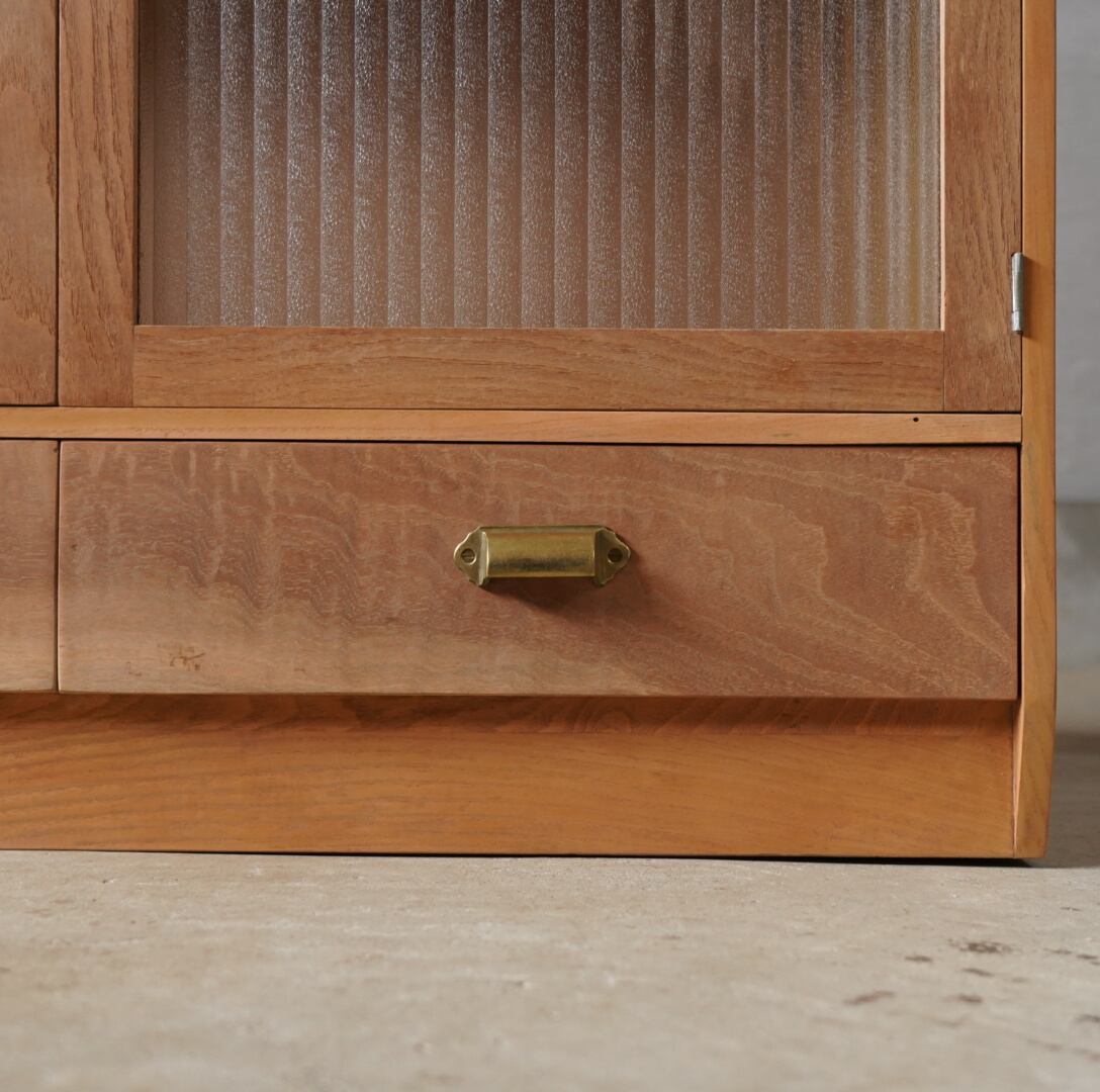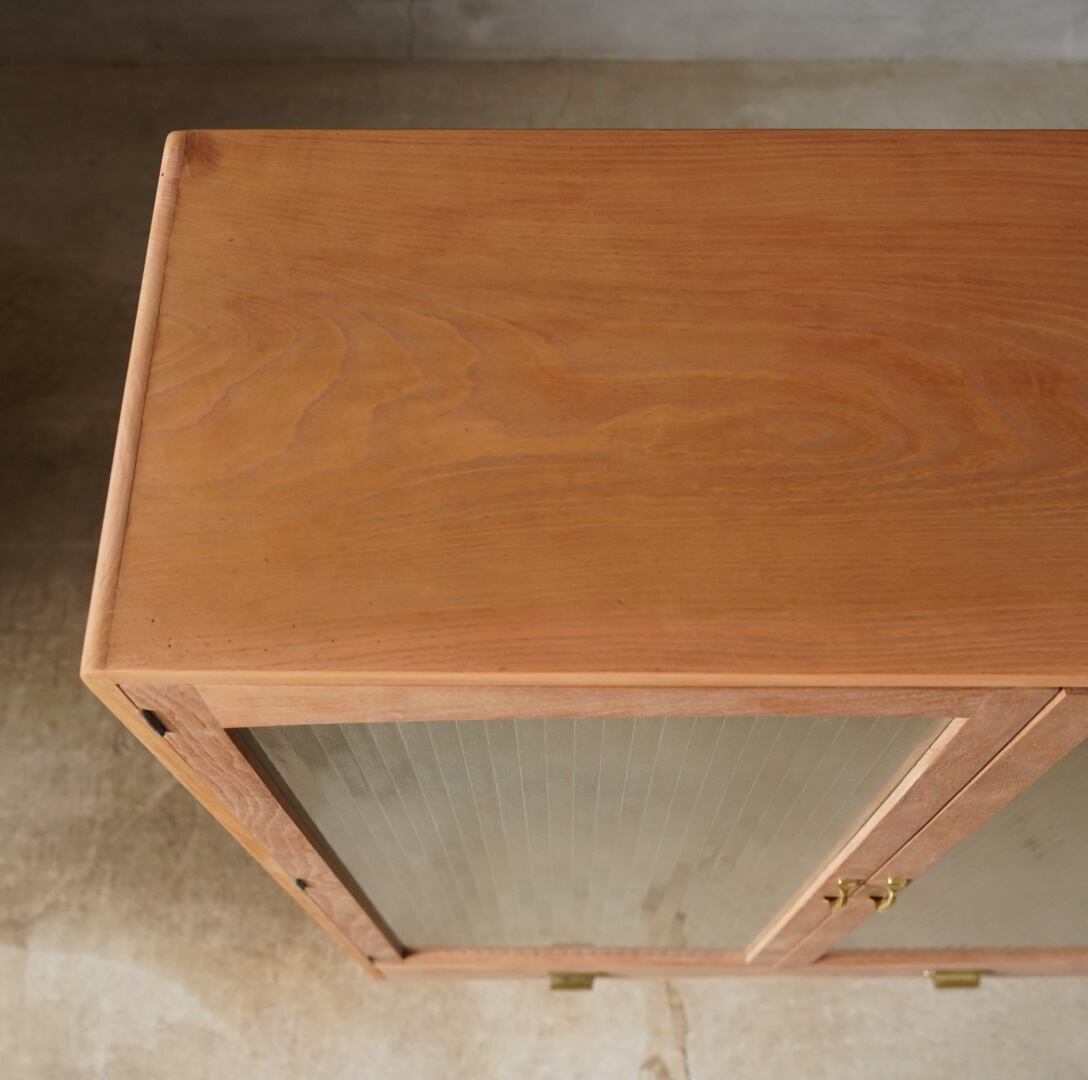 ナチュラルな木味とキラキラと光を反射するモールガラスの開き戸が美しいキャビネット。