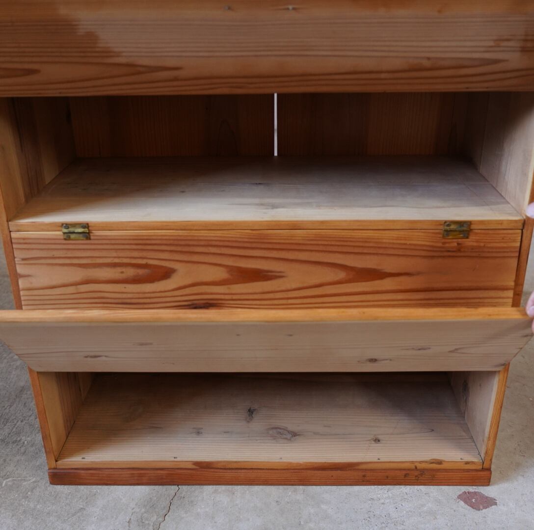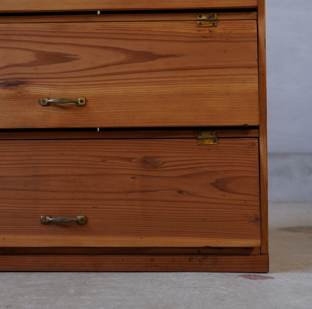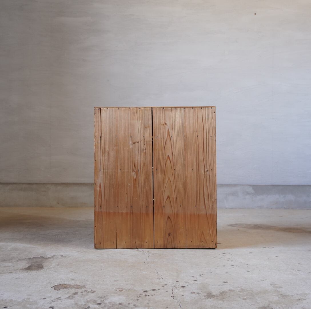 無垢材のナチュラルな木味と並んだ真鍮取手が可愛らしいぱたぱた扉の木製収納棚です。