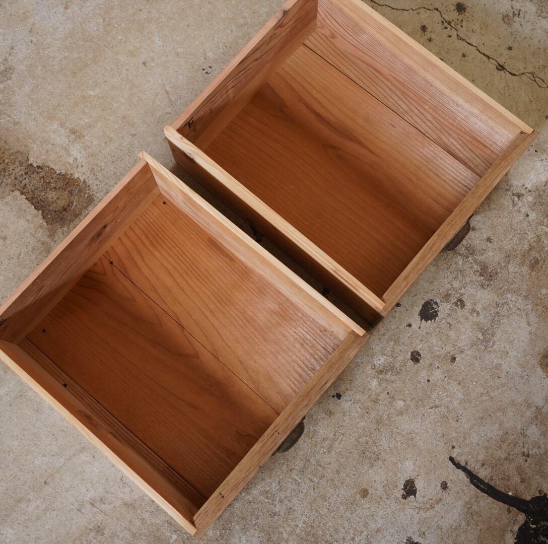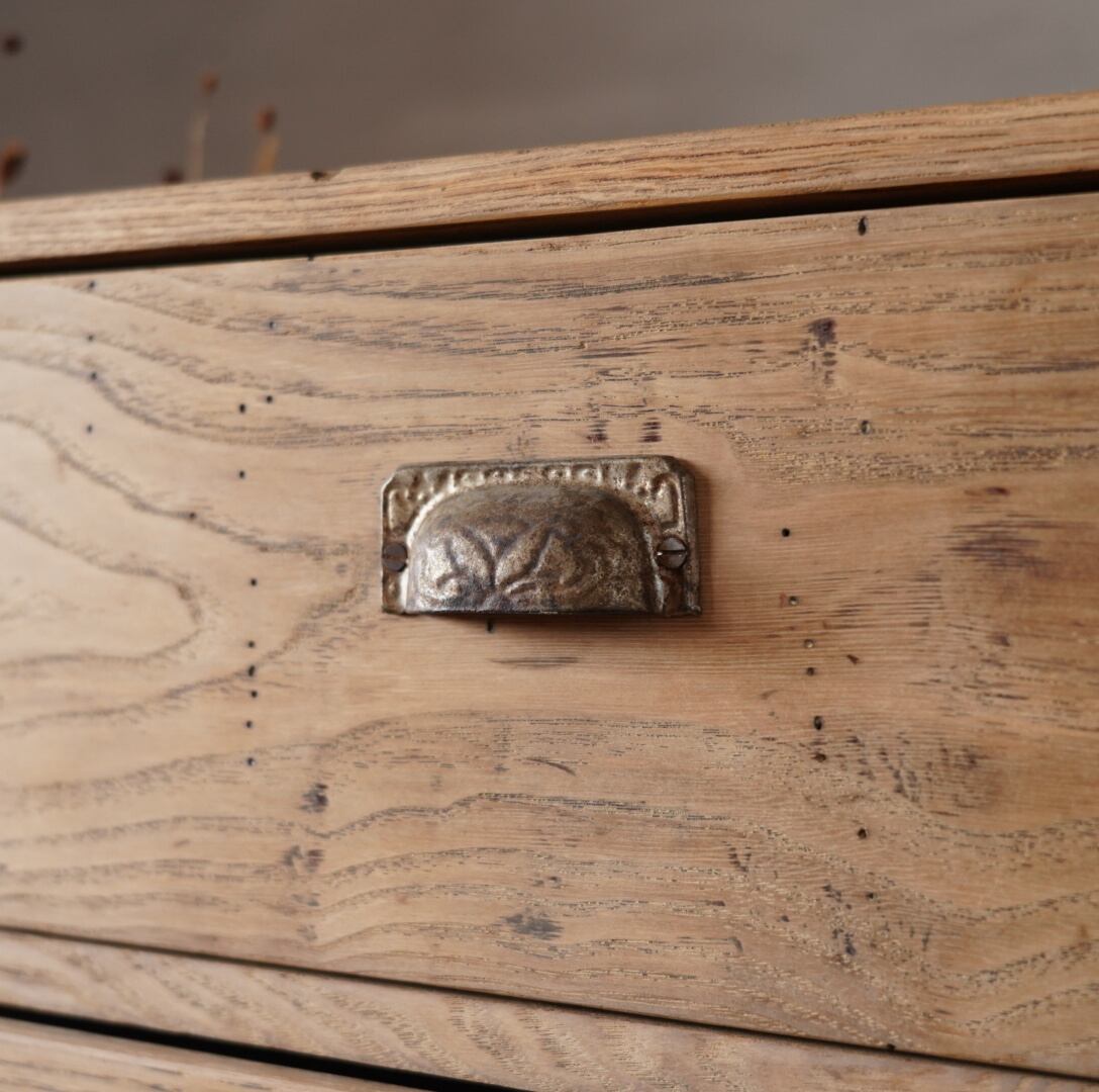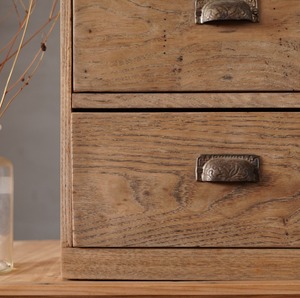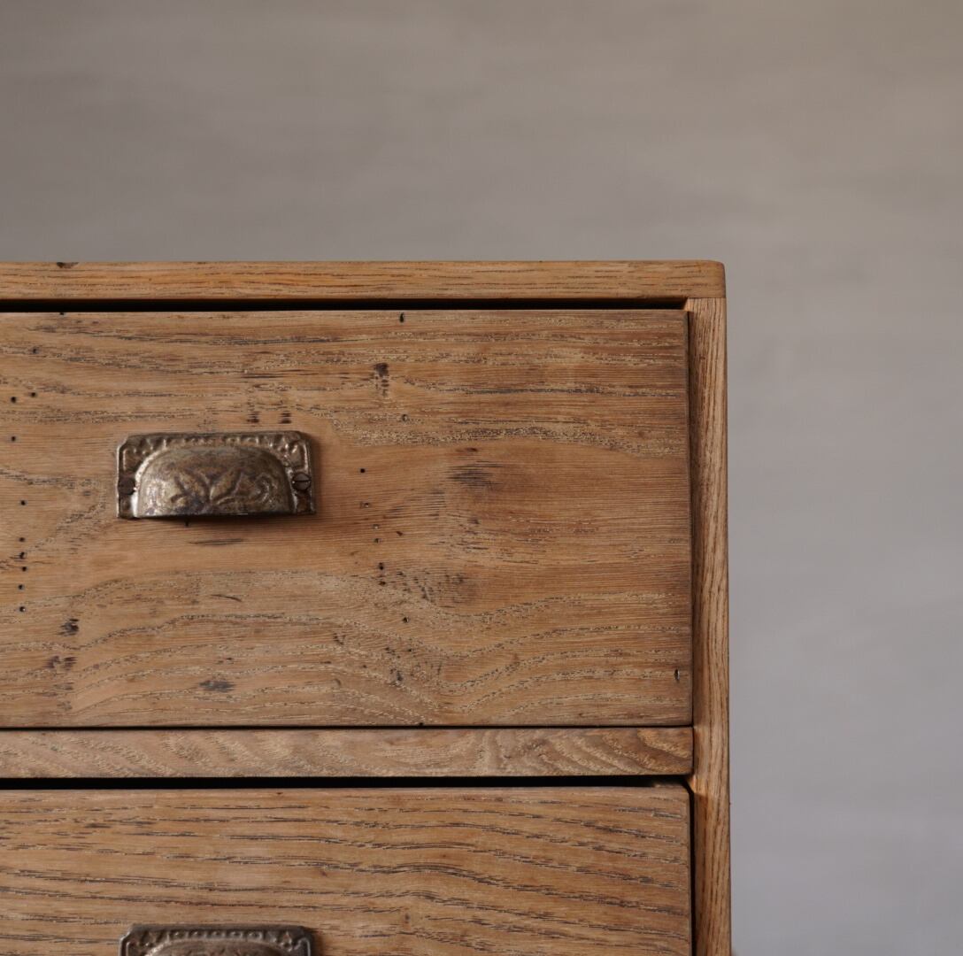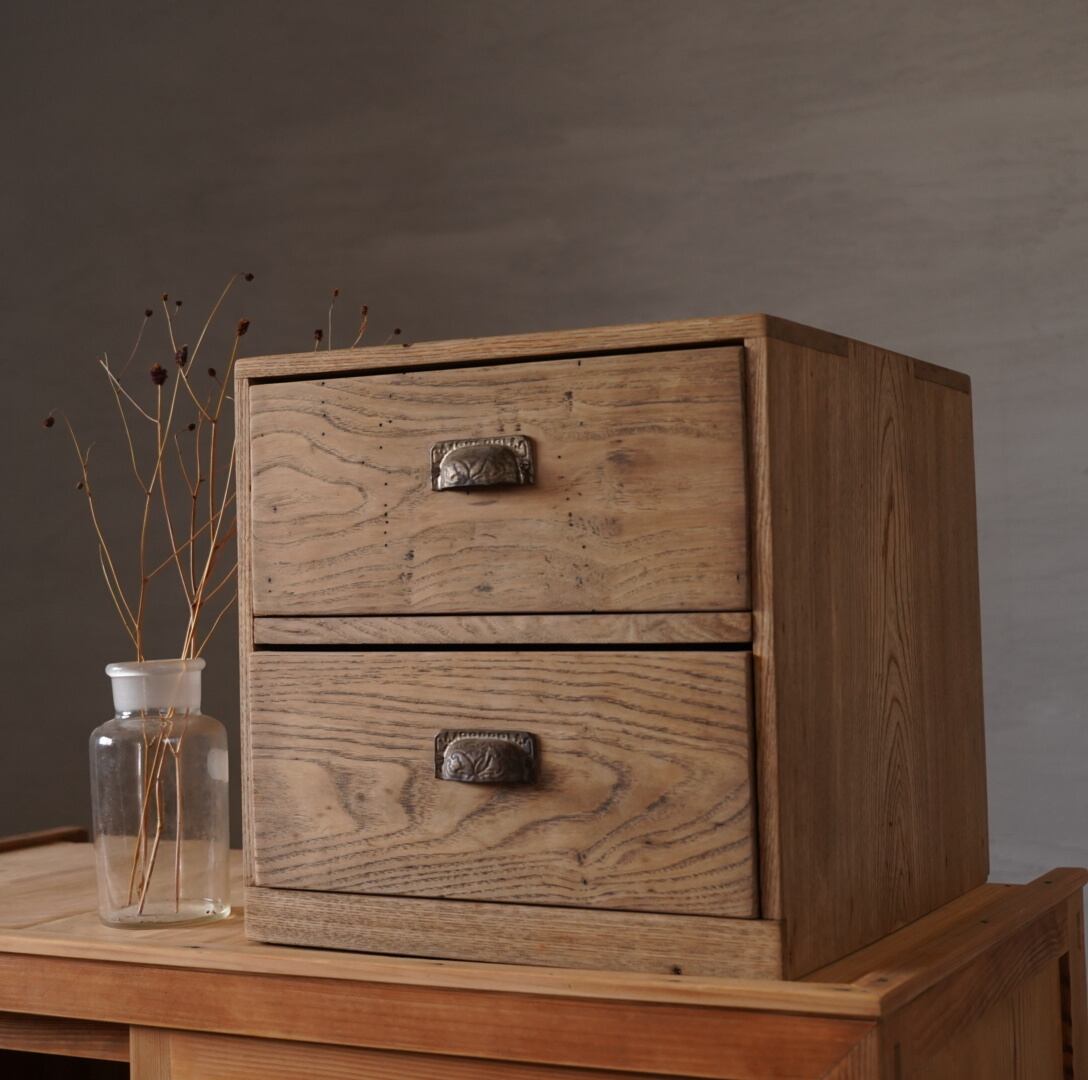 無垢材の素朴な風合いと金属の装飾取手が魅力的な2杯の引き出し。