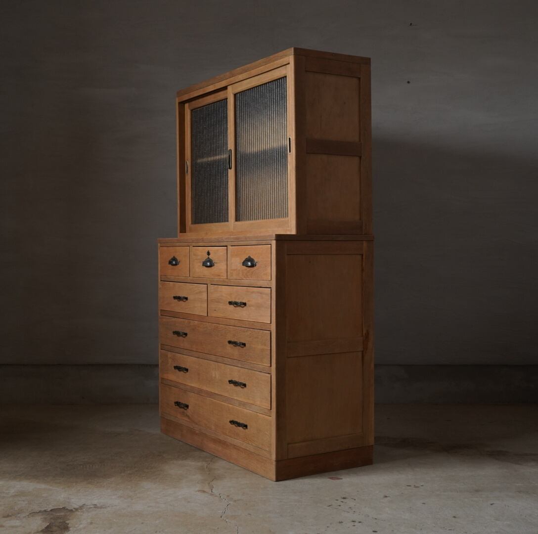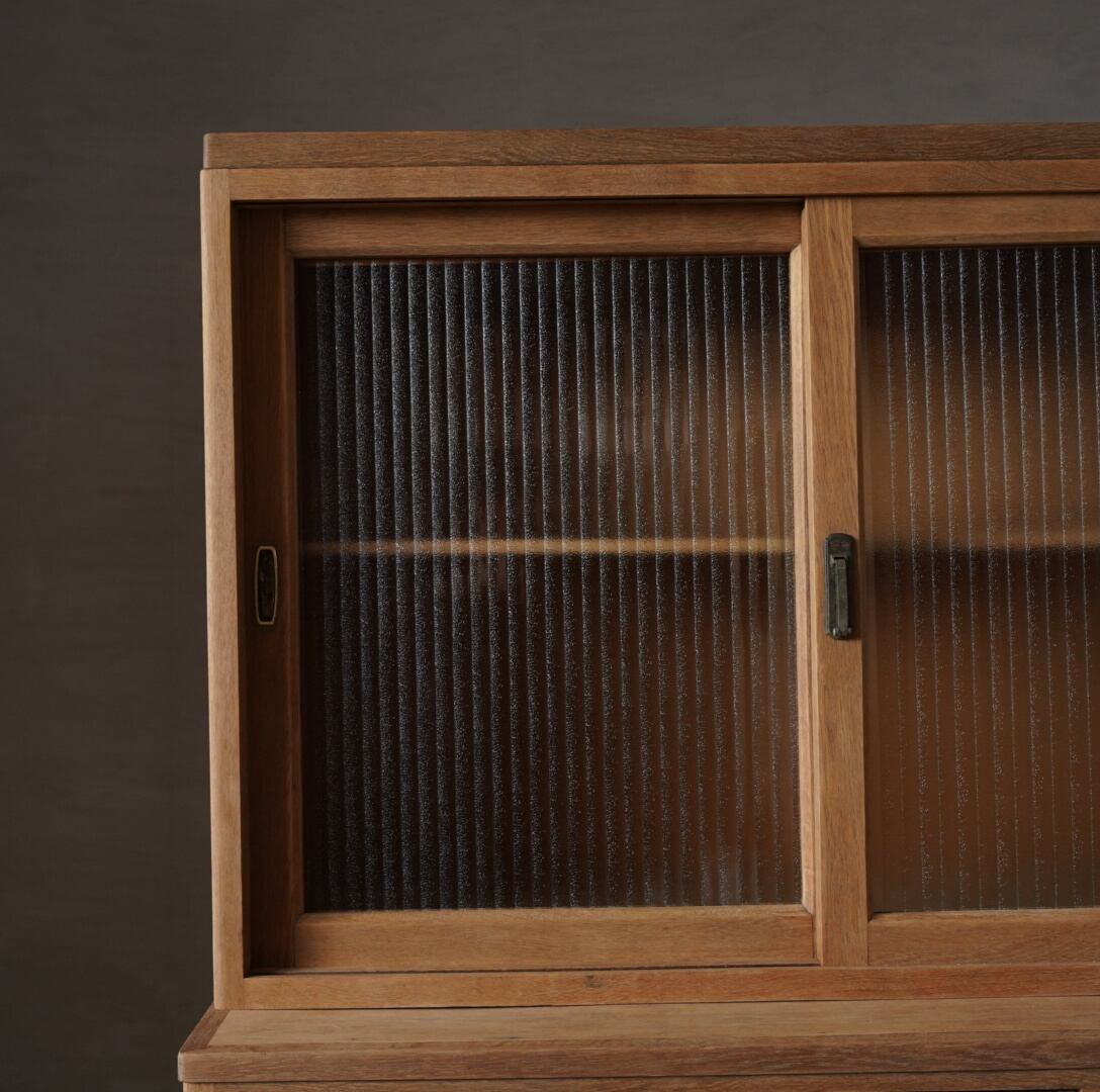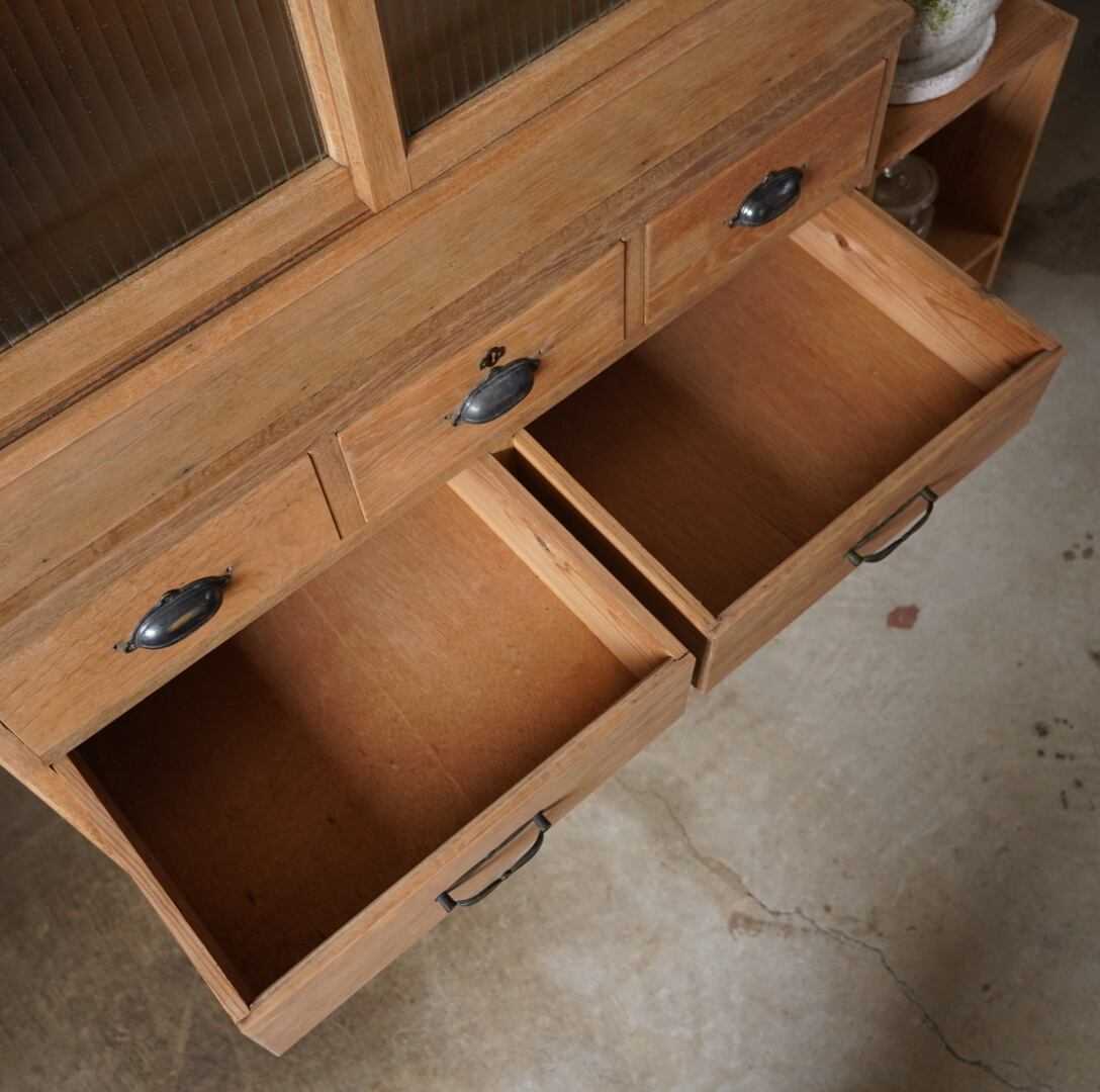 煌めくモールガラスと整然と並んだ8杯の引き出しが美しい食器棚。