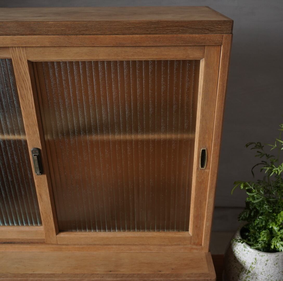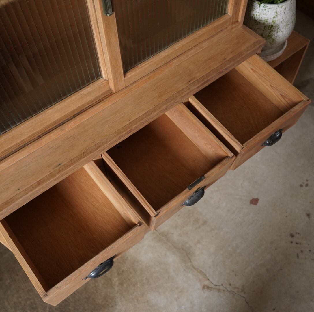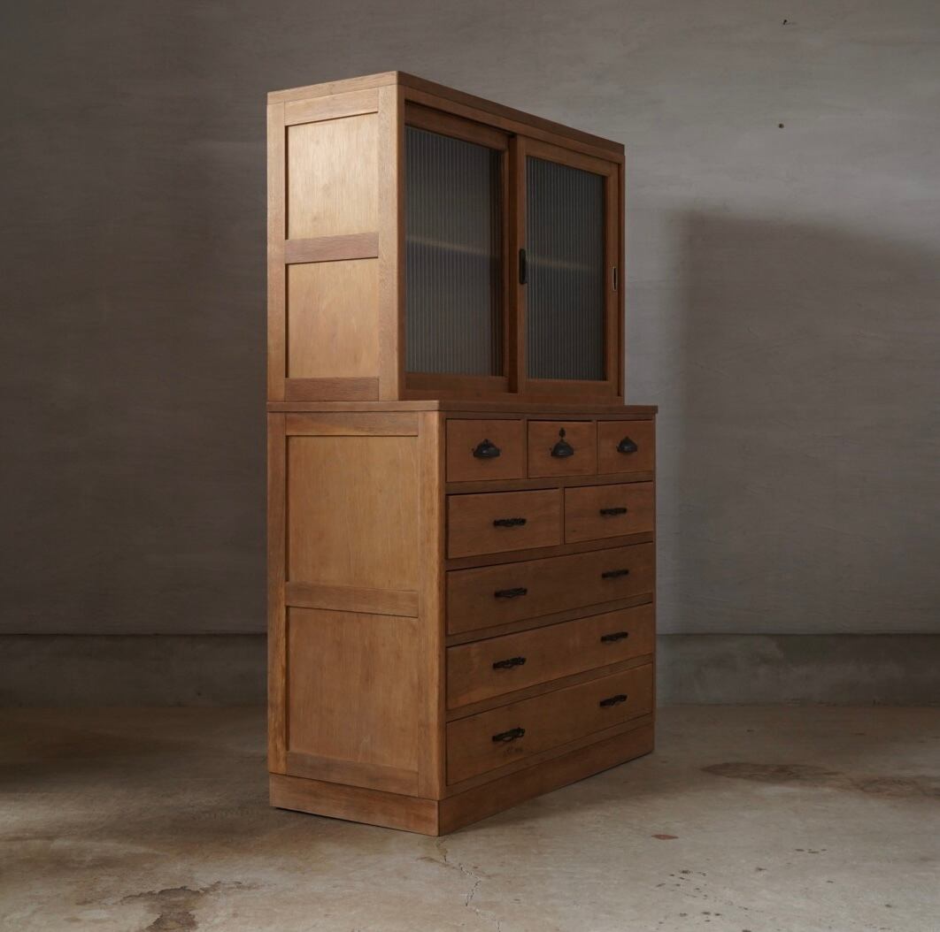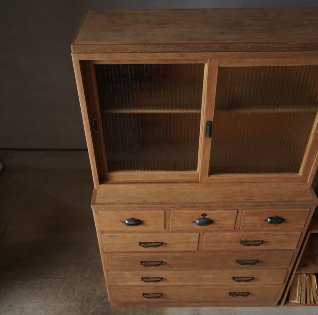 煌めくモールガラスと整然と並んだ8杯の引き出しが美しい食器棚。