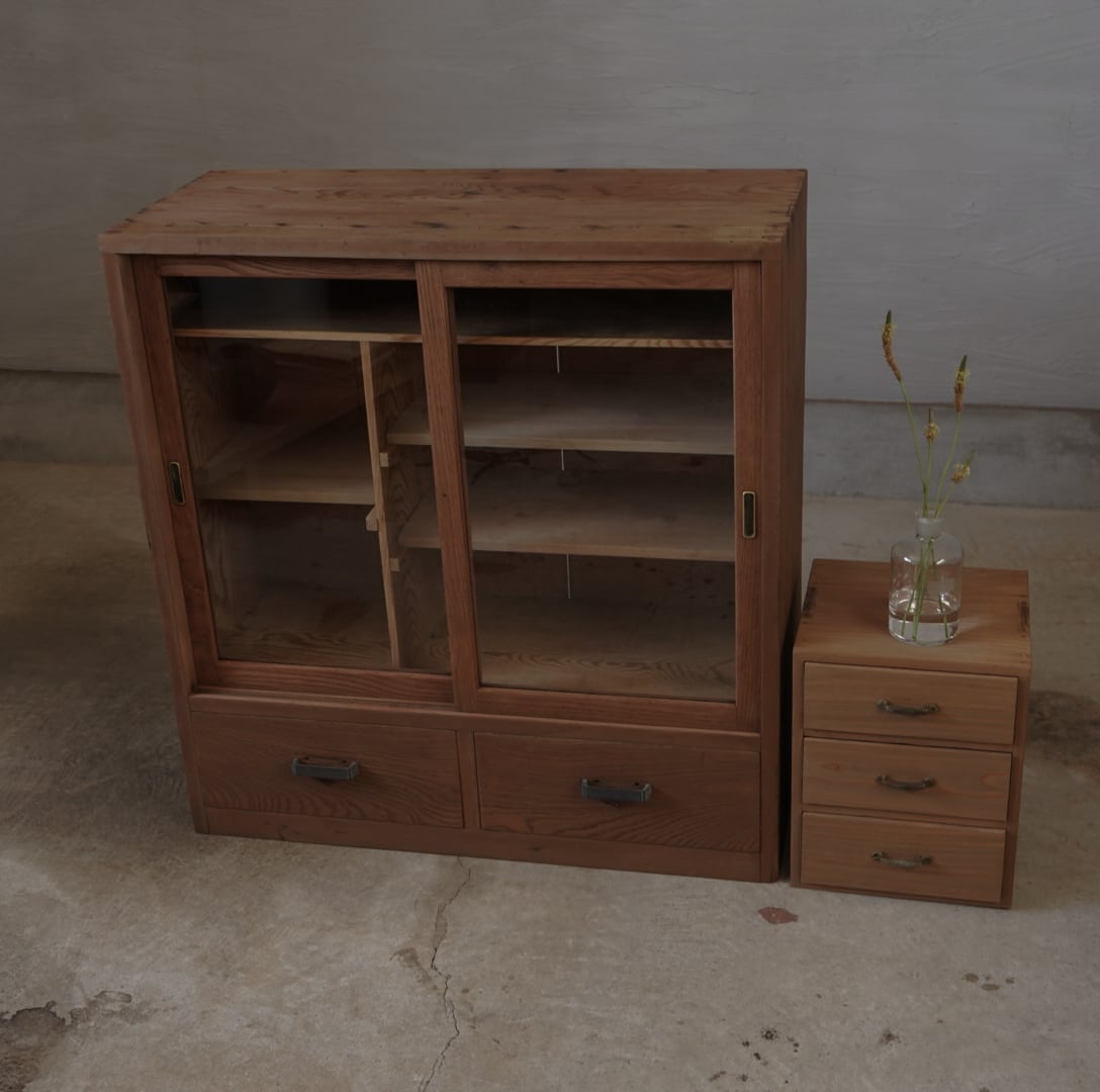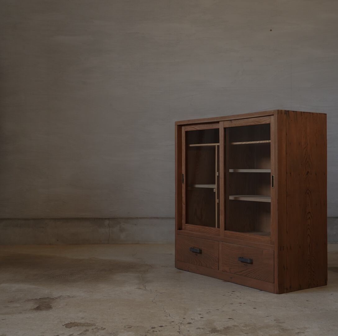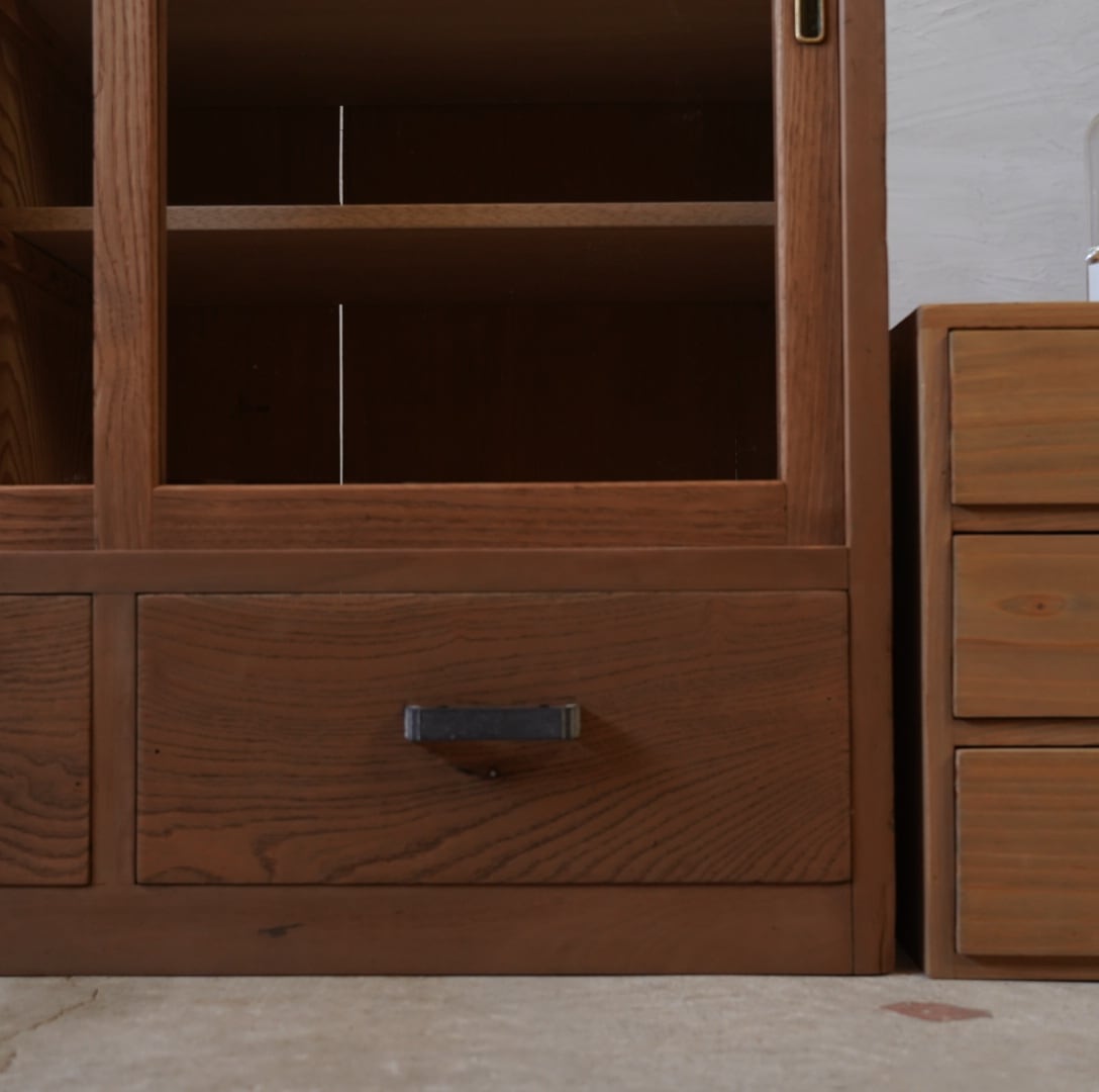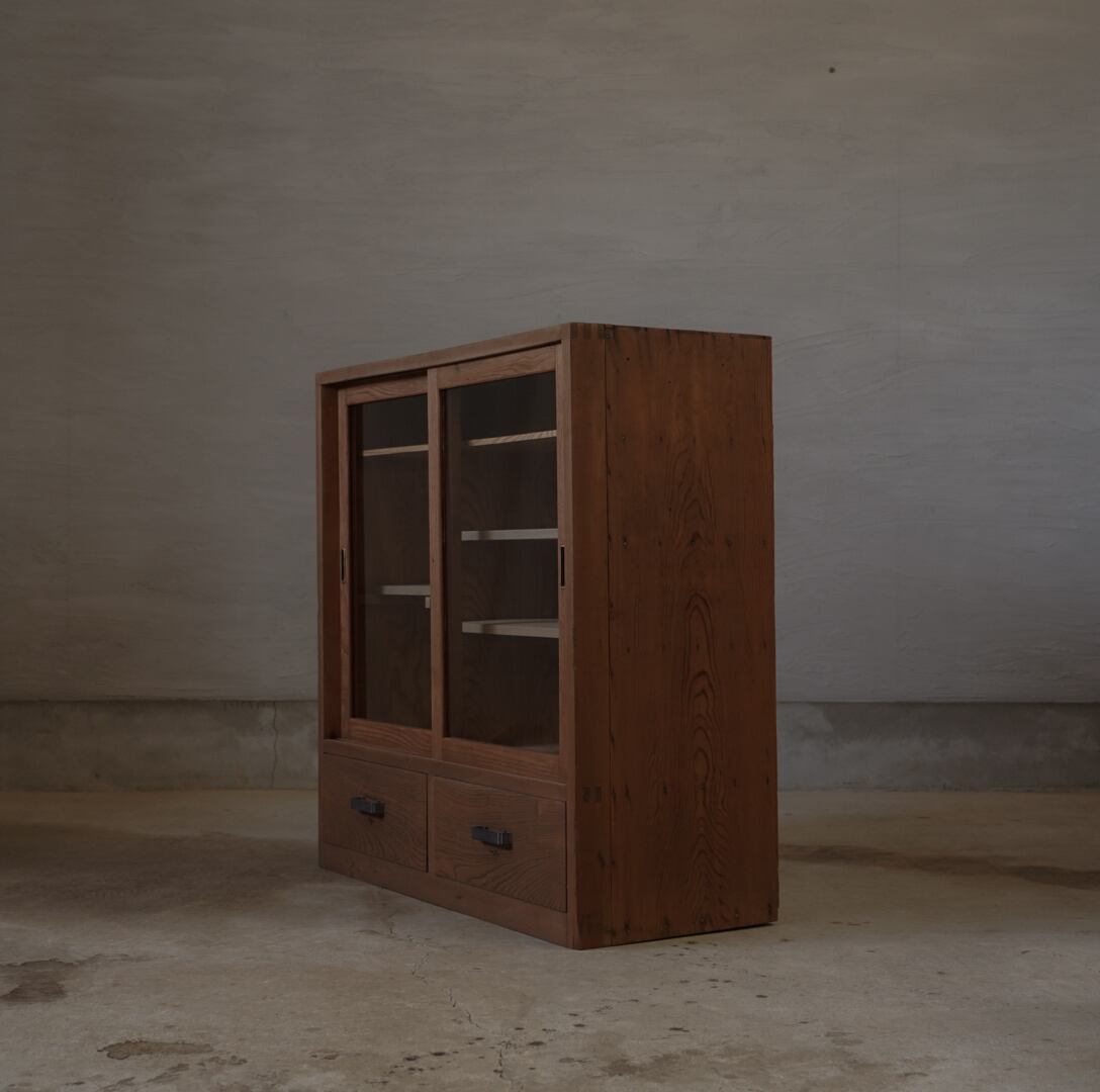 無垢材の温かみのある木味と大きなガラス引き戸が美しいキャビネット。