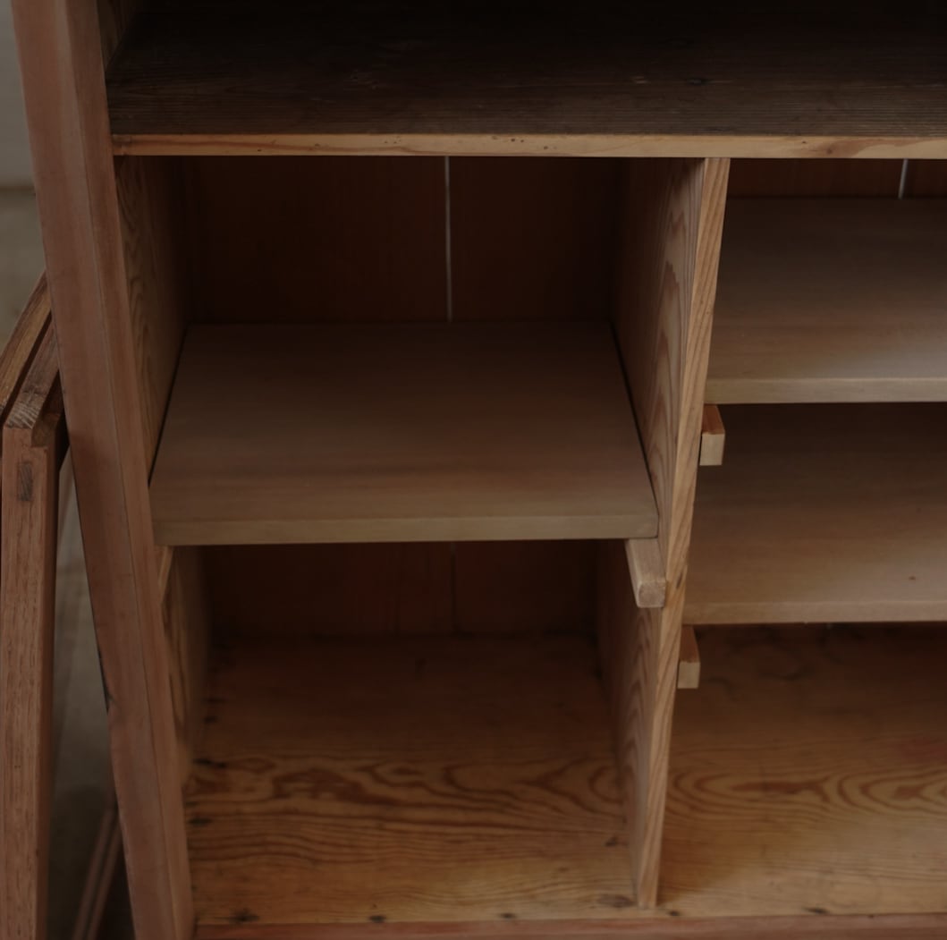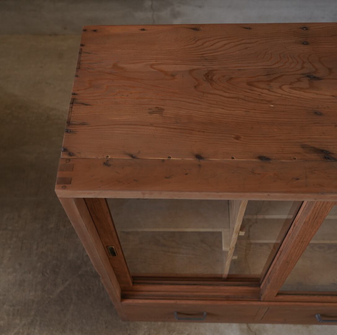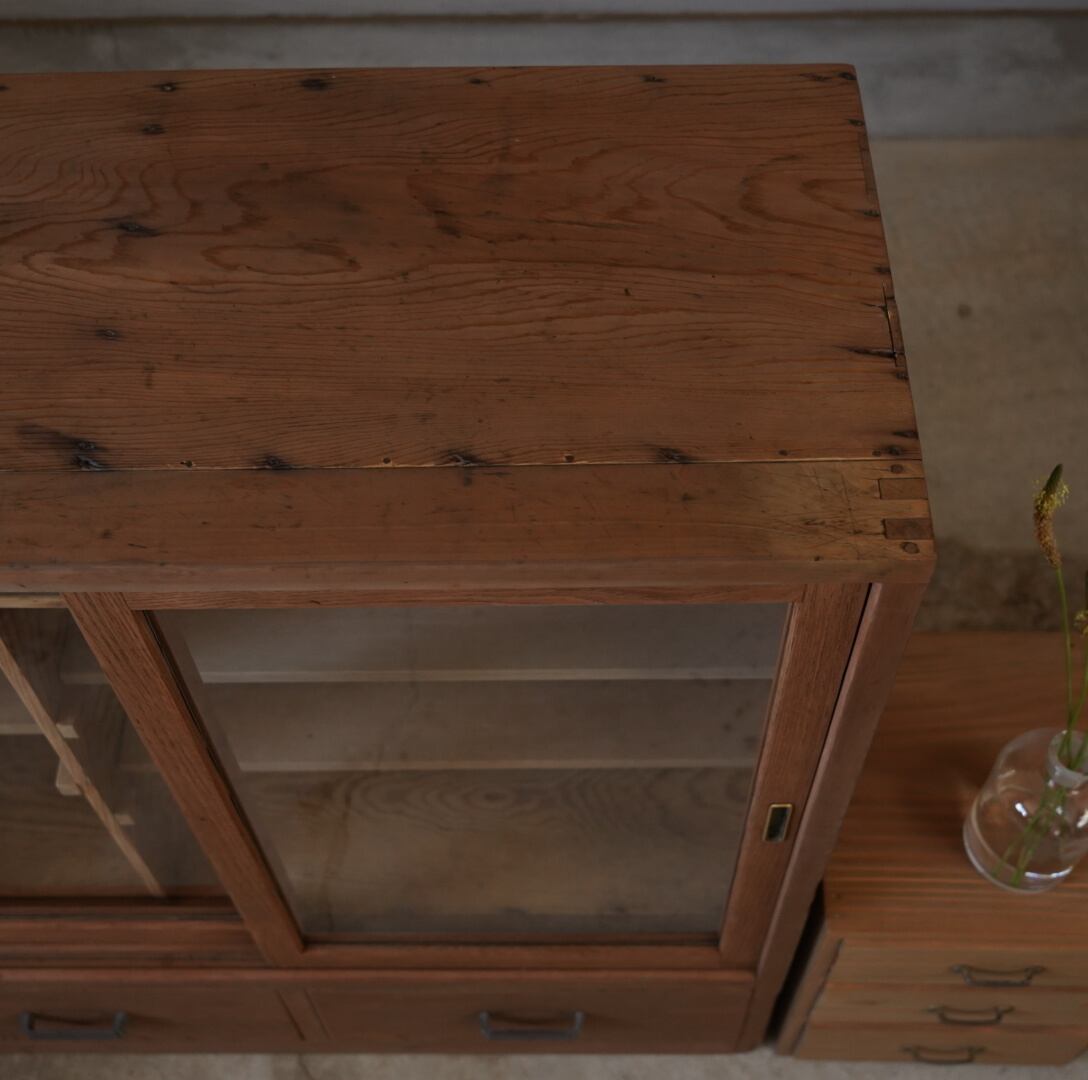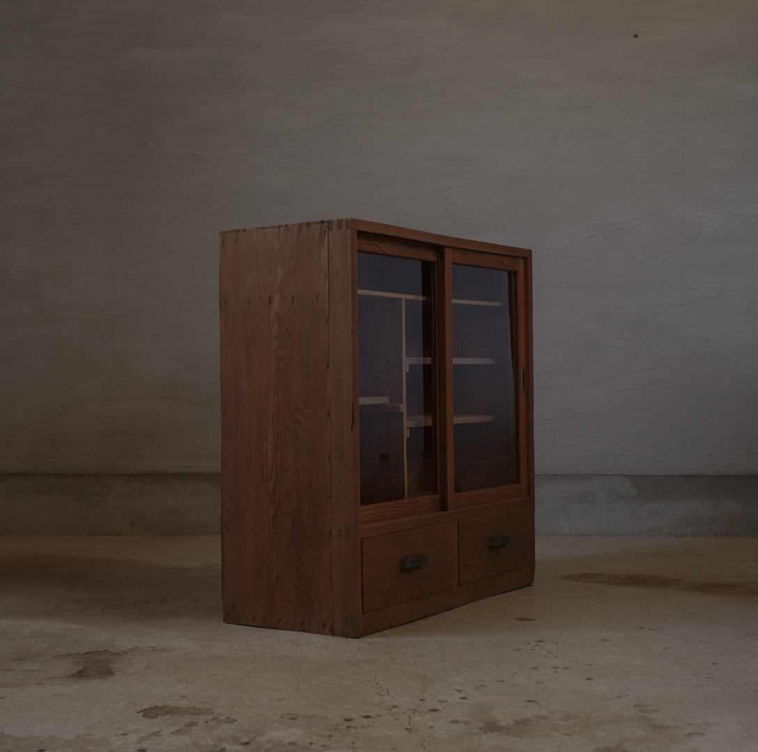 無垢材の温かみのある木味と大きなガラス引き戸が美しいキャビネット。