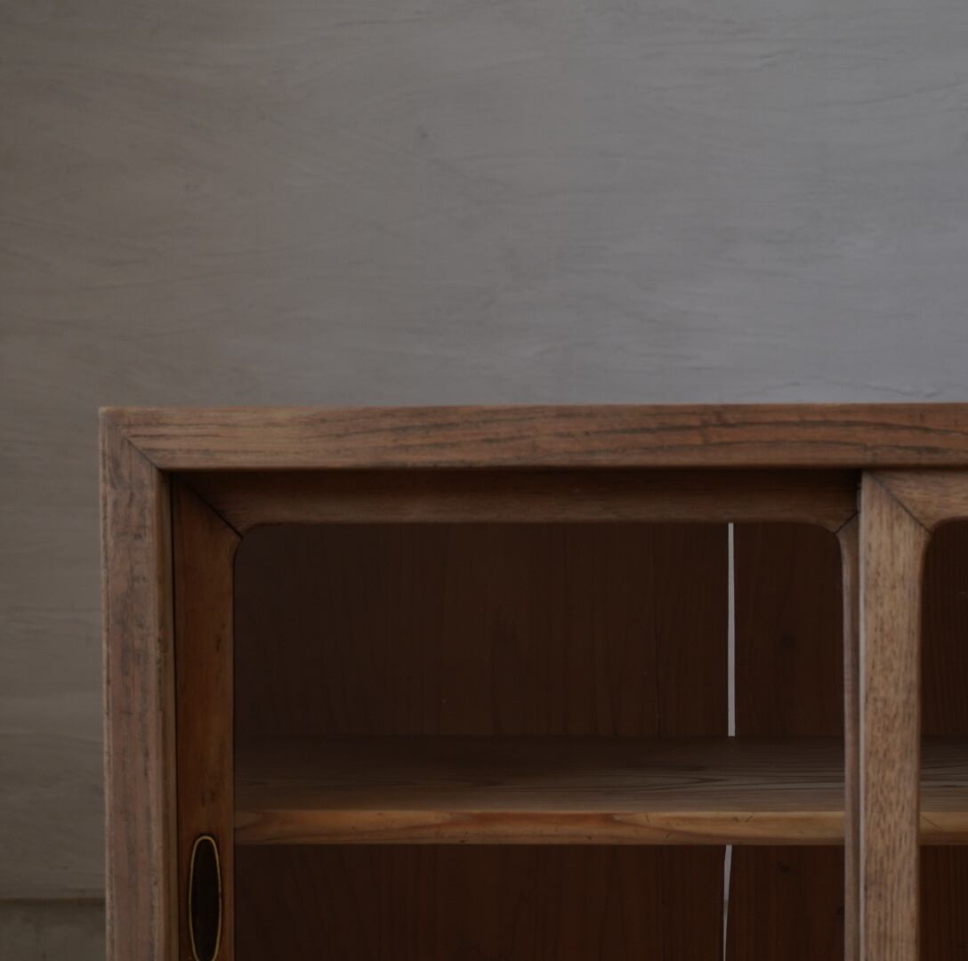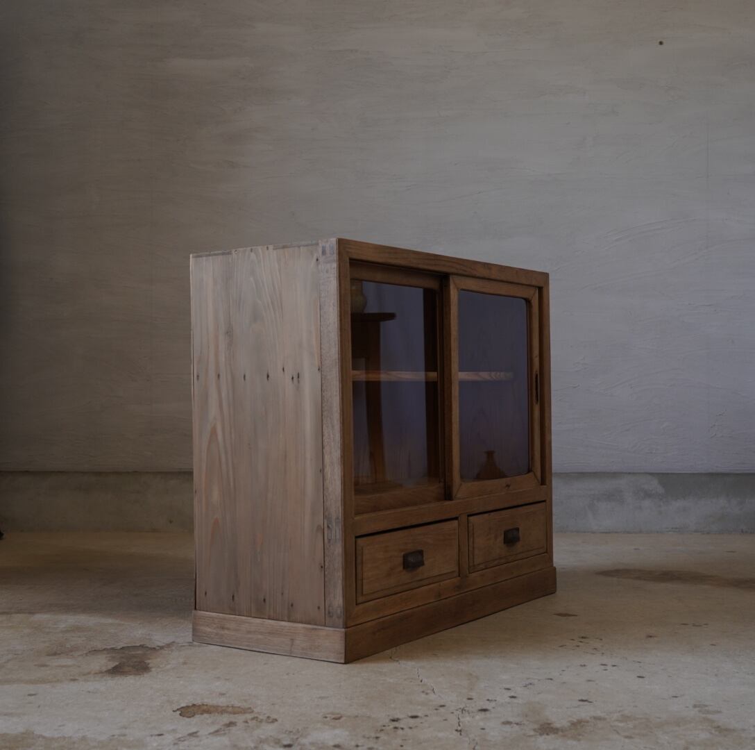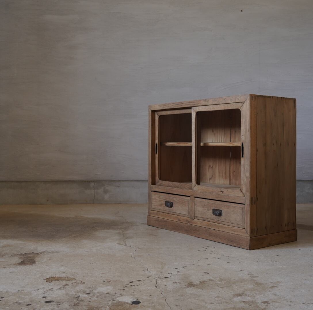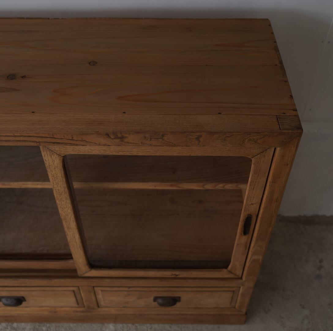 無垢材の温かみのある木味と大きなガラス引き戸が美しいキャビネット。