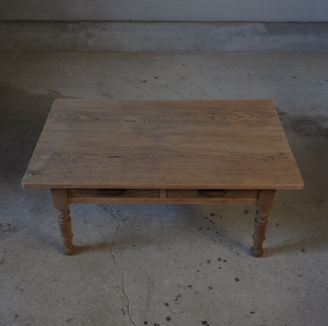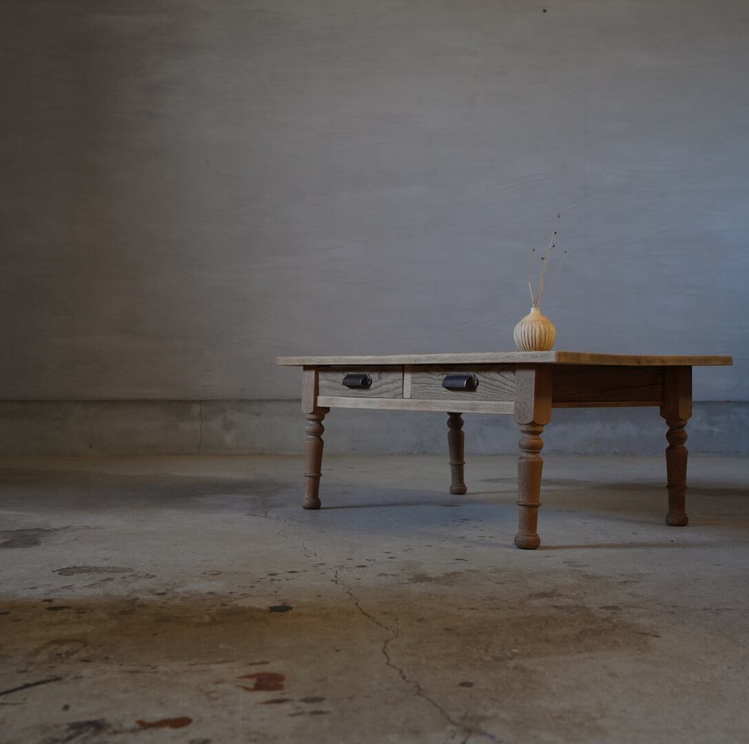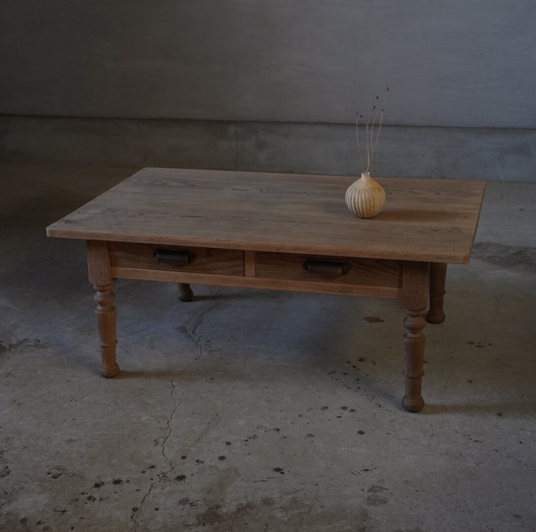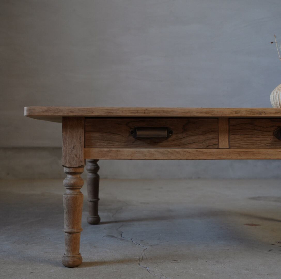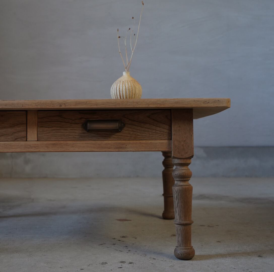 無垢材のナチュラルな木味と脚部の精巧なろくろ飾りが美しいコーヒーテーブル。