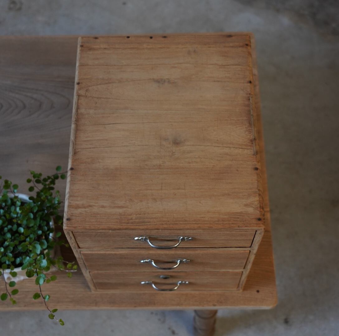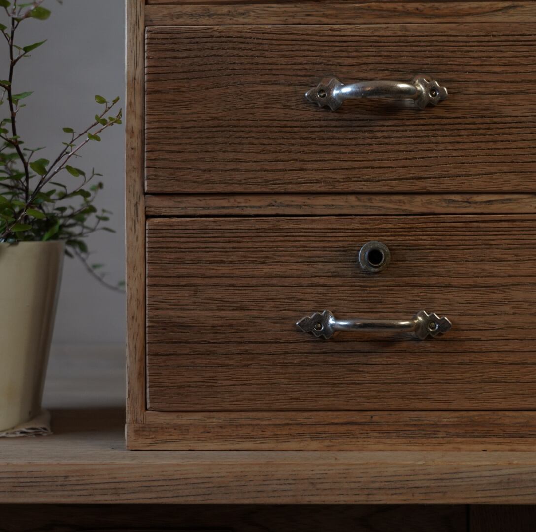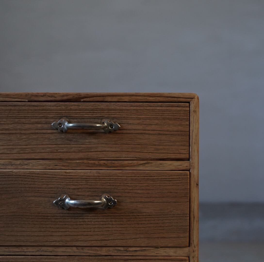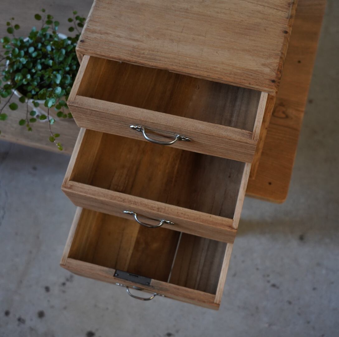 古い無垢材の素朴な風合いと並んだ金属取手が魅力的な3杯の引き出し。