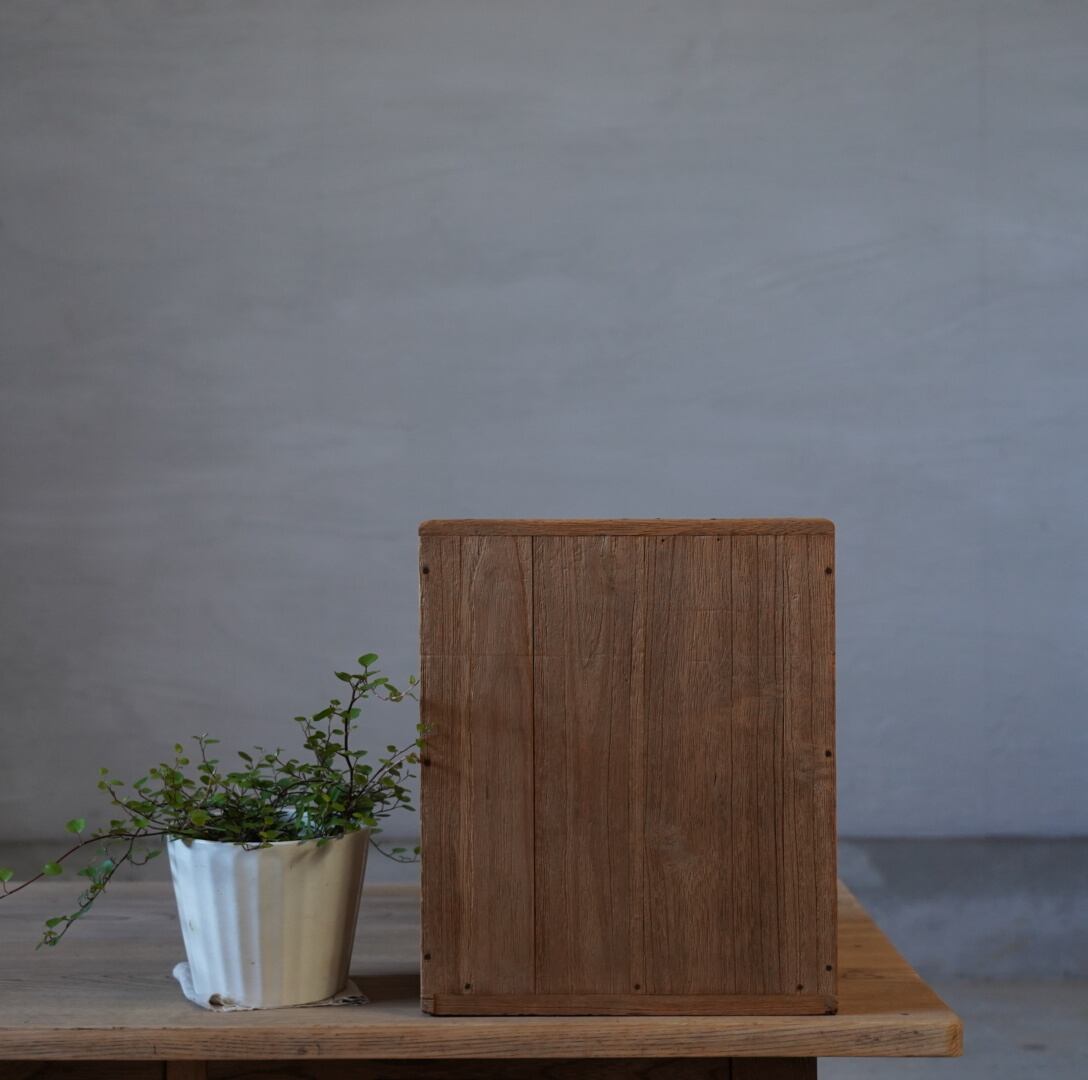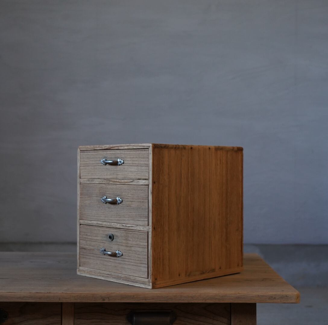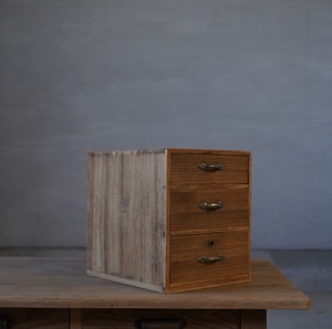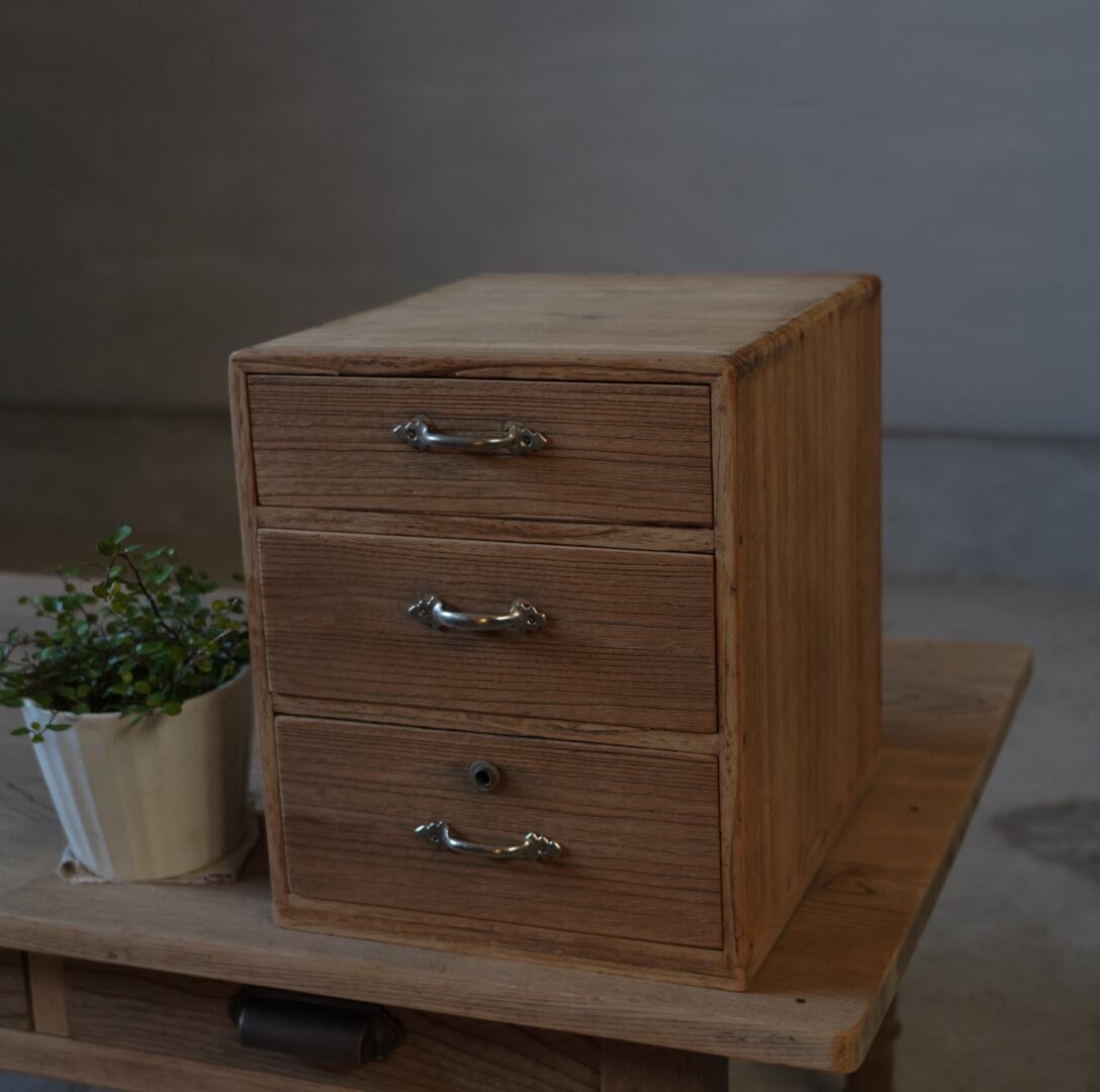 古い無垢材の素朴な風合いと並んだ金属取手が魅力的な3杯の引き出し。