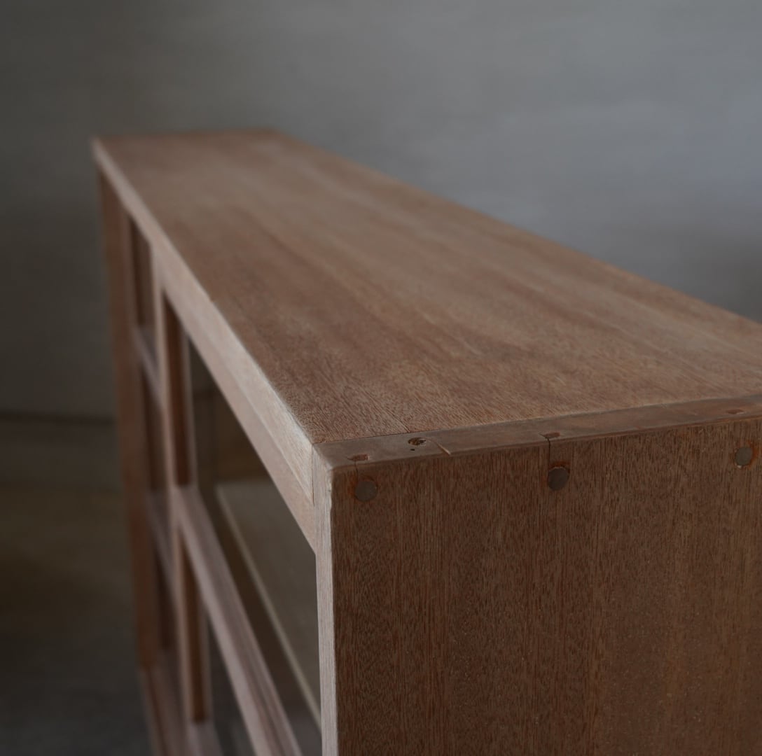 ナチュラルな木味と大きな格子ガラスの引き戸が美しい食器棚。